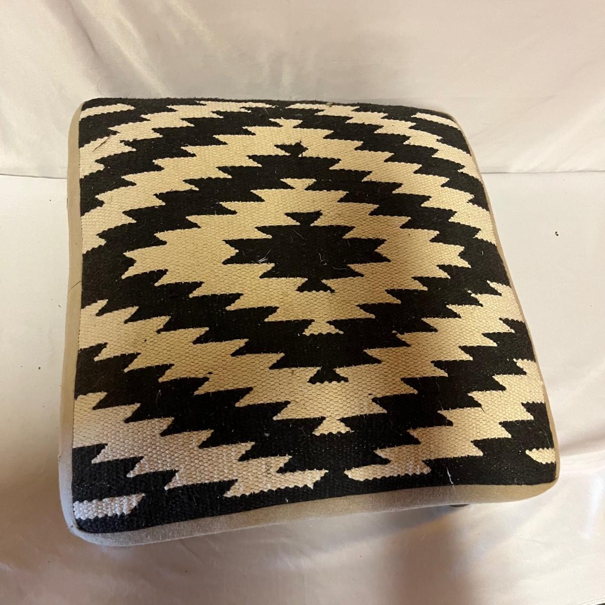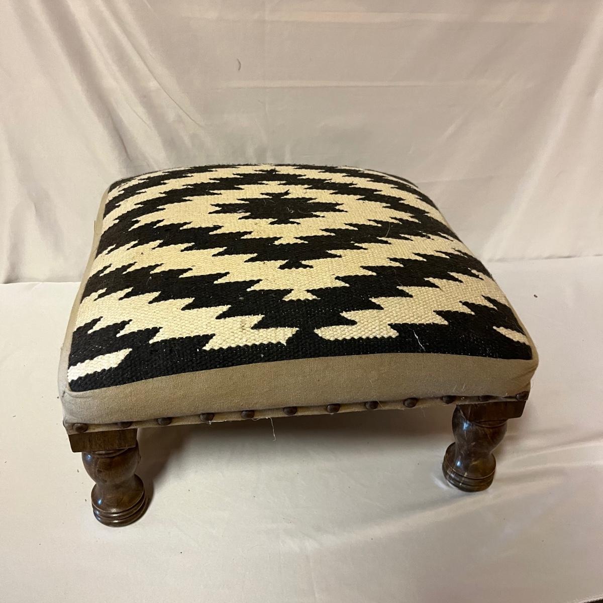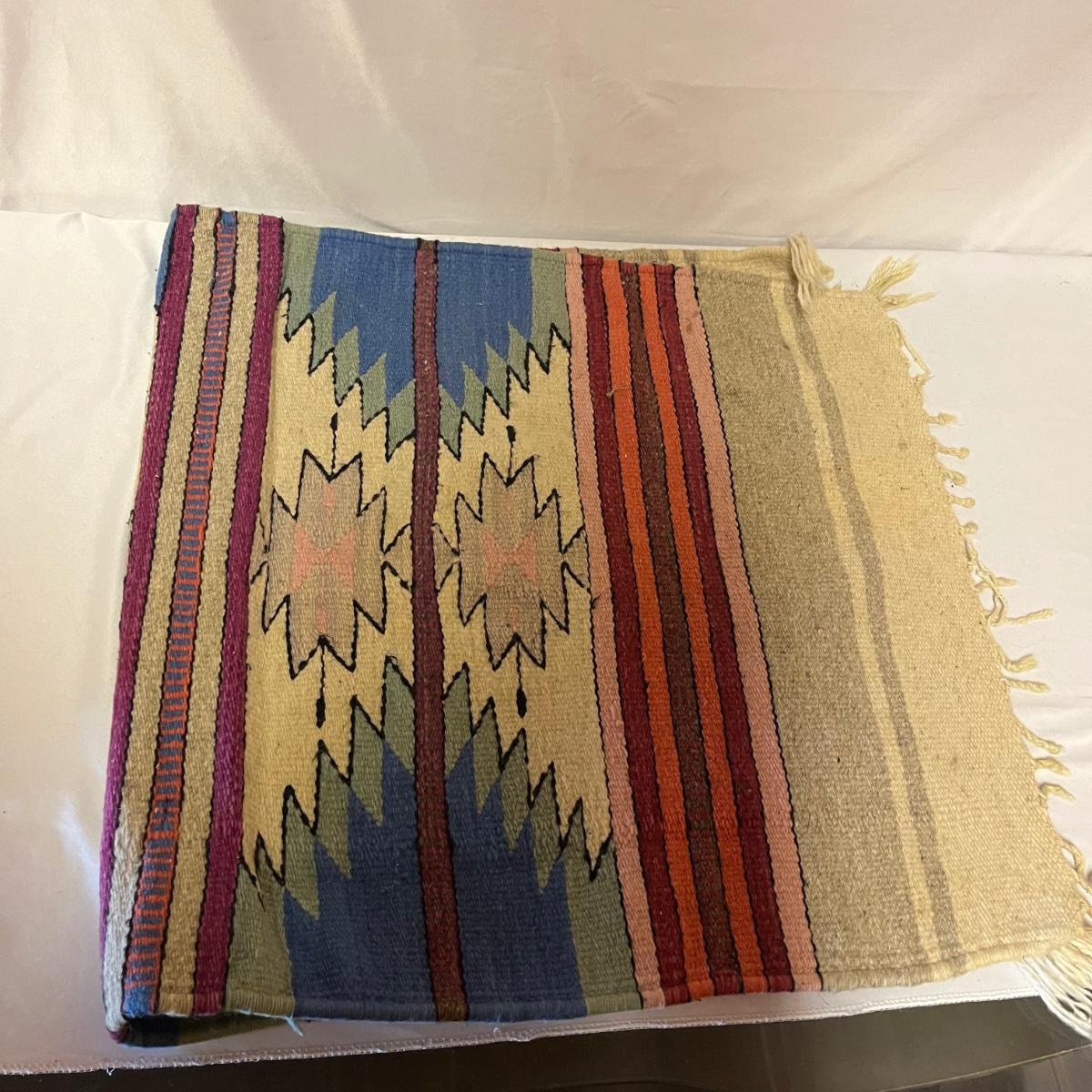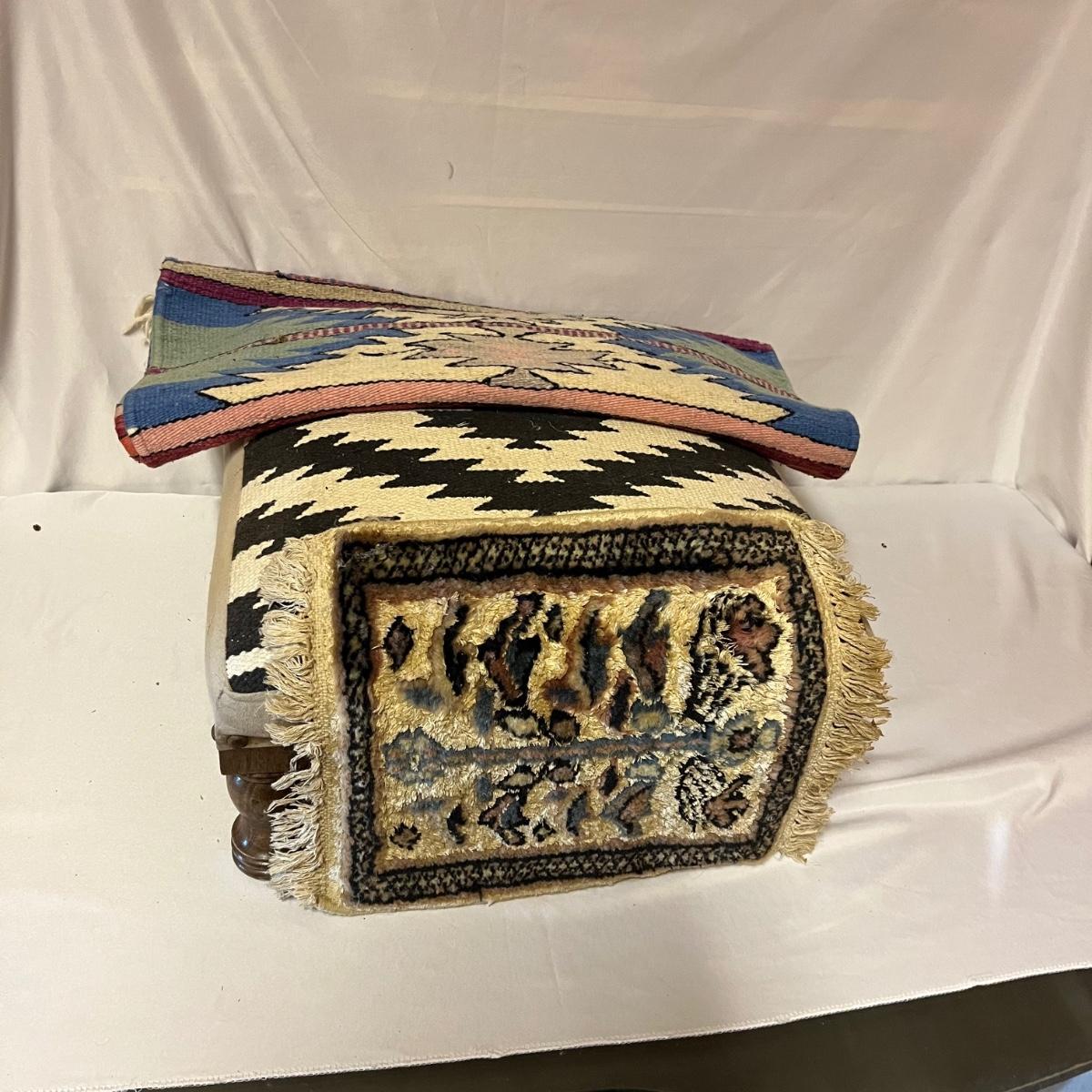 Lot includes a wooden footstool with a padded and upholstered top, a mini rug, and a small decorative colorful woven blanket that measures 21” x 42”. Footstool measures 17” x 17” x 8”.