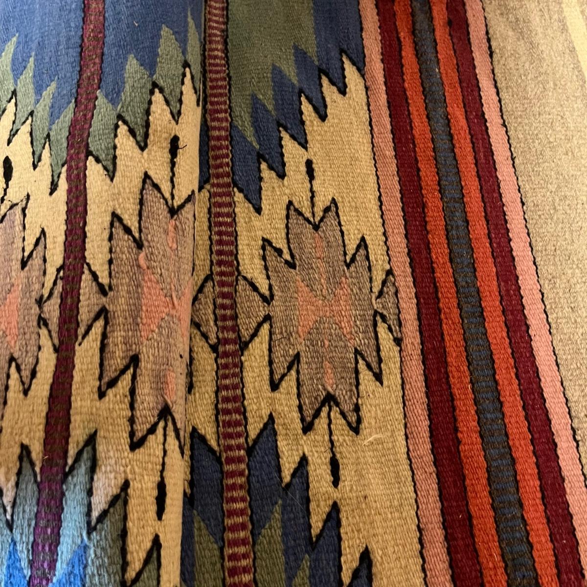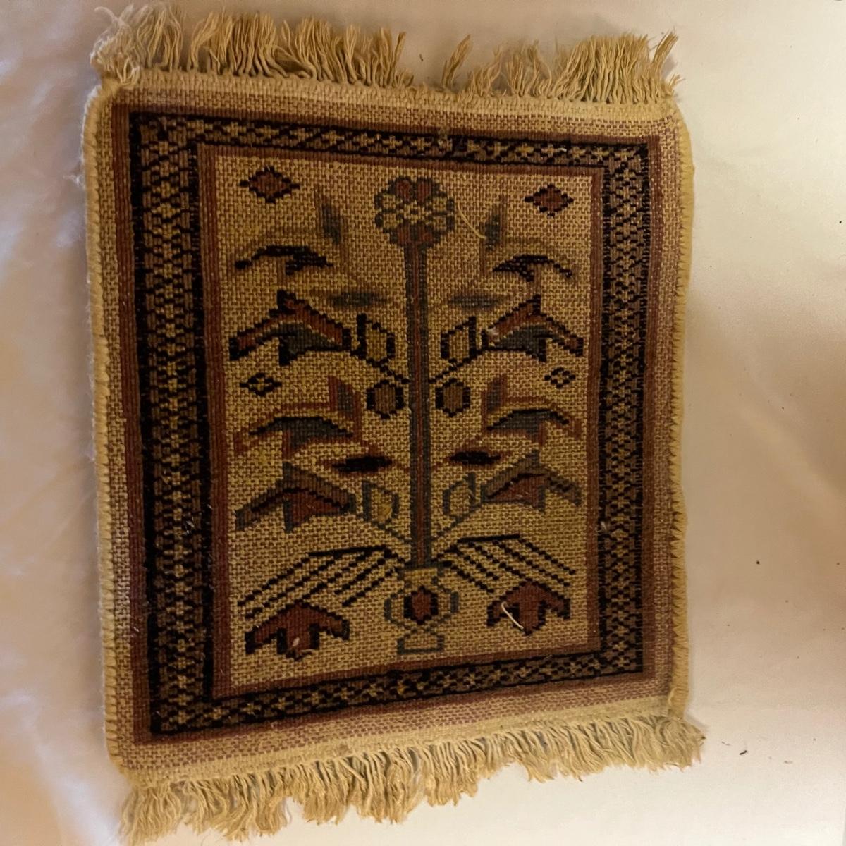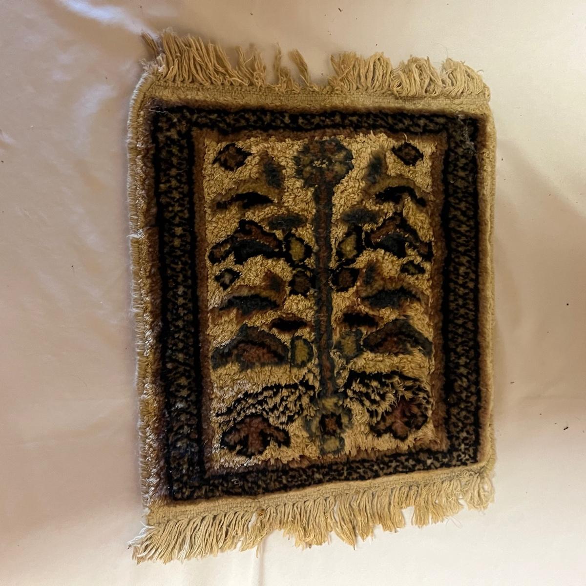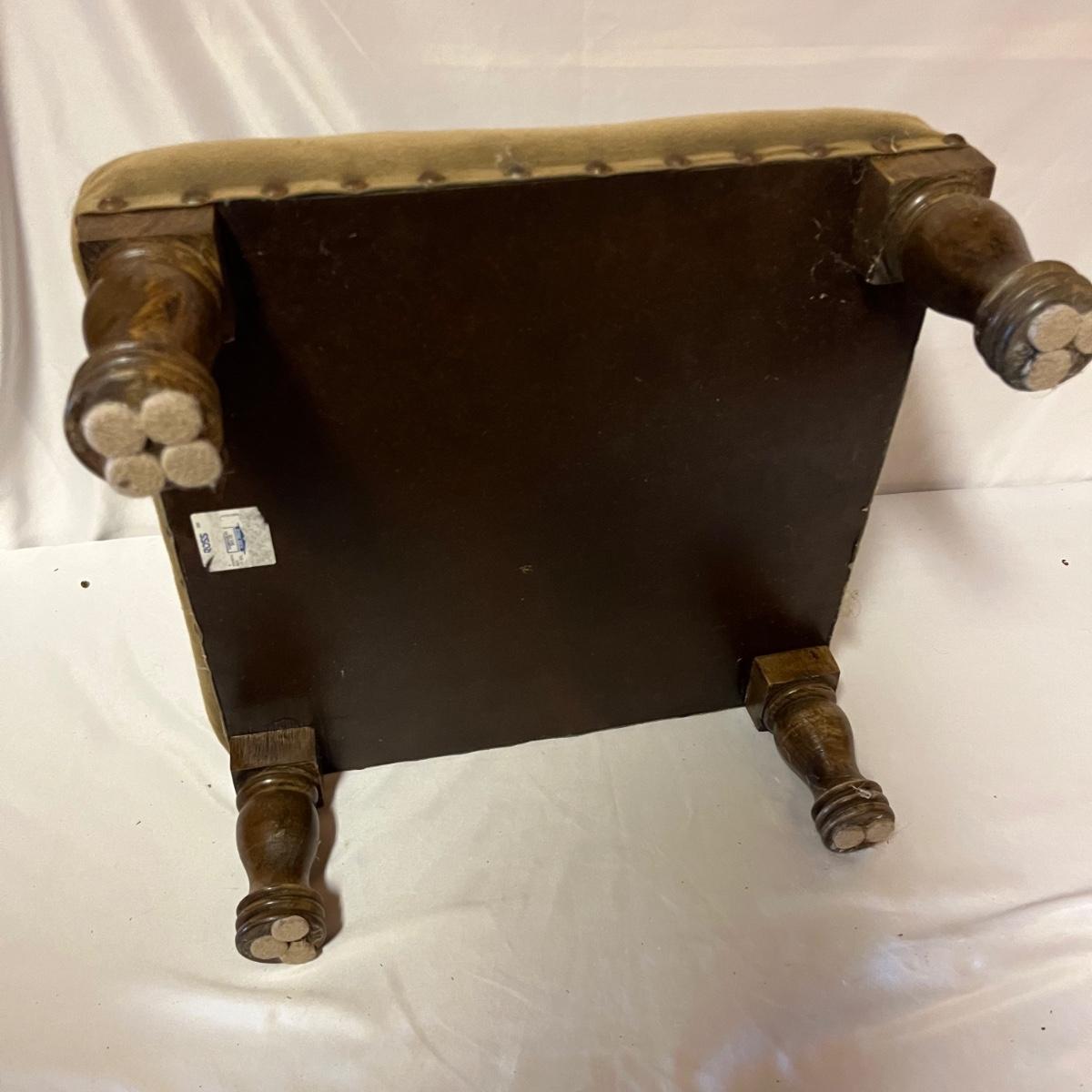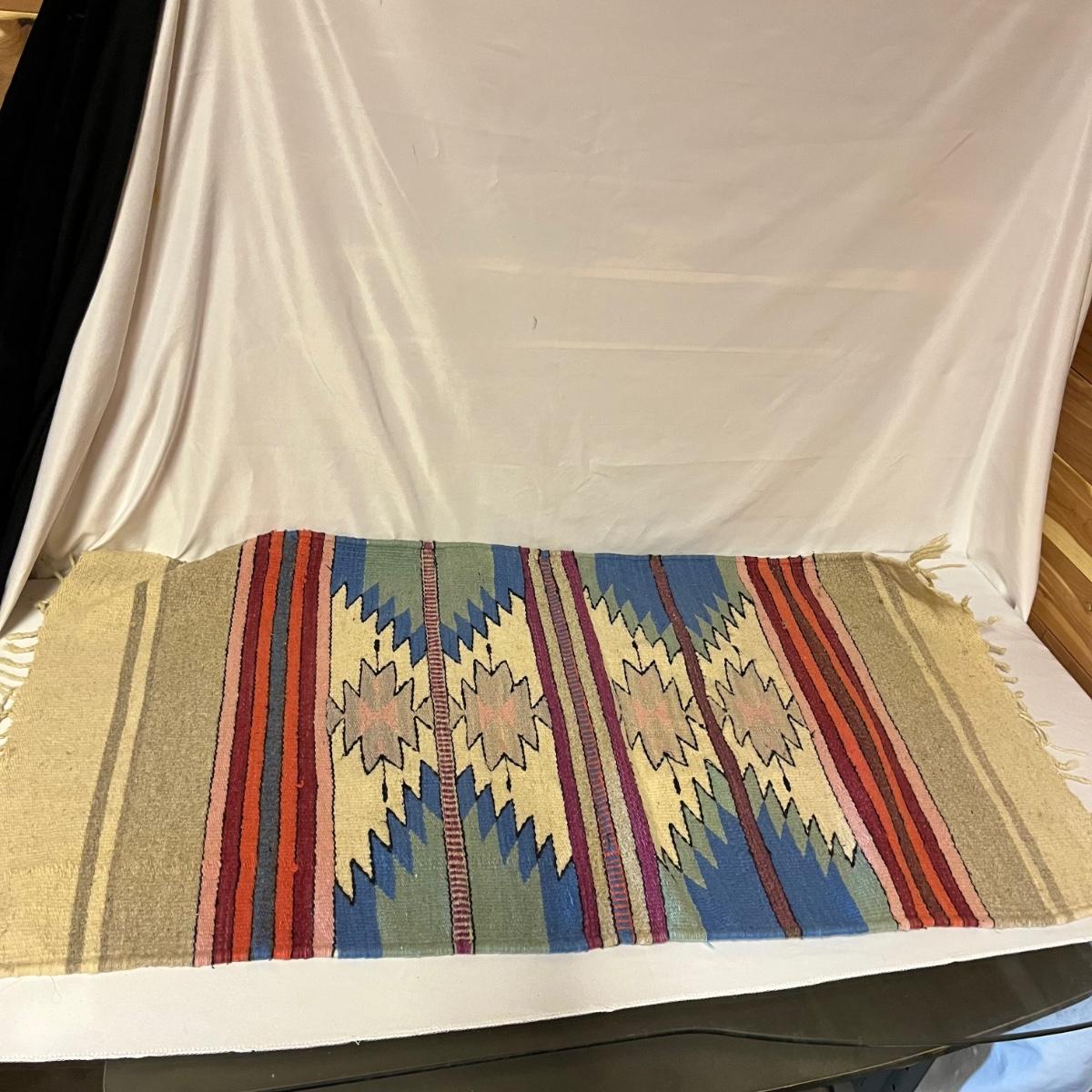 Lot includes a wooden footstool with a padded and upholstered top, a mini rug, and a small decorative colorful woven blanket that measures 21” x 42”. Footstool measures 17” x 17” x 8”.