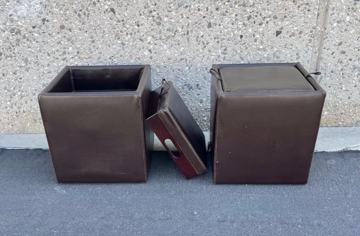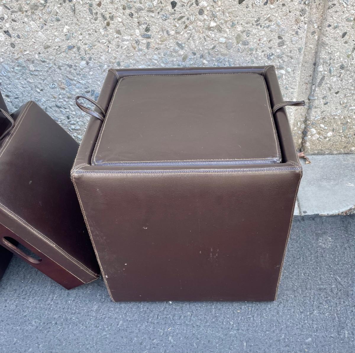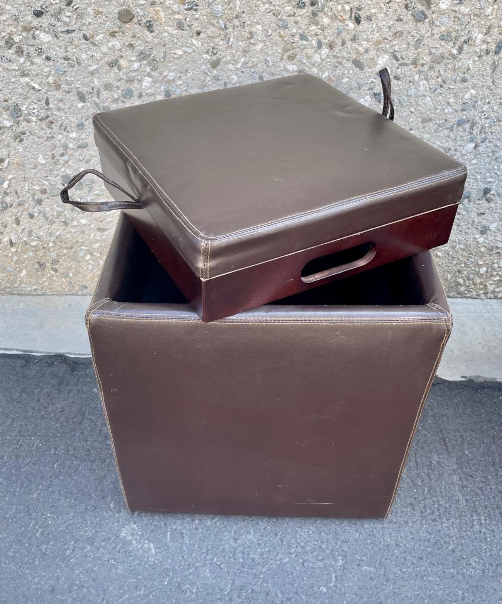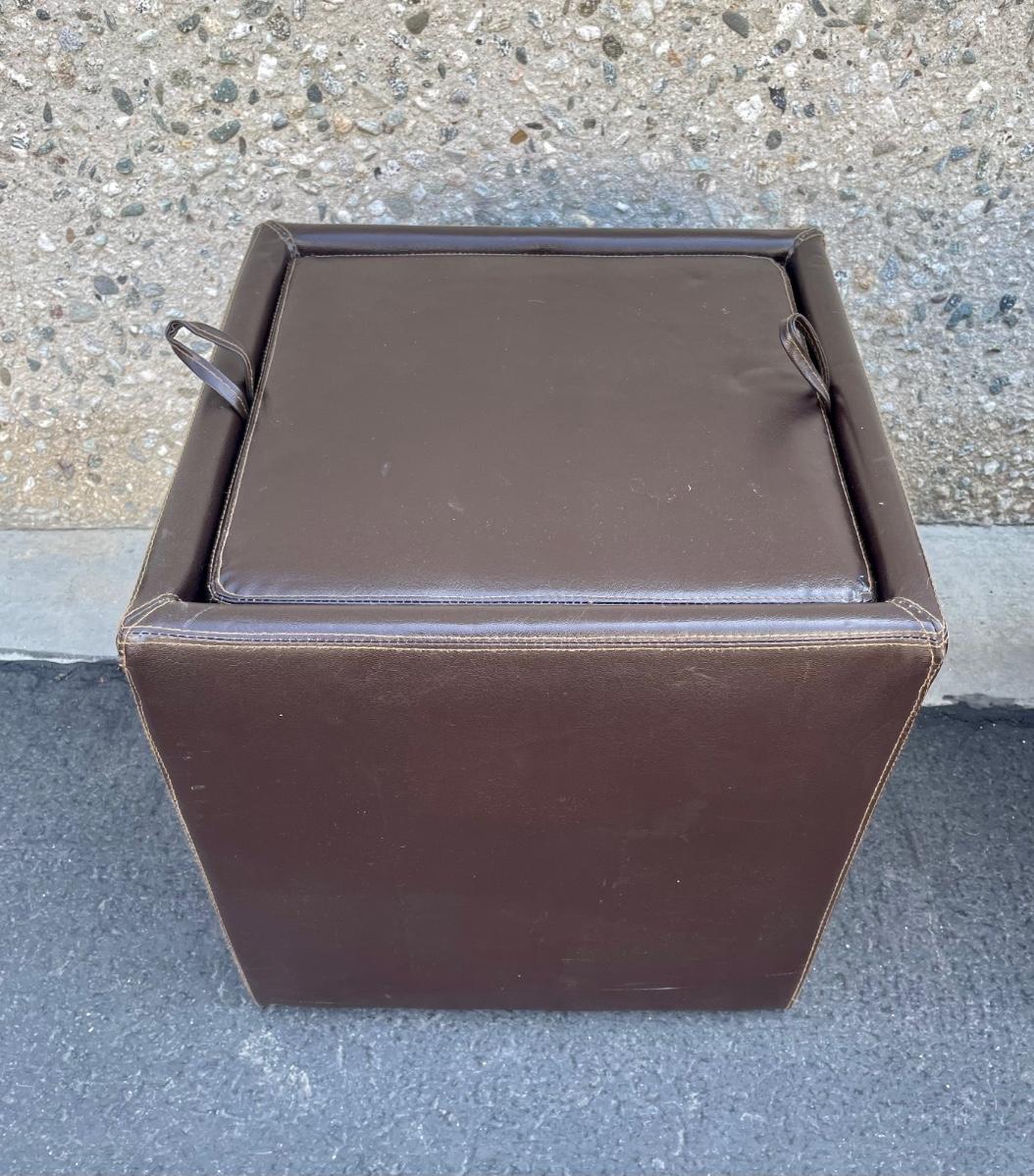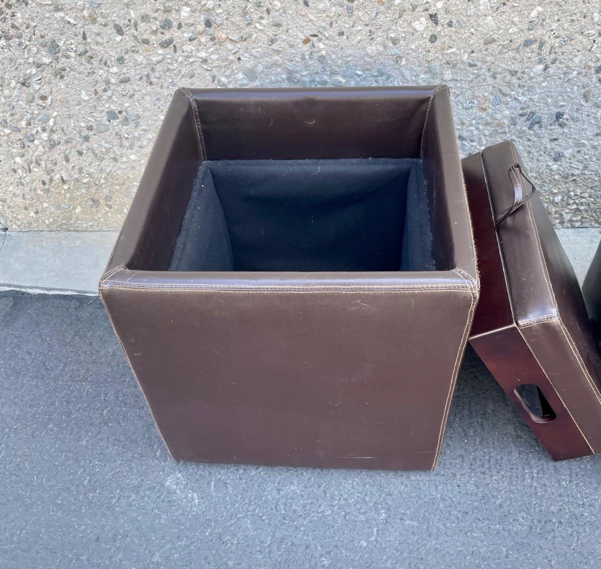 Covered in leather-like dark brown vinyl. Some minor wear marks and scratches, but otherwise in good condition. Measures approx 18” x 18” x 18”.