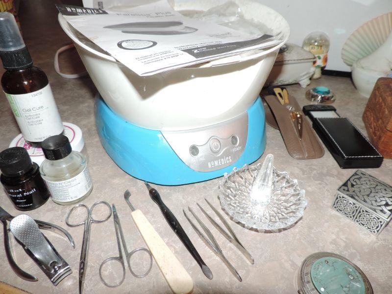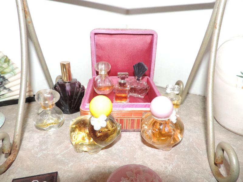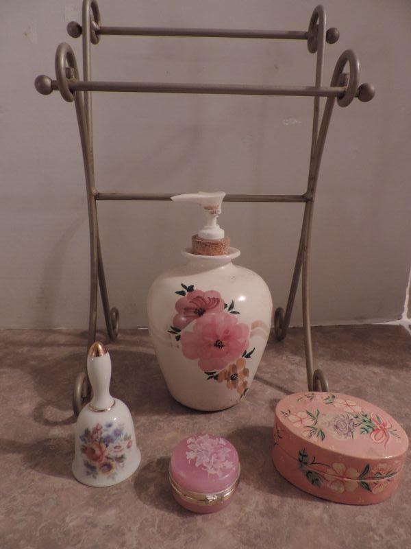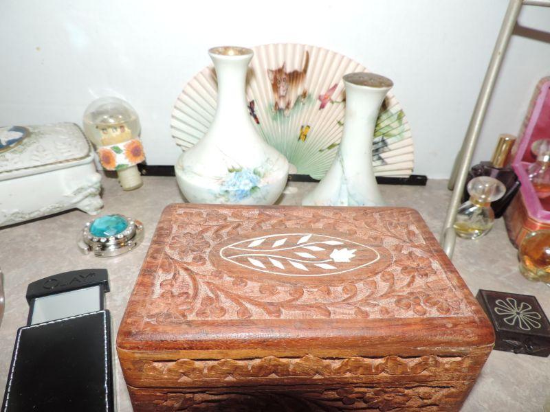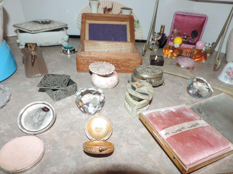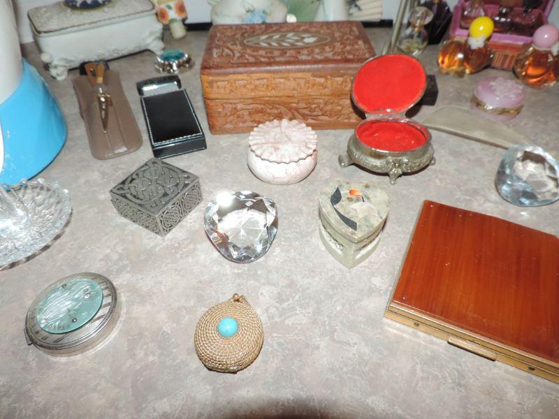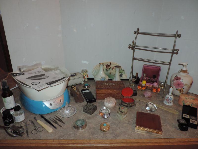 MANY TRINKET/PILL BOXES, WAX TREATMENT, SMALL PURFUME BOTTLES, GEL NAILS, HAND TOWEL HOLDER, VINTAGE POWDER COMPACT AND MORE
