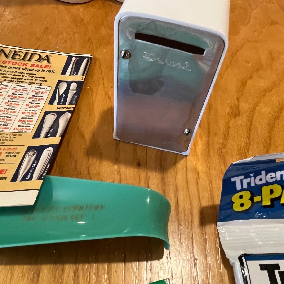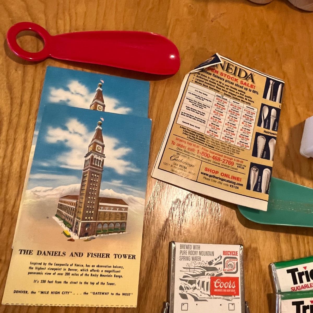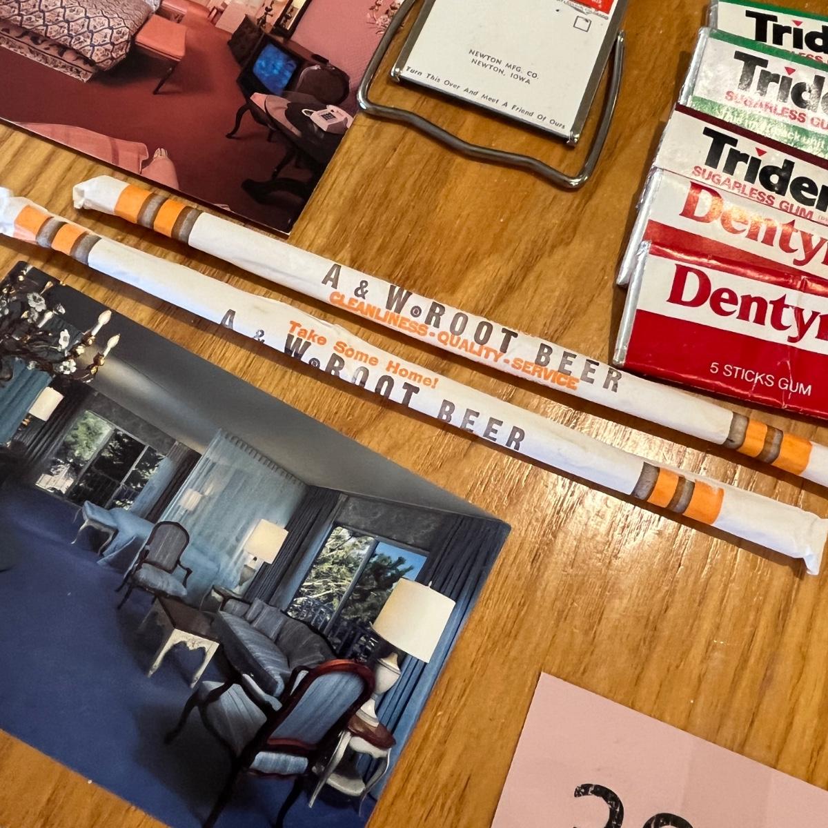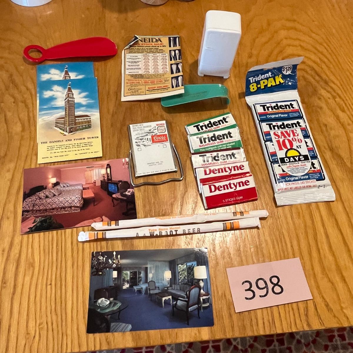 Vintage post cards, gum, straws, & a refrigerator bank.