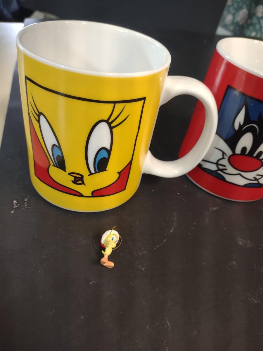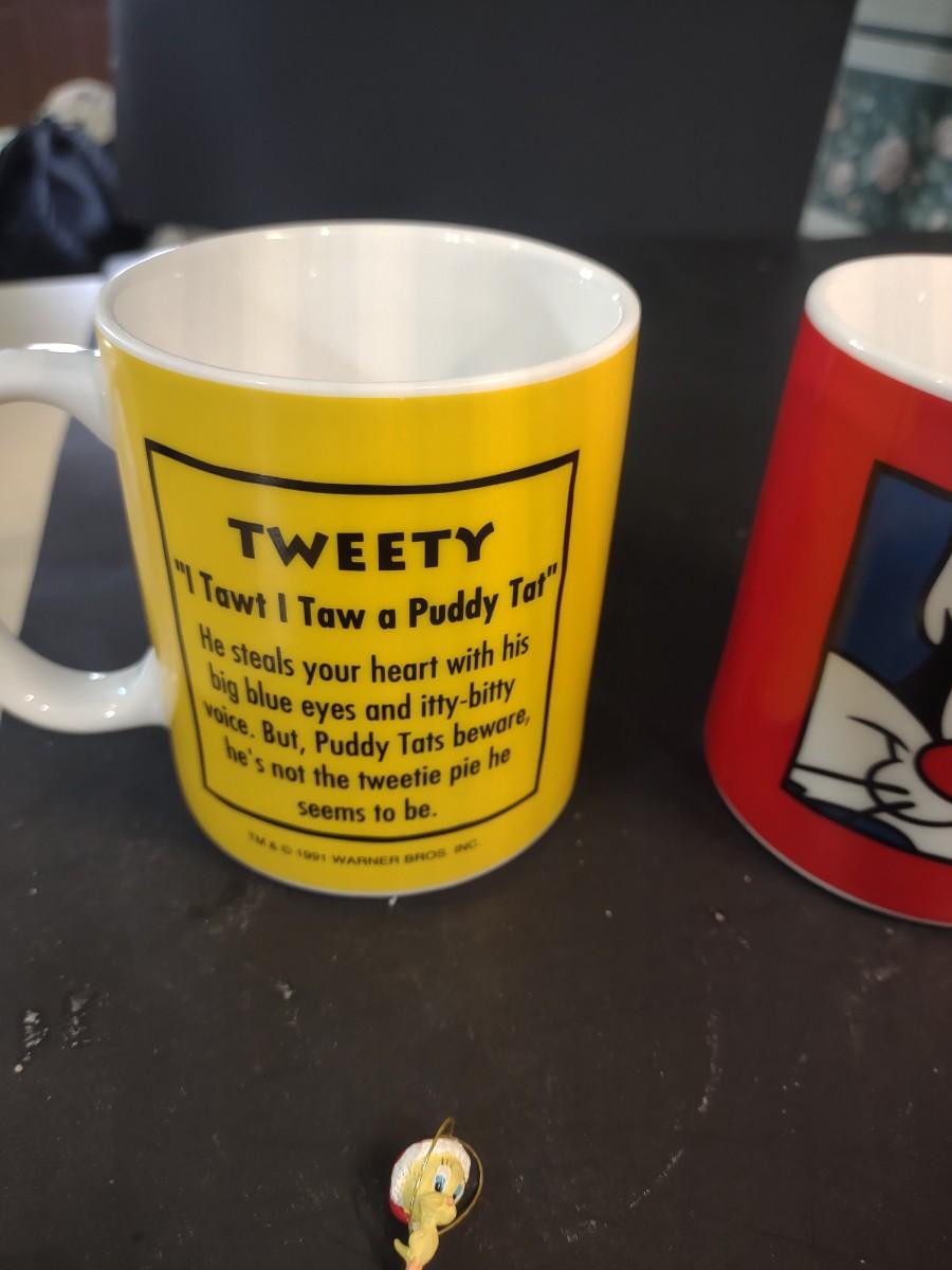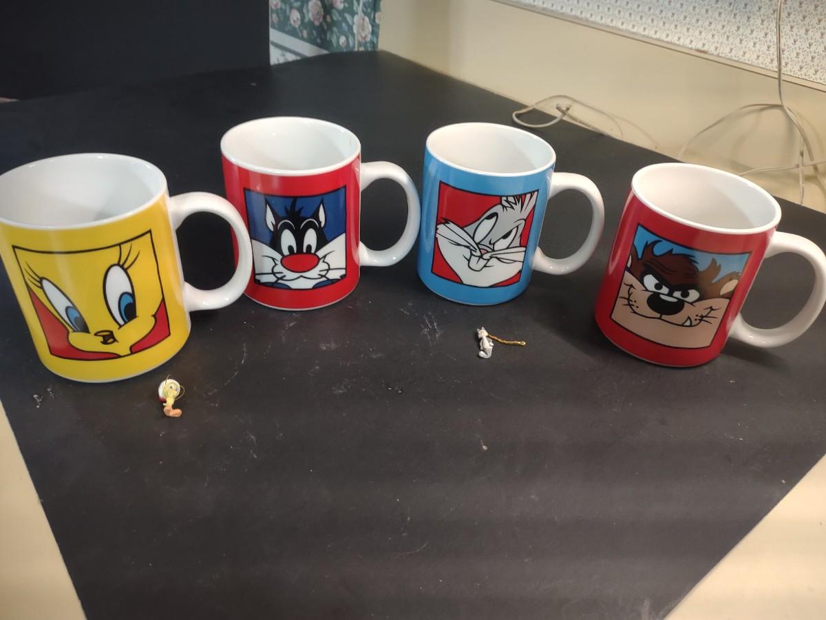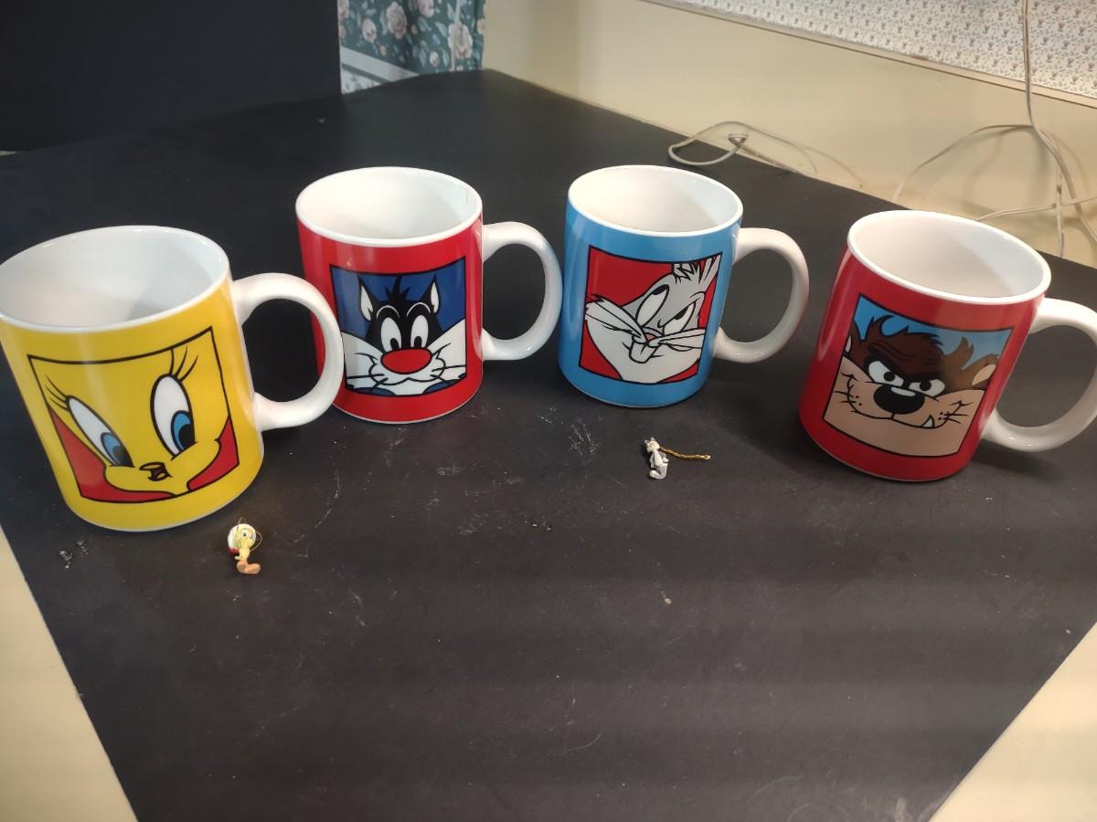 FOUR LOONEY TUNES MUGS AND A MINI TWEETY BIRD AND BUGS BUNNY ORNAMENTS