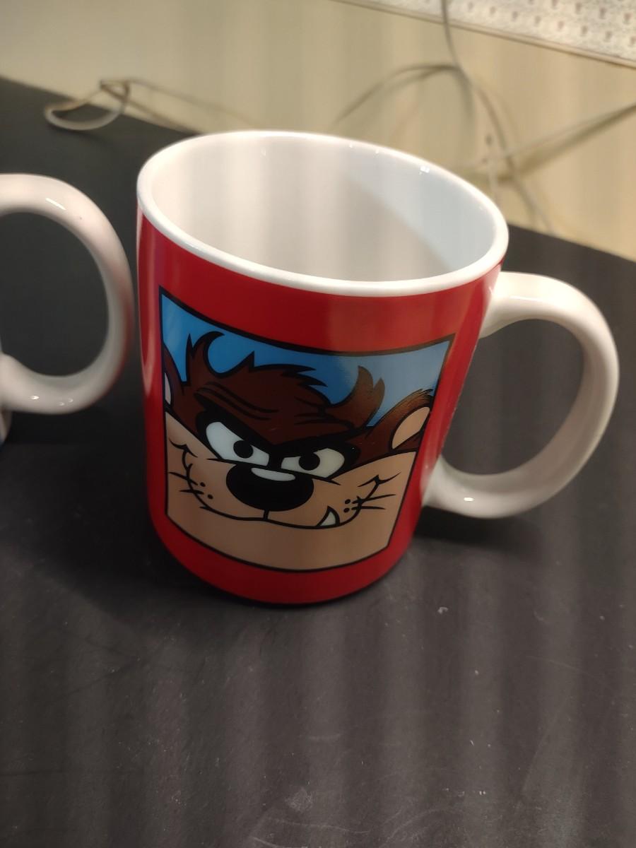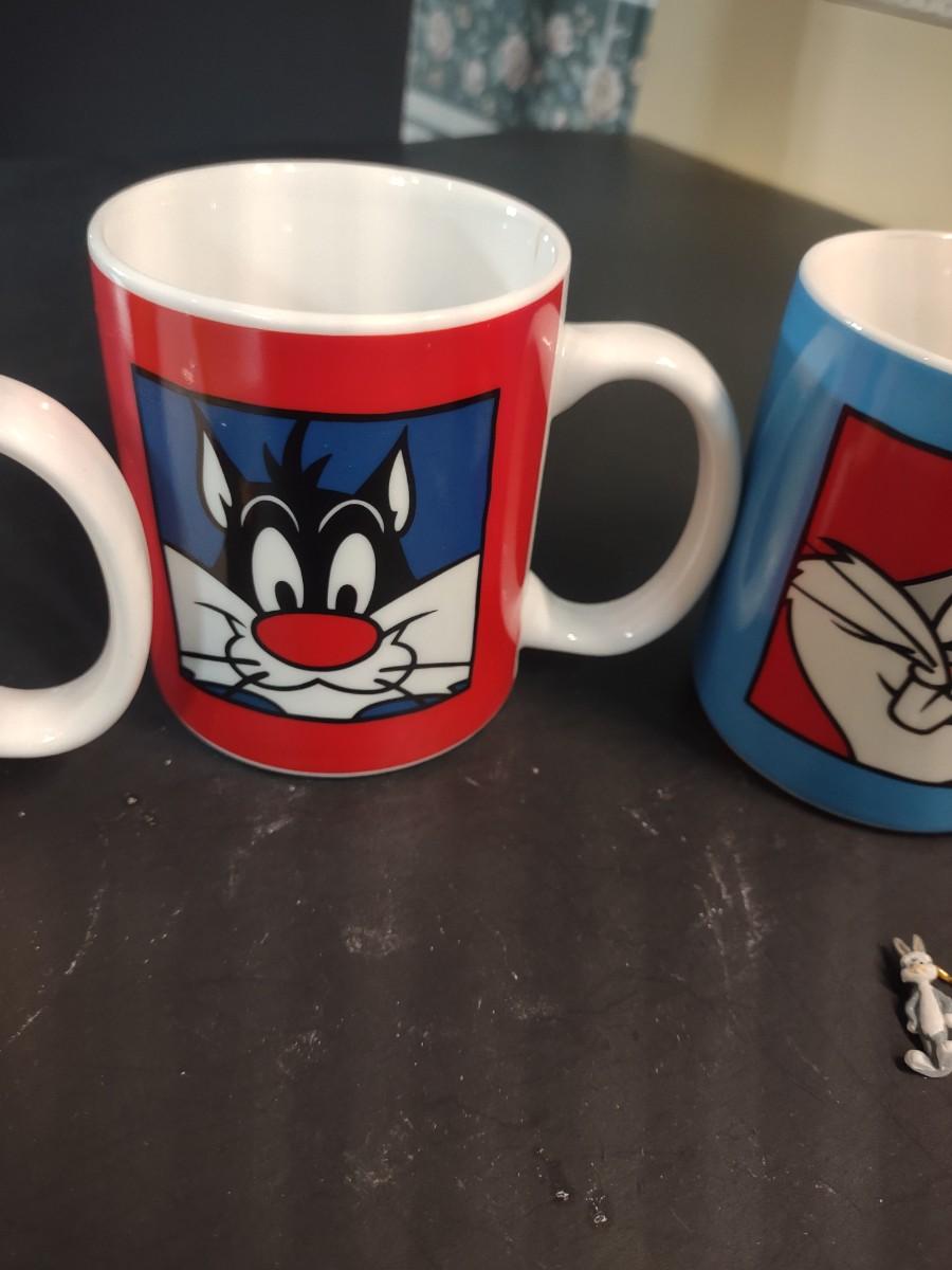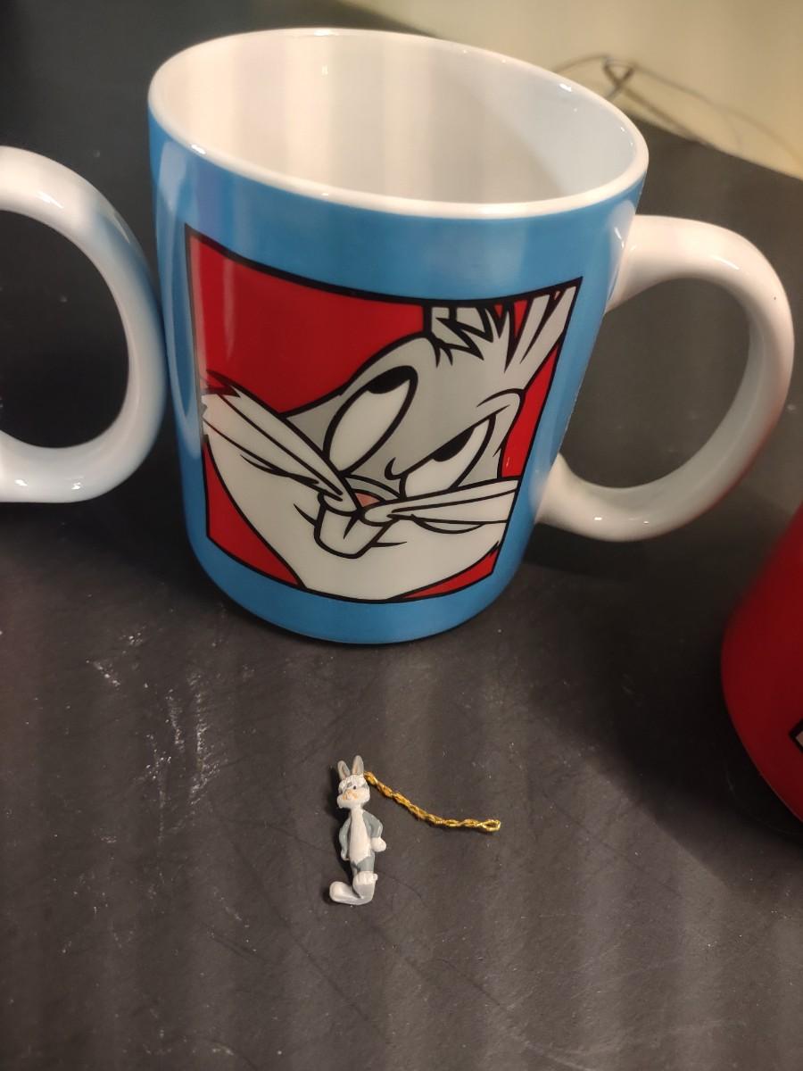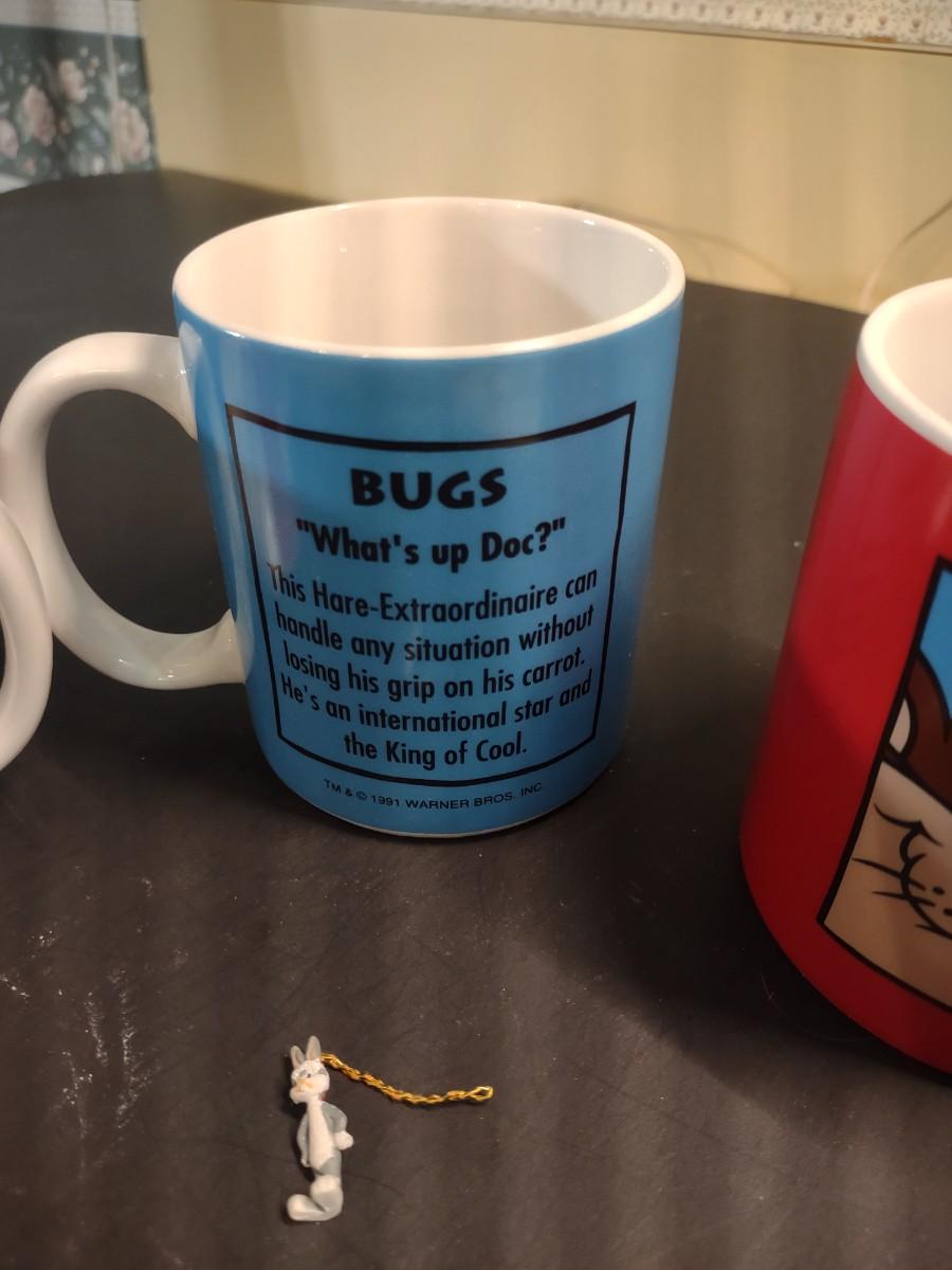 FOUR LOONEY TUNES MUGS AND A MINI TWEETY BIRD AND BUGS BUNNY ORNAMENTS