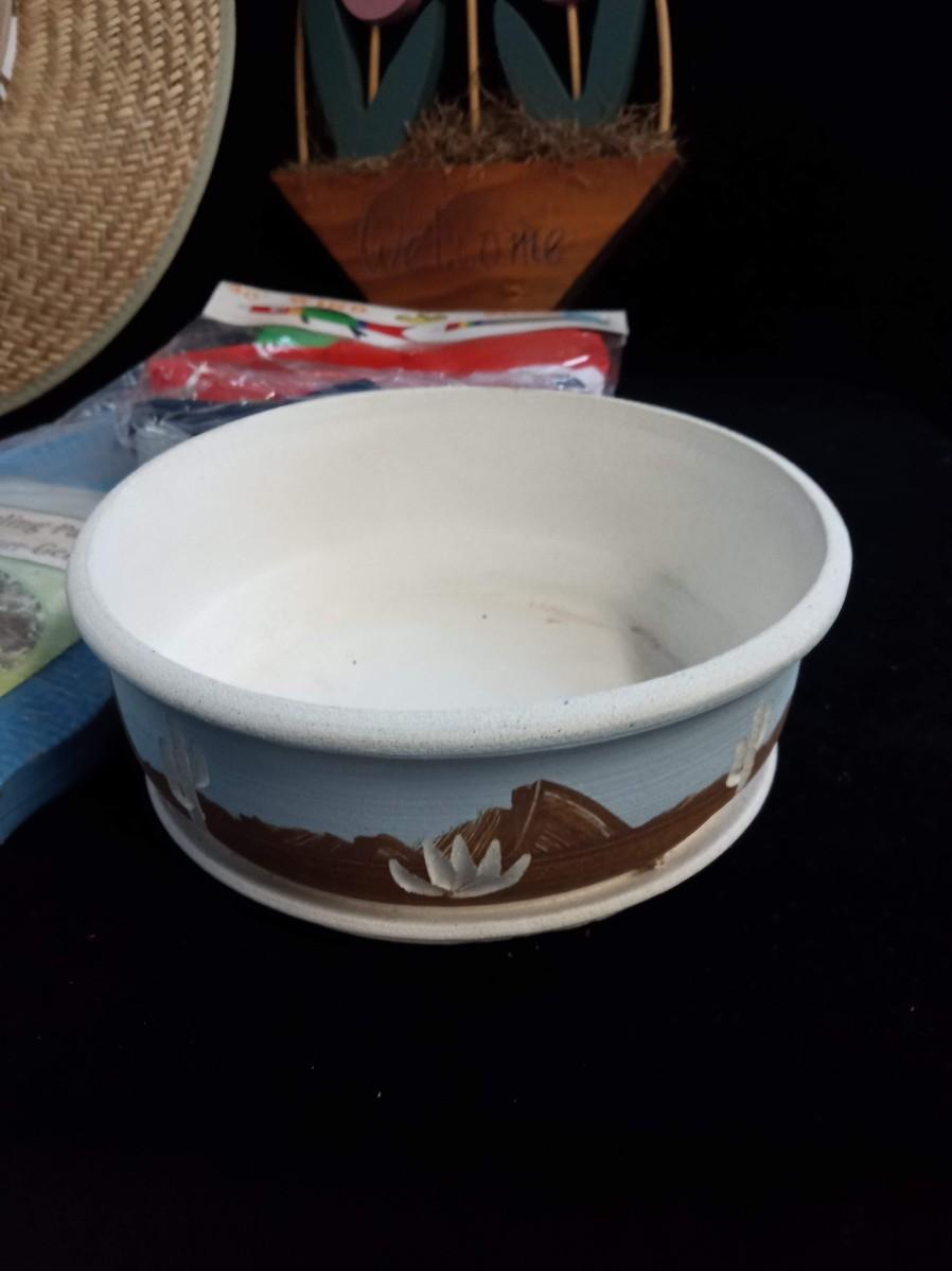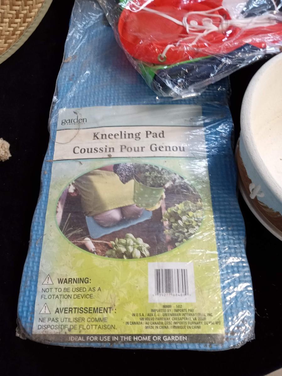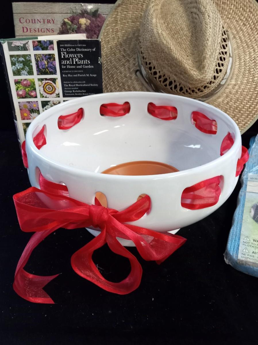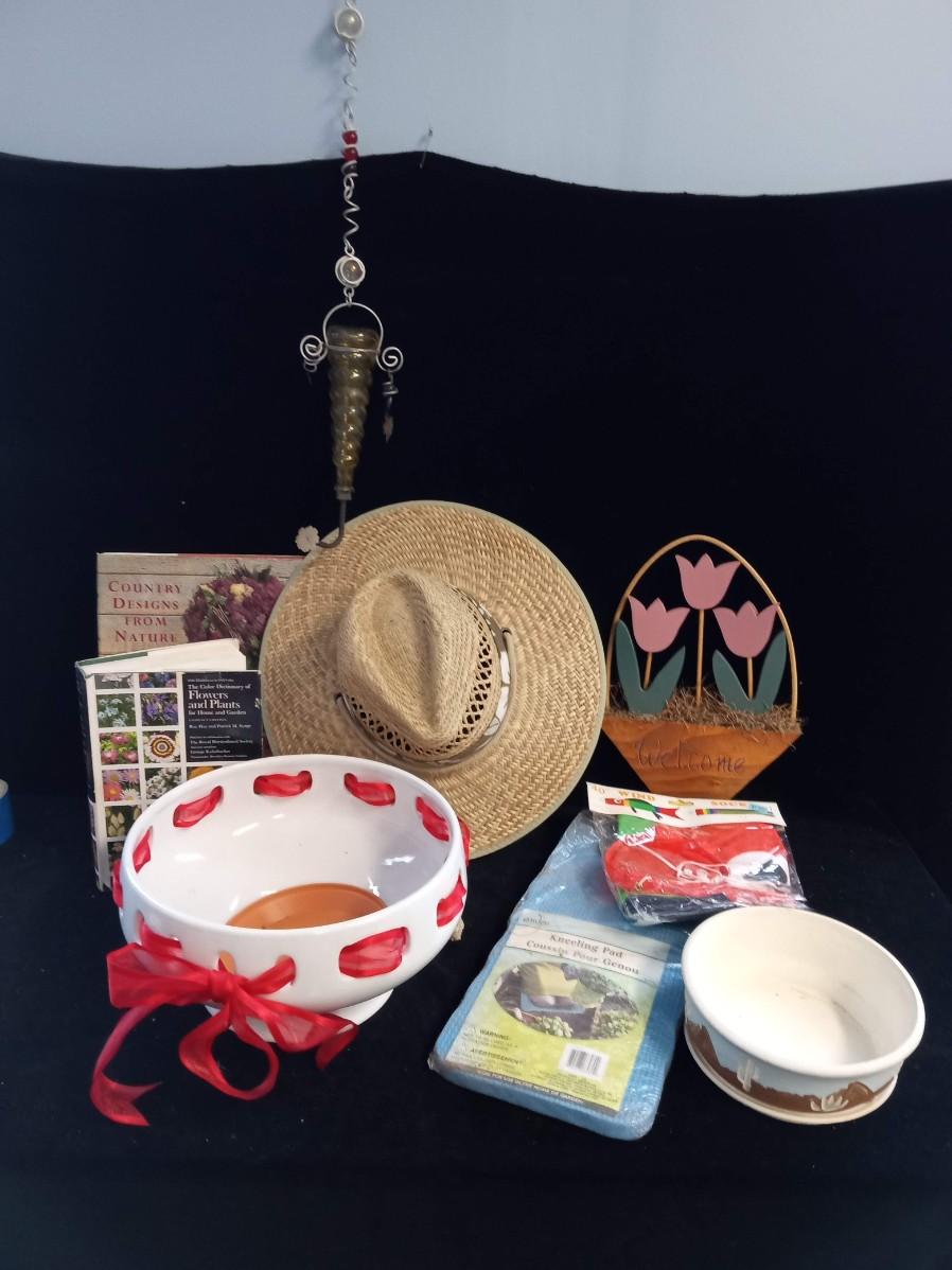 FLOWER POTS, BOOKS ON GARDENING, KNEEL PAD, WINDSOCK, WOODEN WALL-HUNG FLORAL DECOR AND SUN HAT SIZE LARGE