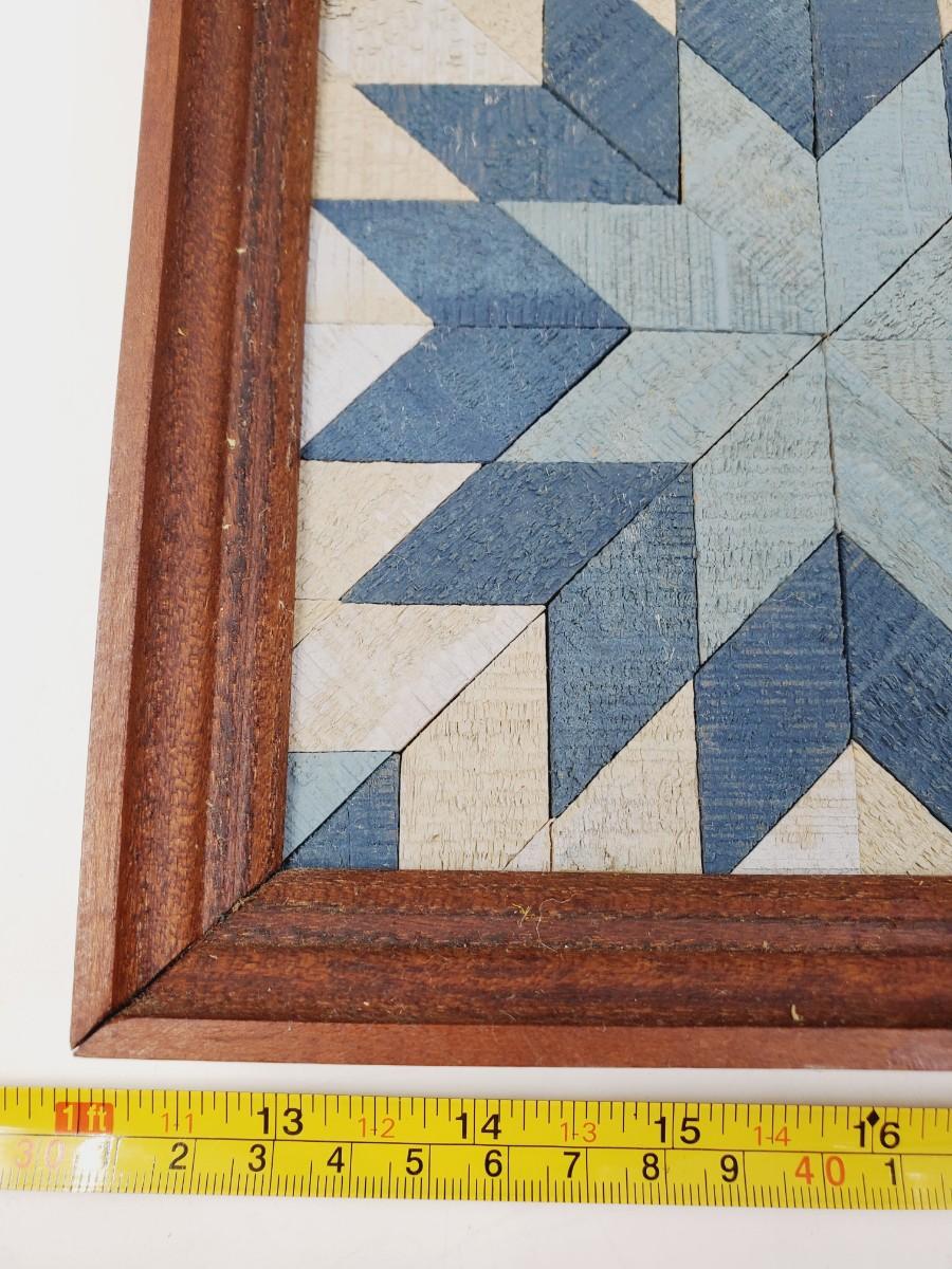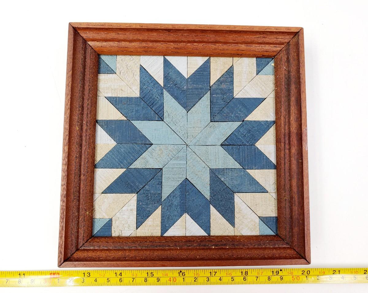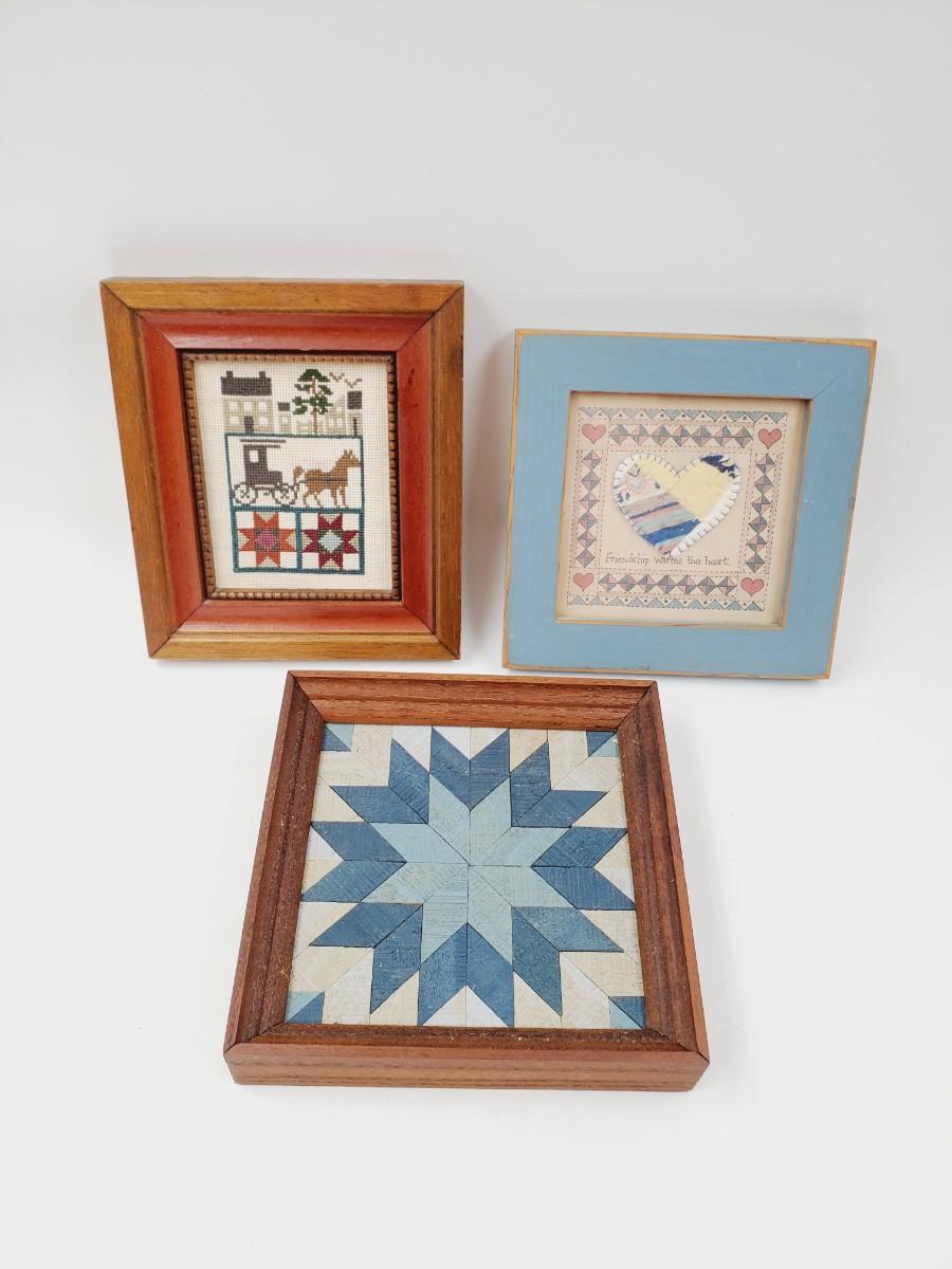 3 very pretty home decor pieces. The quilted like piece has been done in pieces of painted wood to replicate a quilting square, very cute, good condition.