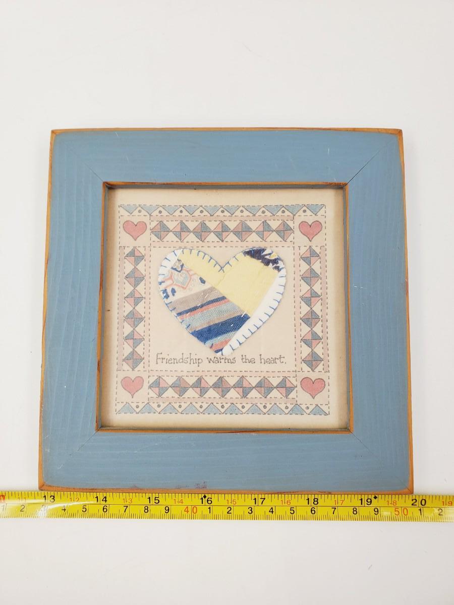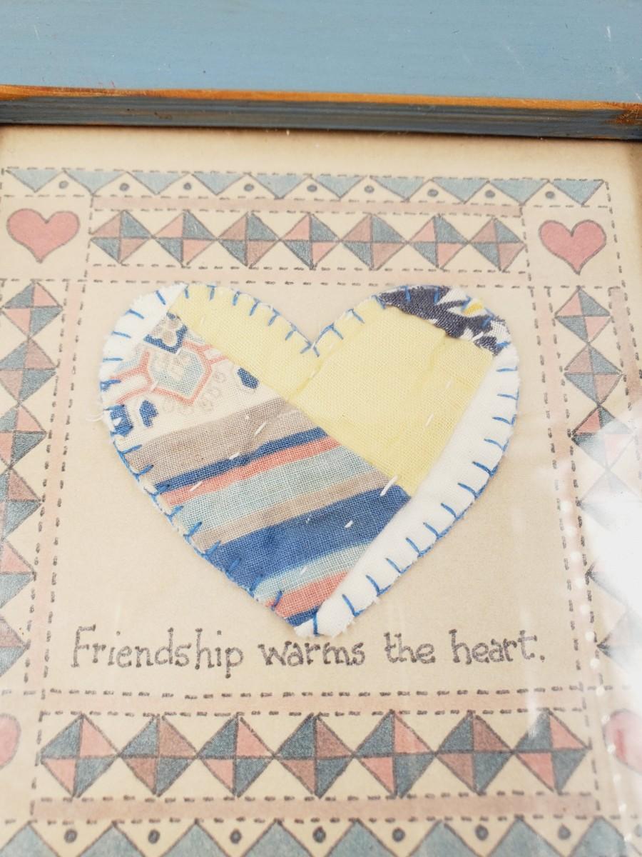 Friendship warms the heart, small heart that looks to be hand stitched, good condition.