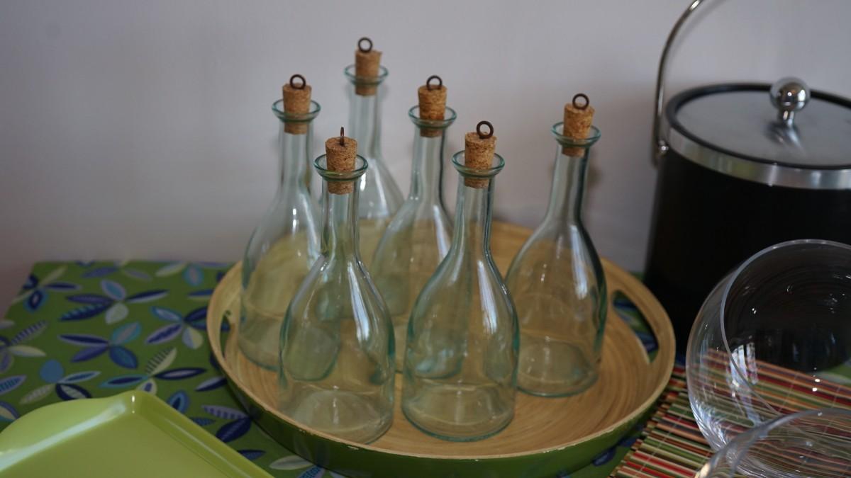 6 8 1/2" bottles with corks and ring on top serve home brew or wine