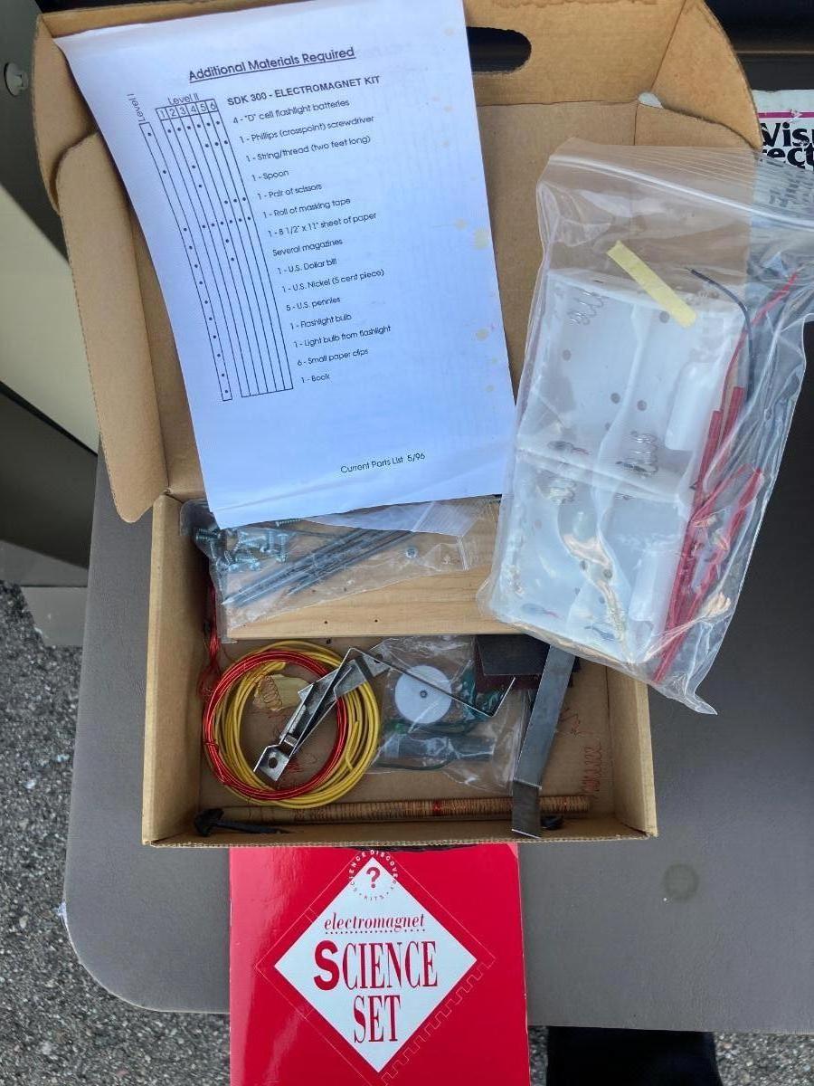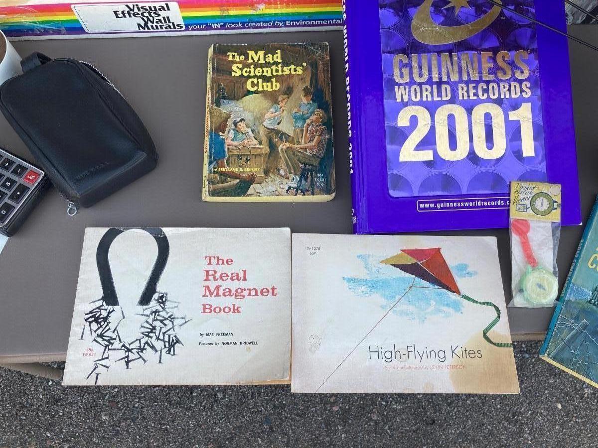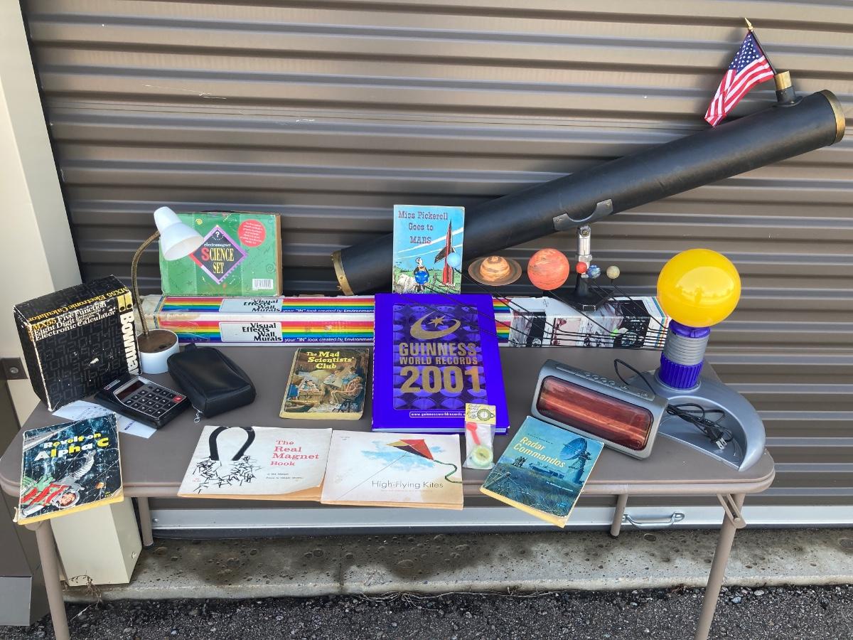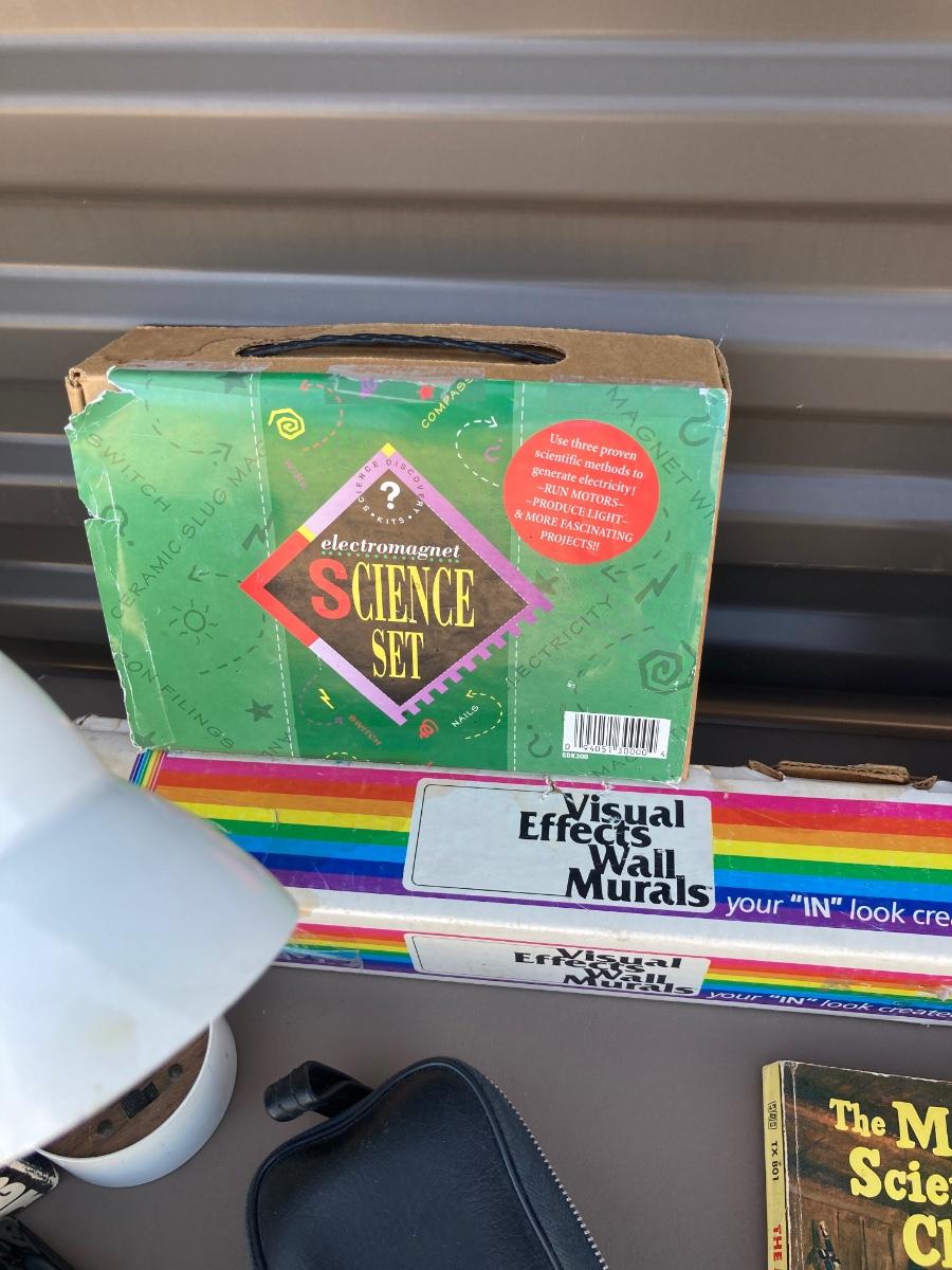 There’s a nifty planet 🌎 thing that lights up, a retro calculator with original receipt, some cool old books, a big number Cosmo Alarm Clock, A really old telescope, I believe it may be missing the eye piece. Good for conversation if not anything. Huge wall Space Wall Mural, looks like it’s been used but not with wallpaper glue. I didn’t take it out of the box because I was afraid I wouldn’t be able to put it back in there. And an electromagnet science set! Big lot of goodies!