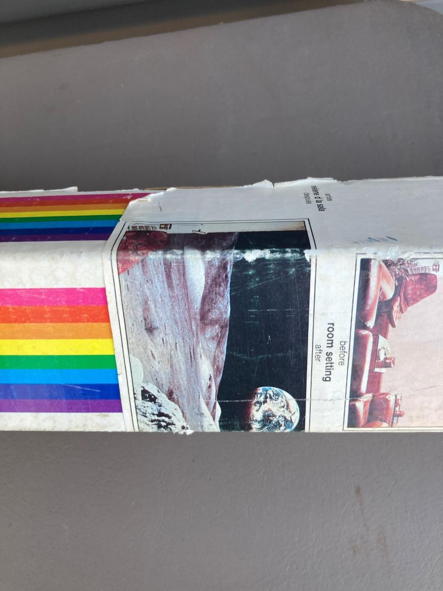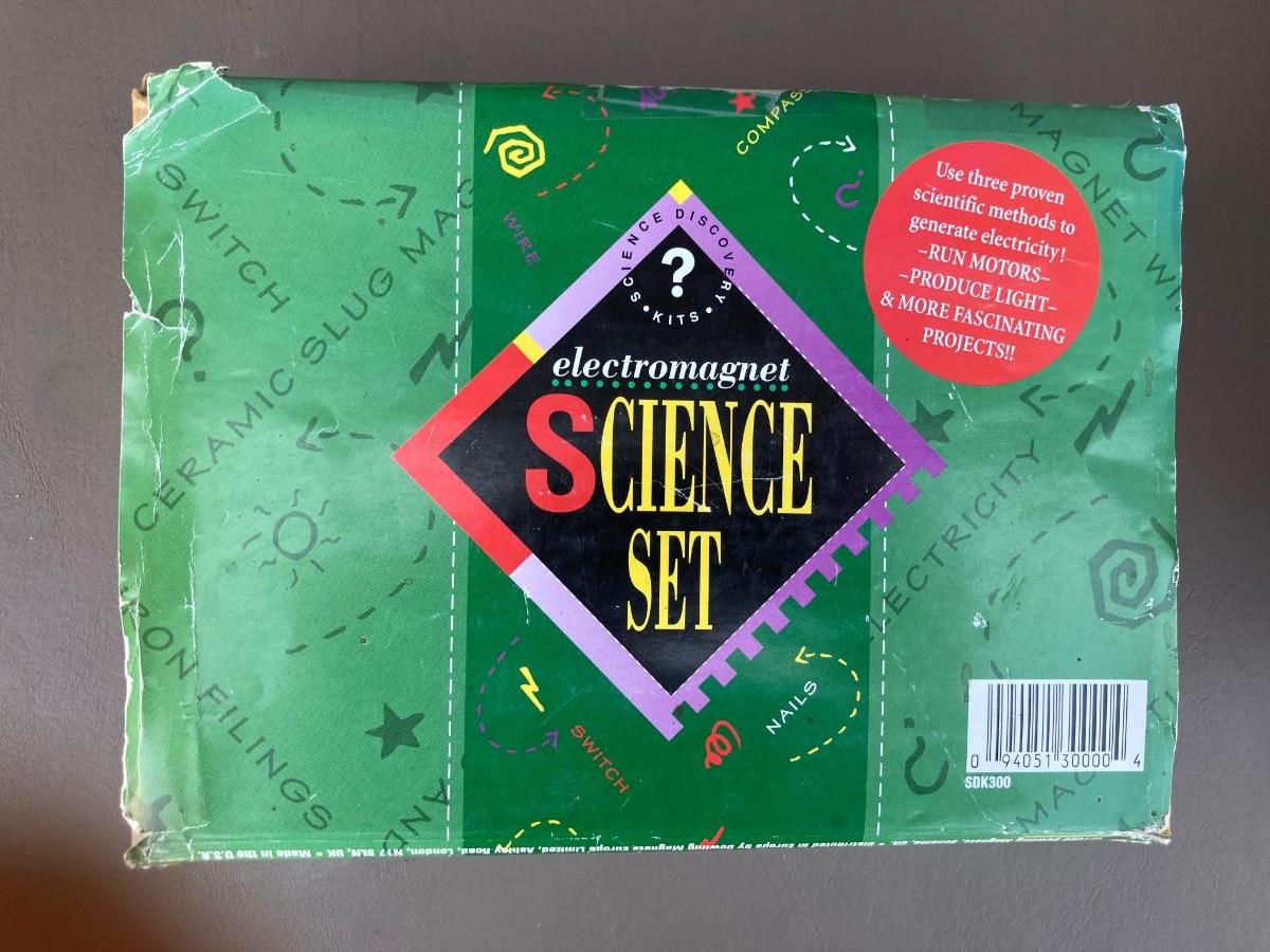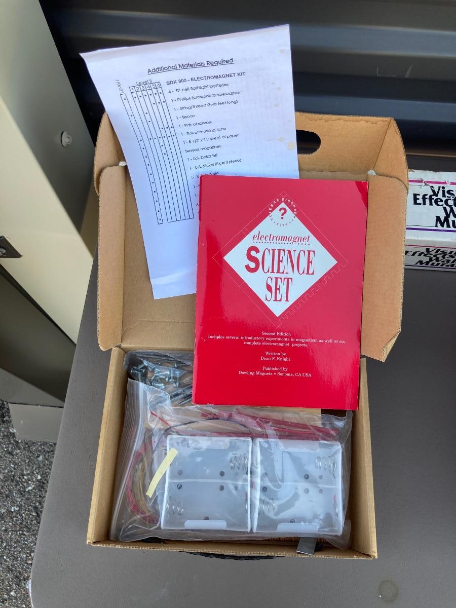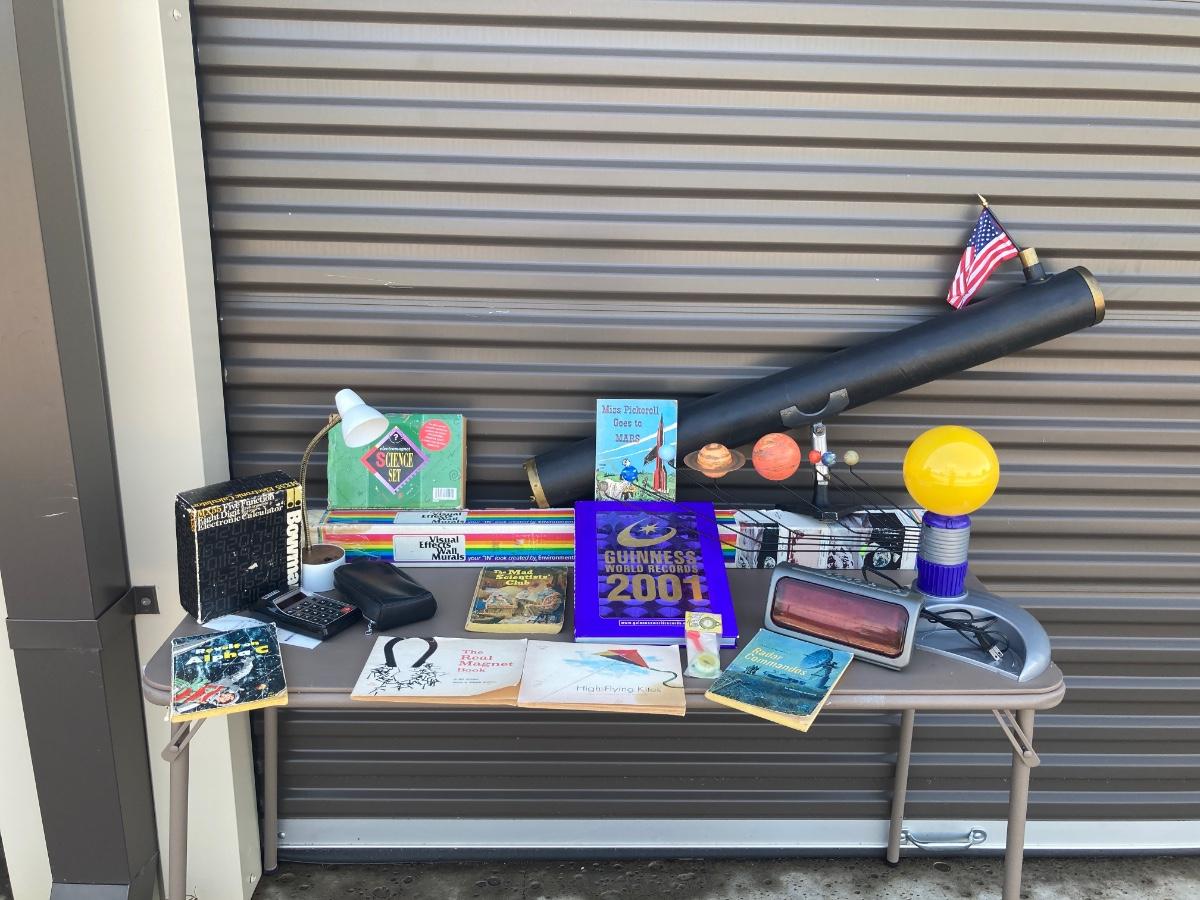 There’s a nifty planet 🌎 thing that lights up, a retro calculator with original receipt, some cool old books, a big number Cosmo Alarm Clock, A really old telescope, I believe it may be missing the eye piece. Good for conversation if not anything. Huge wall Space Wall Mural, looks like it’s been used but not with wallpaper glue. I didn’t take it out of the box because I was afraid I wouldn’t be able to put it back in there. And an electromagnet science set! Big lot of goodies!