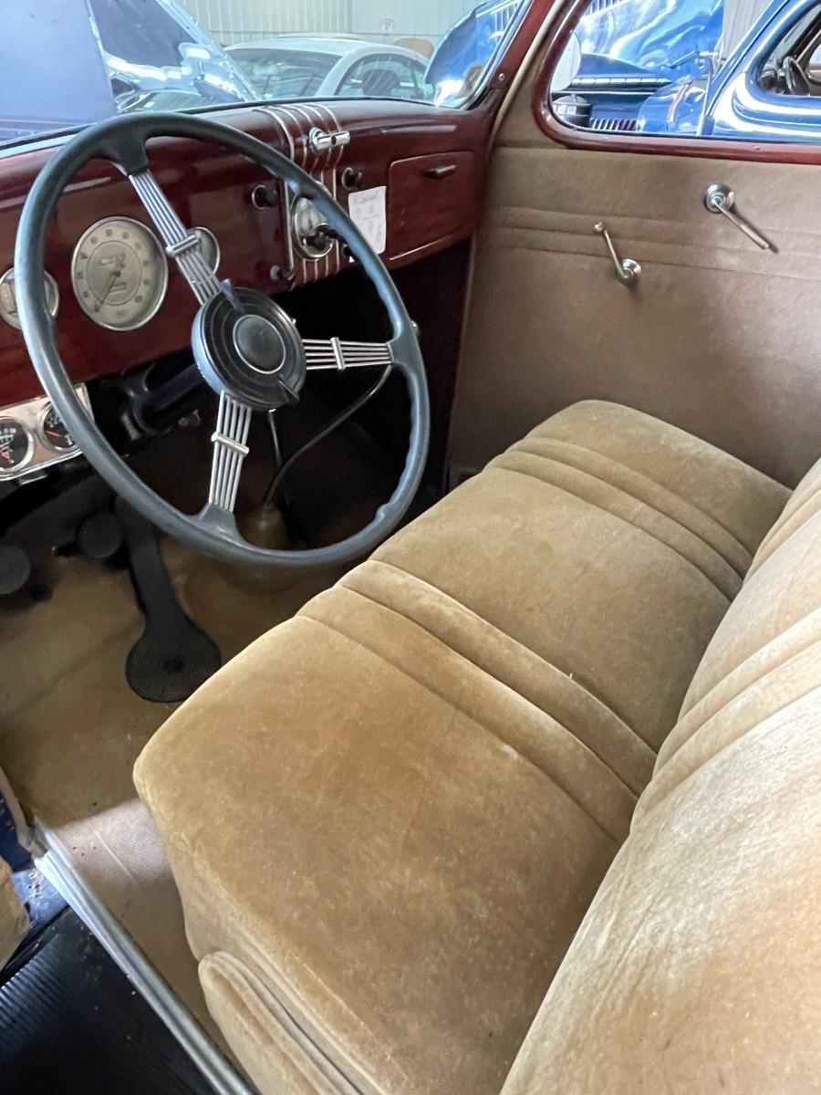 1934 Ford 5 window coupe, Blue exterior with tan cloth interior. Rumble seat has tan leather-like seat.. Original wire wheels & rear mounted spare with Cooker white wall tires. Exterior / interior condition is A+
