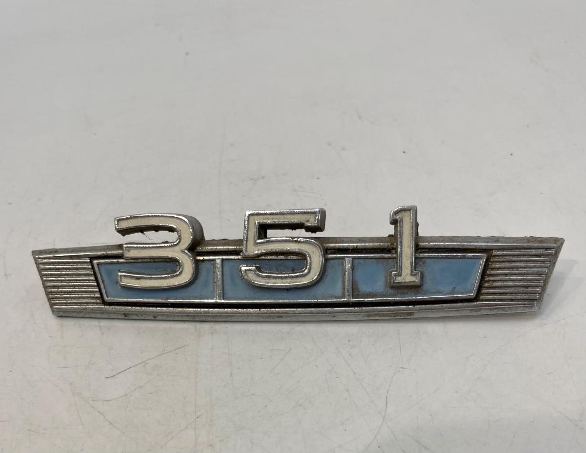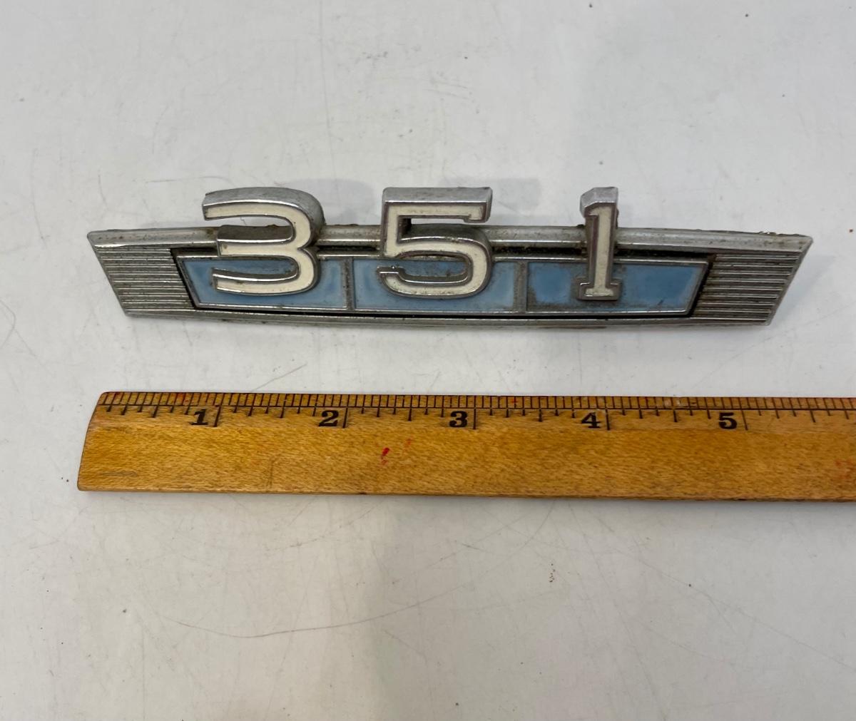 Appears to be an original Ford/Mercury "351" fender hat badge from 1967-69. Used on many different cars: Galaxie, Country Squire, Custom 500, LTD, Ranch Wagon, Fairlane, Torino, Ranchero, Comet, Montego, and Cyclone with a 351 CID engine.
