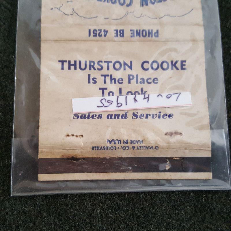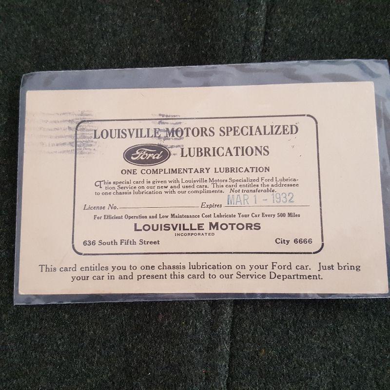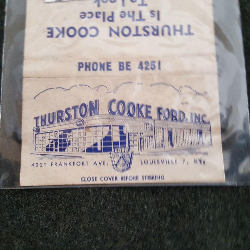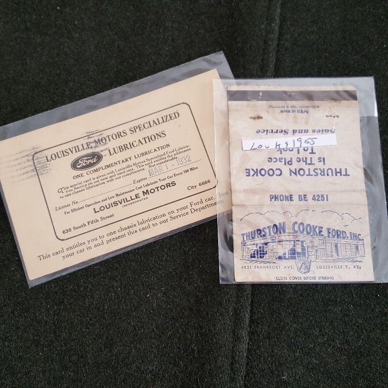 The auction lot is for two pieces of Ford Automotive Memorabilia. One is a postcard dated 1932 offering a free lube job at Louisville Motors Ford Dealership. The second item is a flattened matchbook from Thurston - Cooke Ford, a dealership that was located on Frankfort Avenue in Louisville from about 1955. See photos for condition.