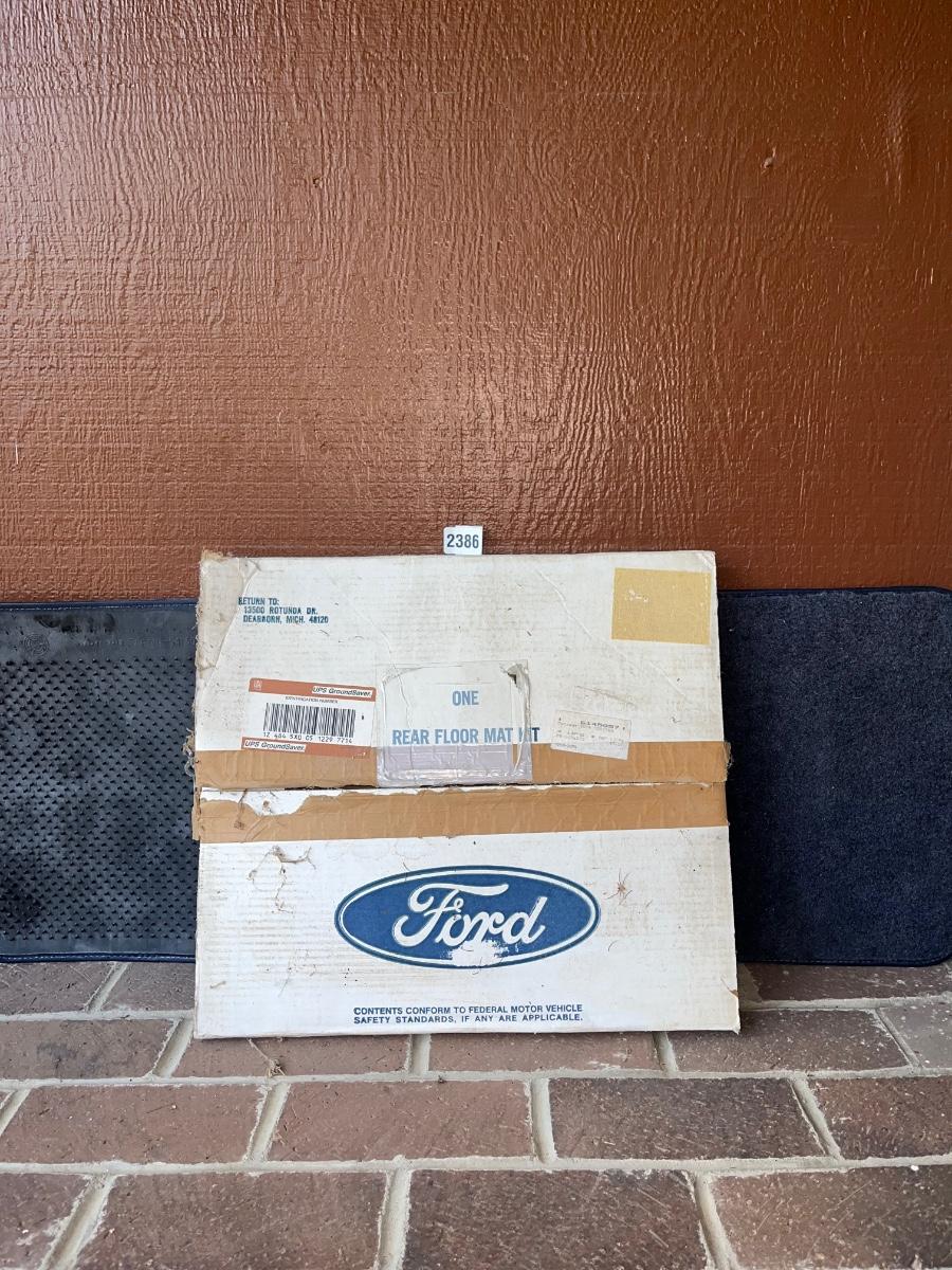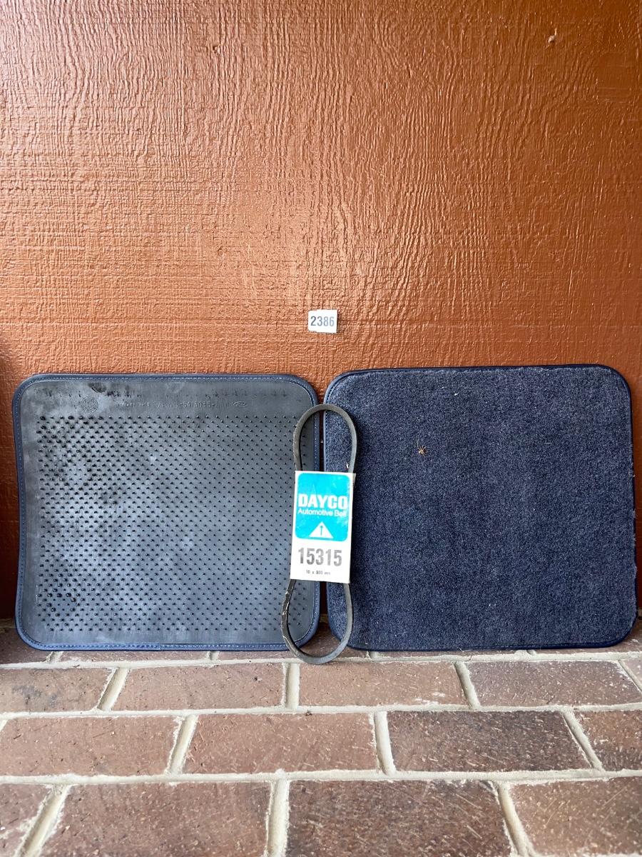 Two Ford brand vehicle floor mats and DAYCO automotive fan belt.