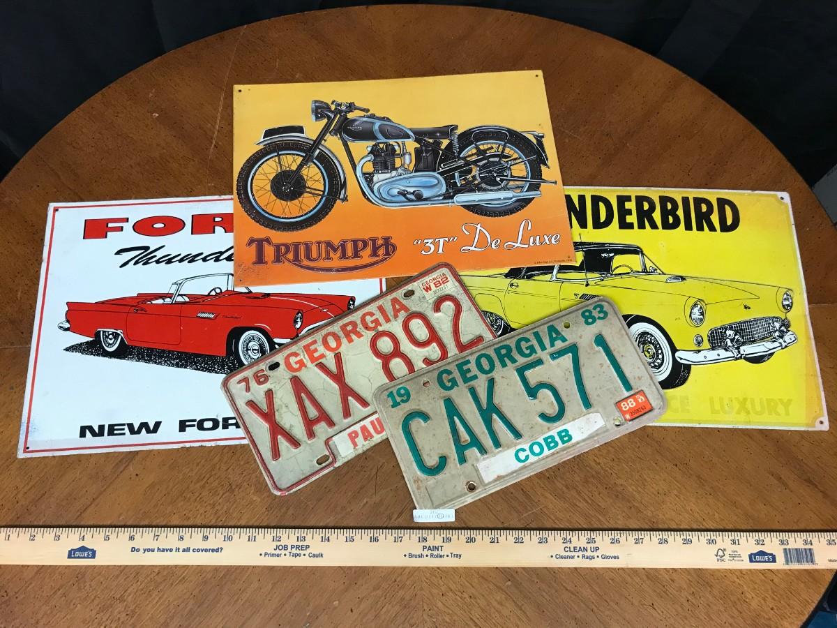 wall decor: ford, thunderbird, triumph motorcycle tags and car signage;