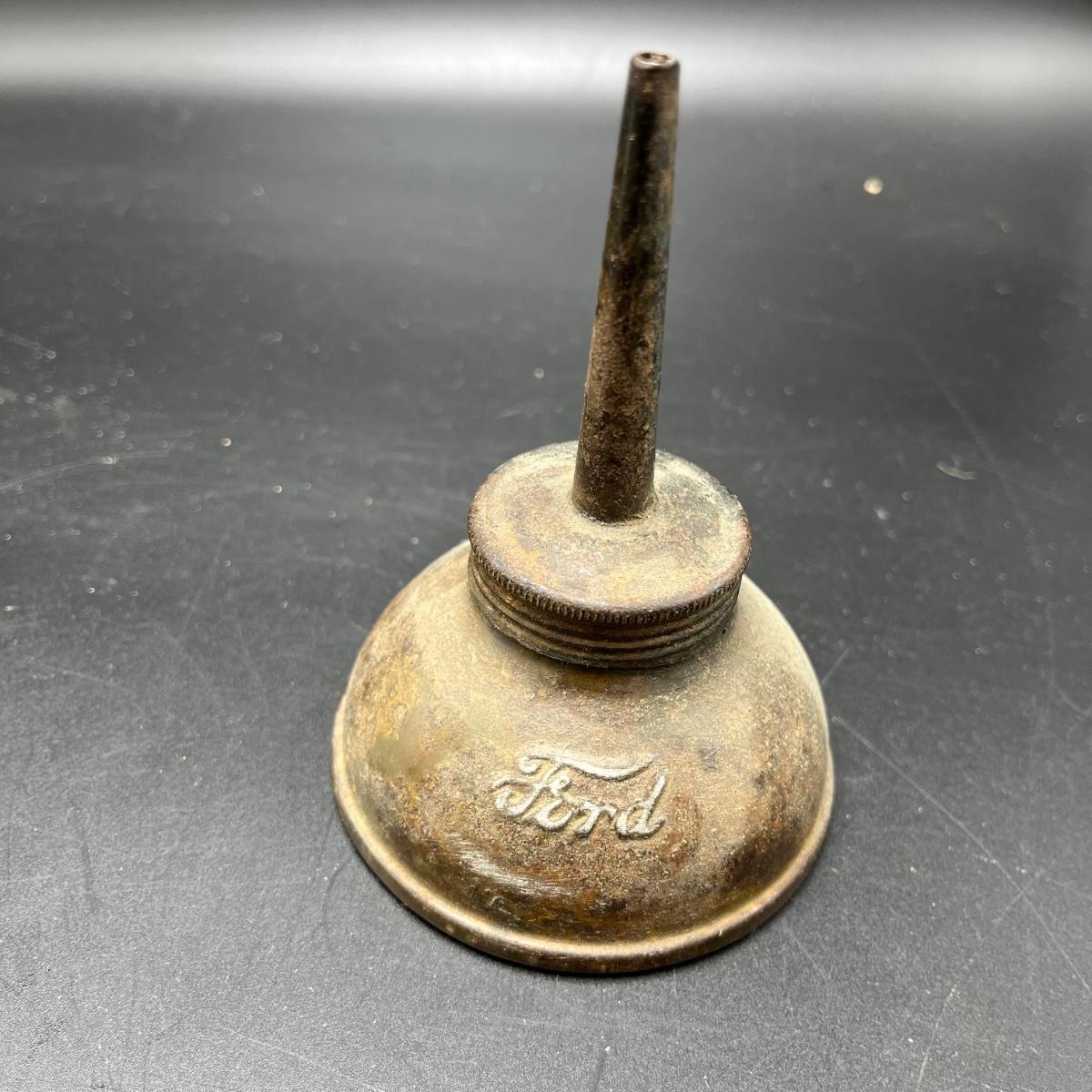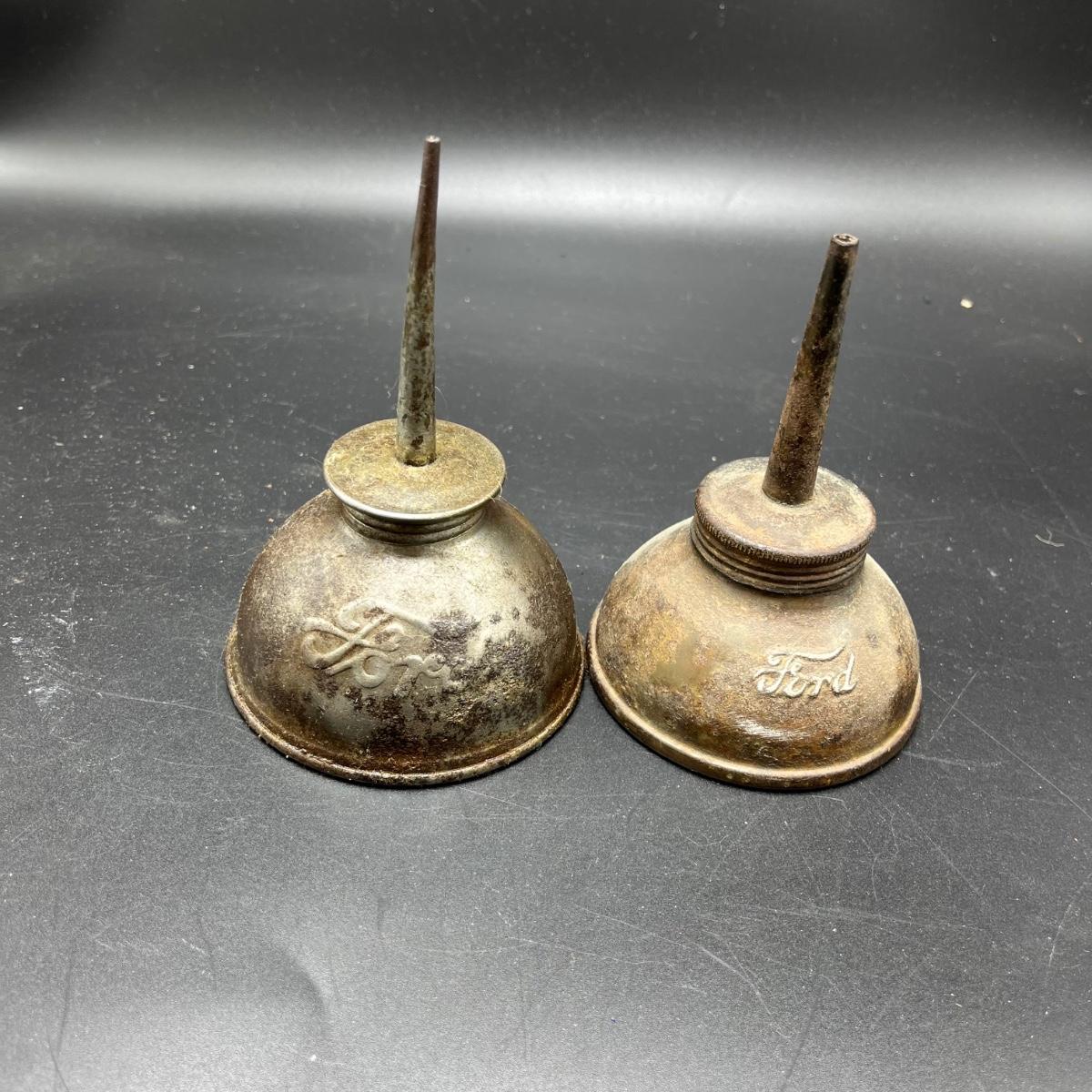 Lot includes two vintage Ford oil cans with the Ford script on can. Largest can measures 3.5”D x 5” tall.