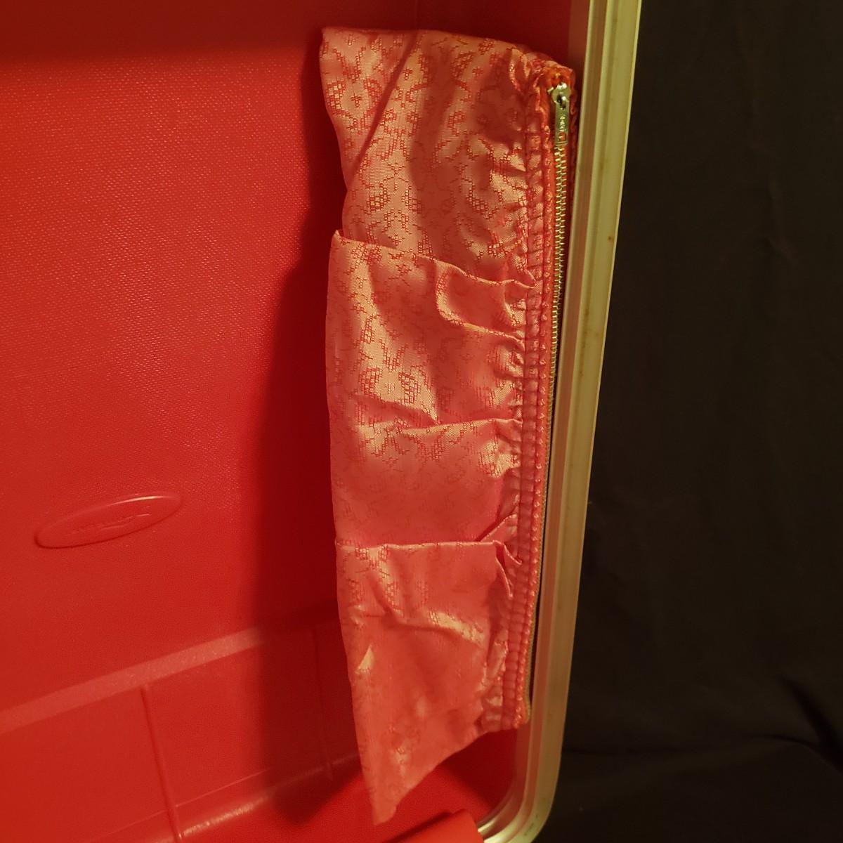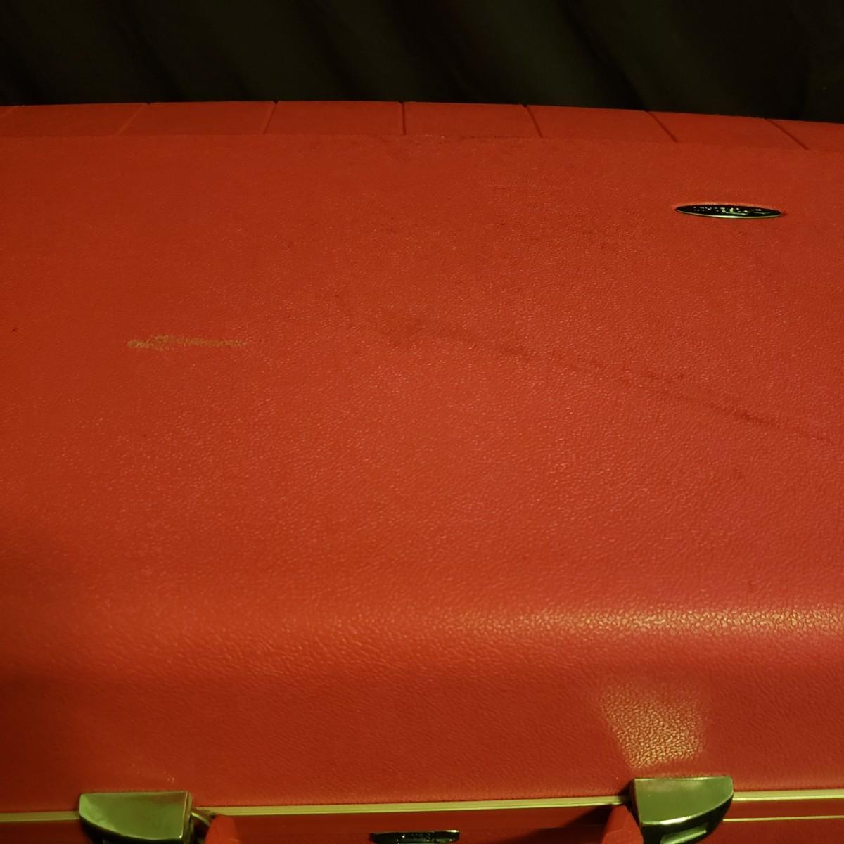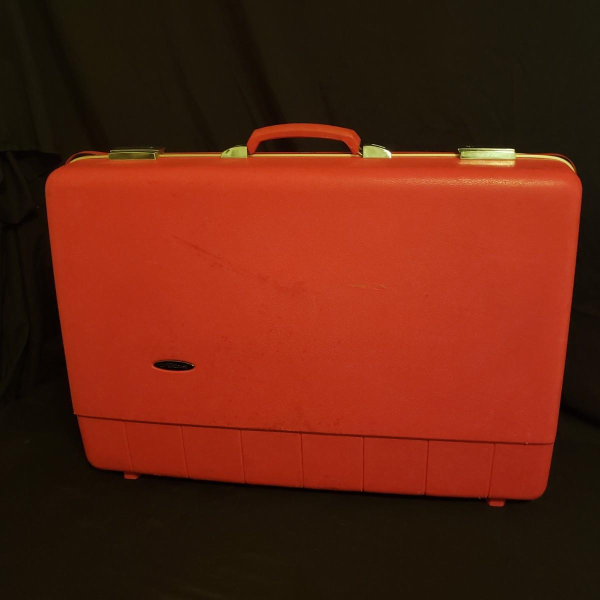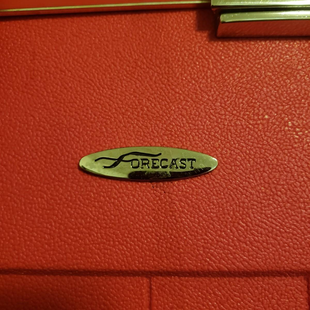 This lot features two Forecast luggage pieces. Both are made from a hard plastic material in a tomato red colorway. The cosmetic case measures 15" x 9" x 10"H. It has a mirror, a removable tray and zipper pouch. The zipper could use some lubricant, but does open and close. The large suitcase measures 27" x 7" x 20"H. It features two zipper pouches and a divider. The one pouch does zip, but could use lubricant. The red trim near the locks is separated but does not come off.