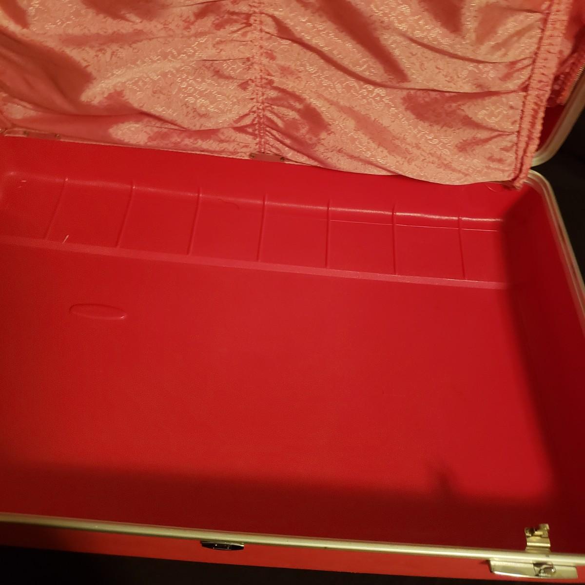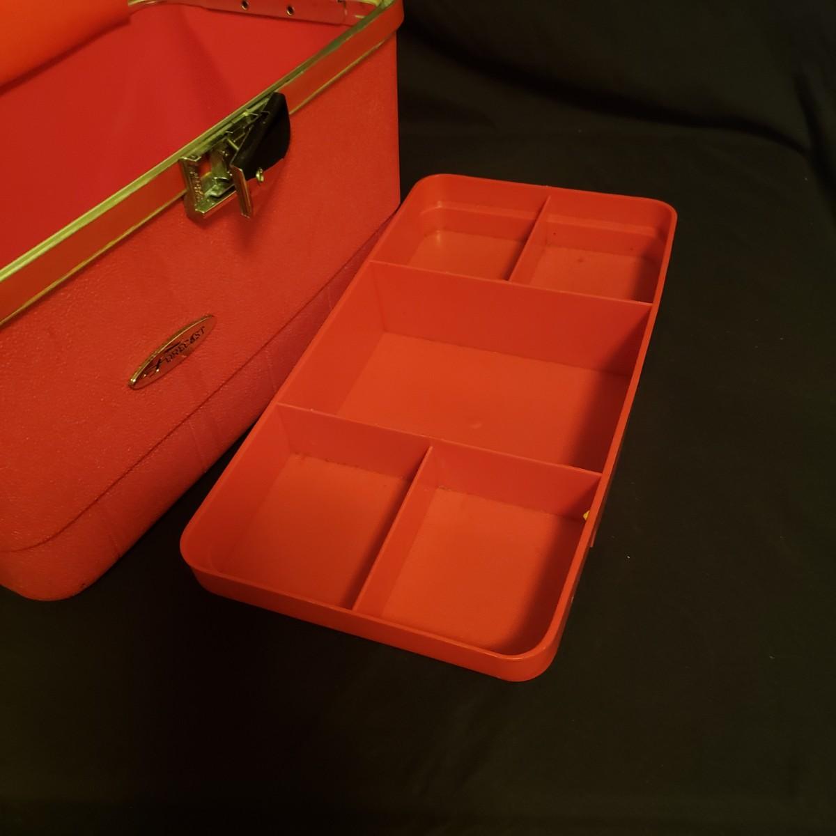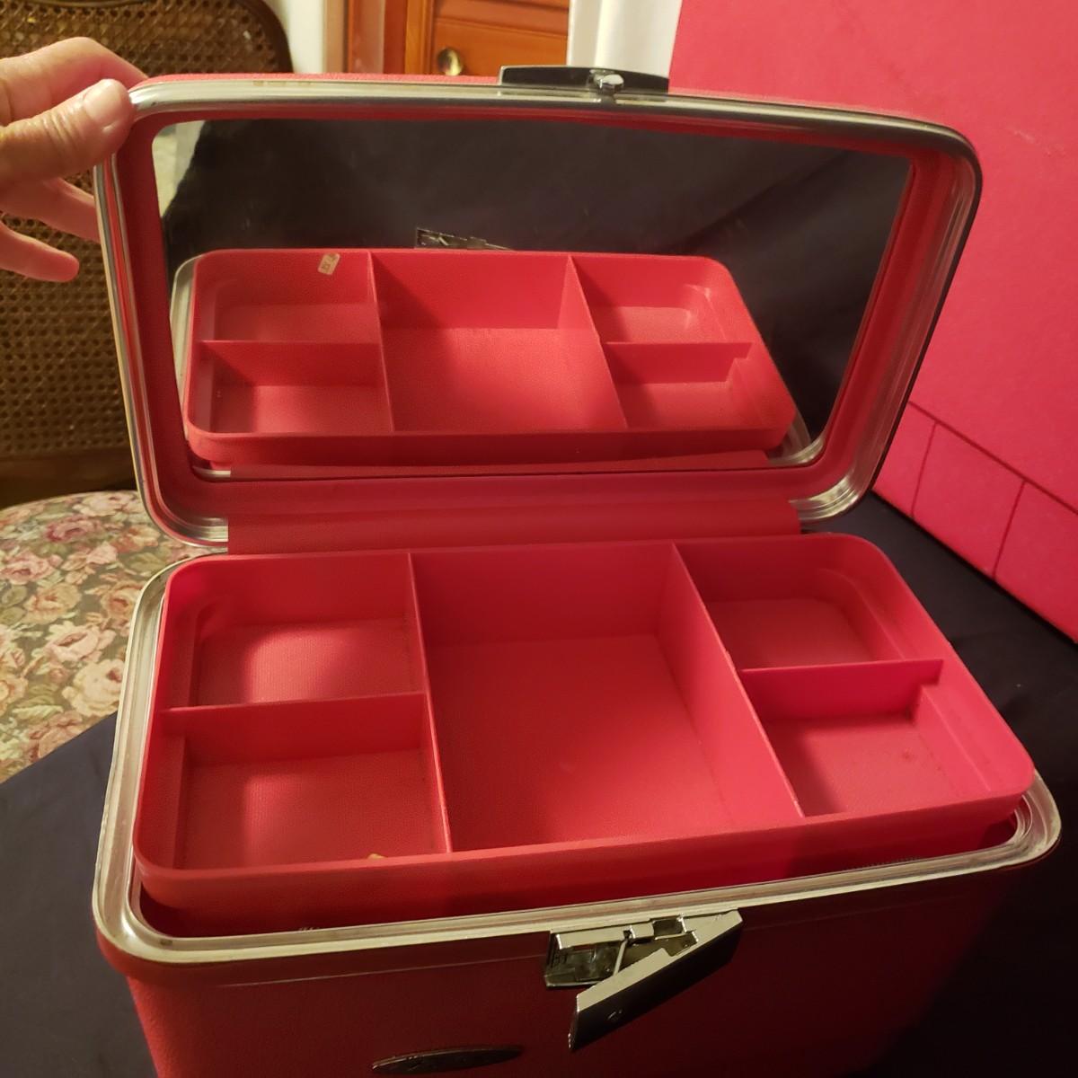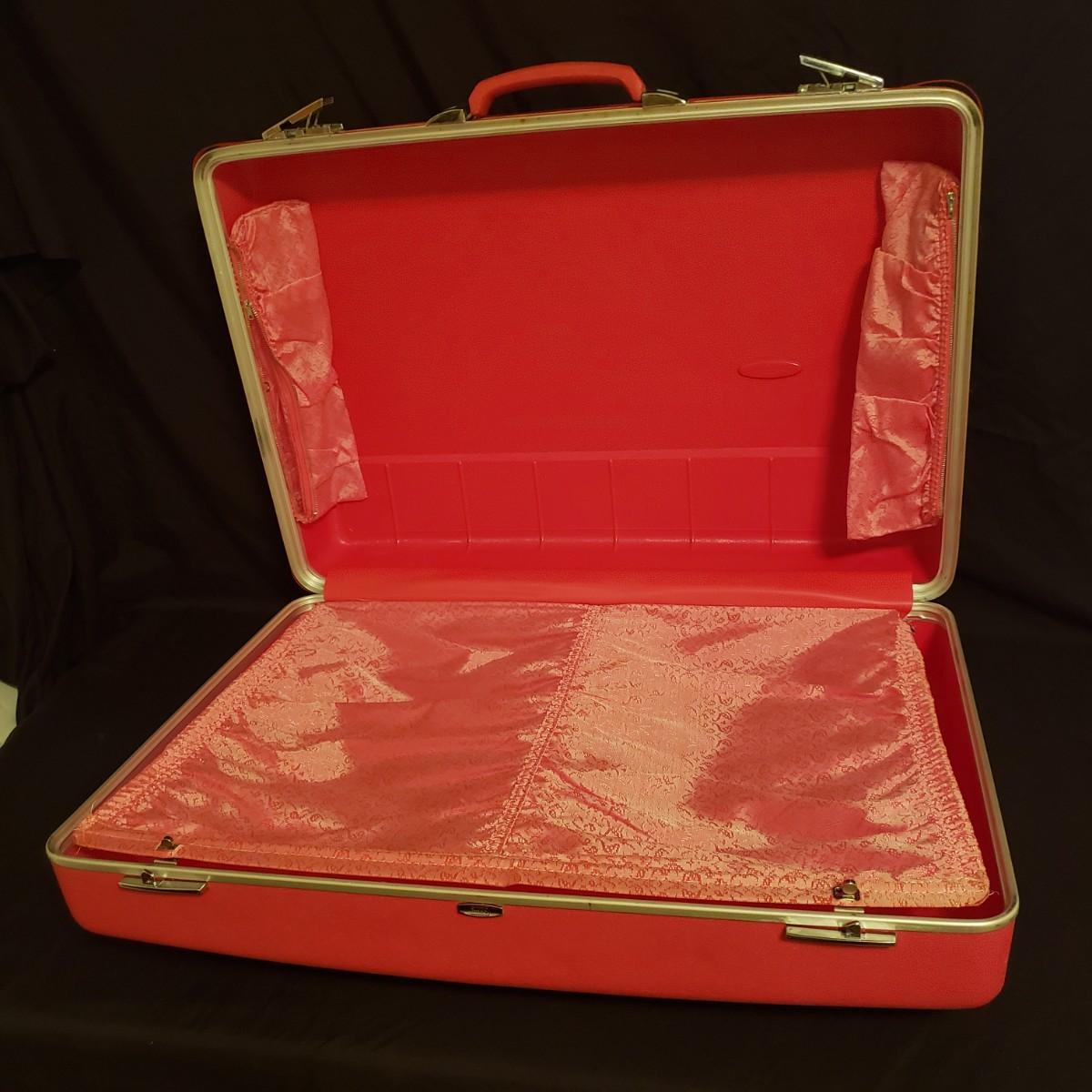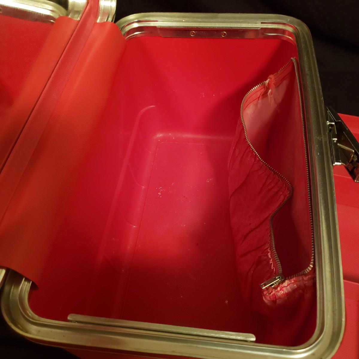This lot features two Forecast luggage pieces. Both are made from a hard plastic material in a tomato red colorway. The cosmetic case measures 15" x 9" x 10"H. It has a mirror, a removable tray and zipper pouch. The zipper could use some lubricant, but does open and close. The large suitcase measures 27" x 7" x 20"H. It features two zipper pouches and a divider. The one pouch does zip, but could use lubricant. The red trim near the locks is separated but does not come off.