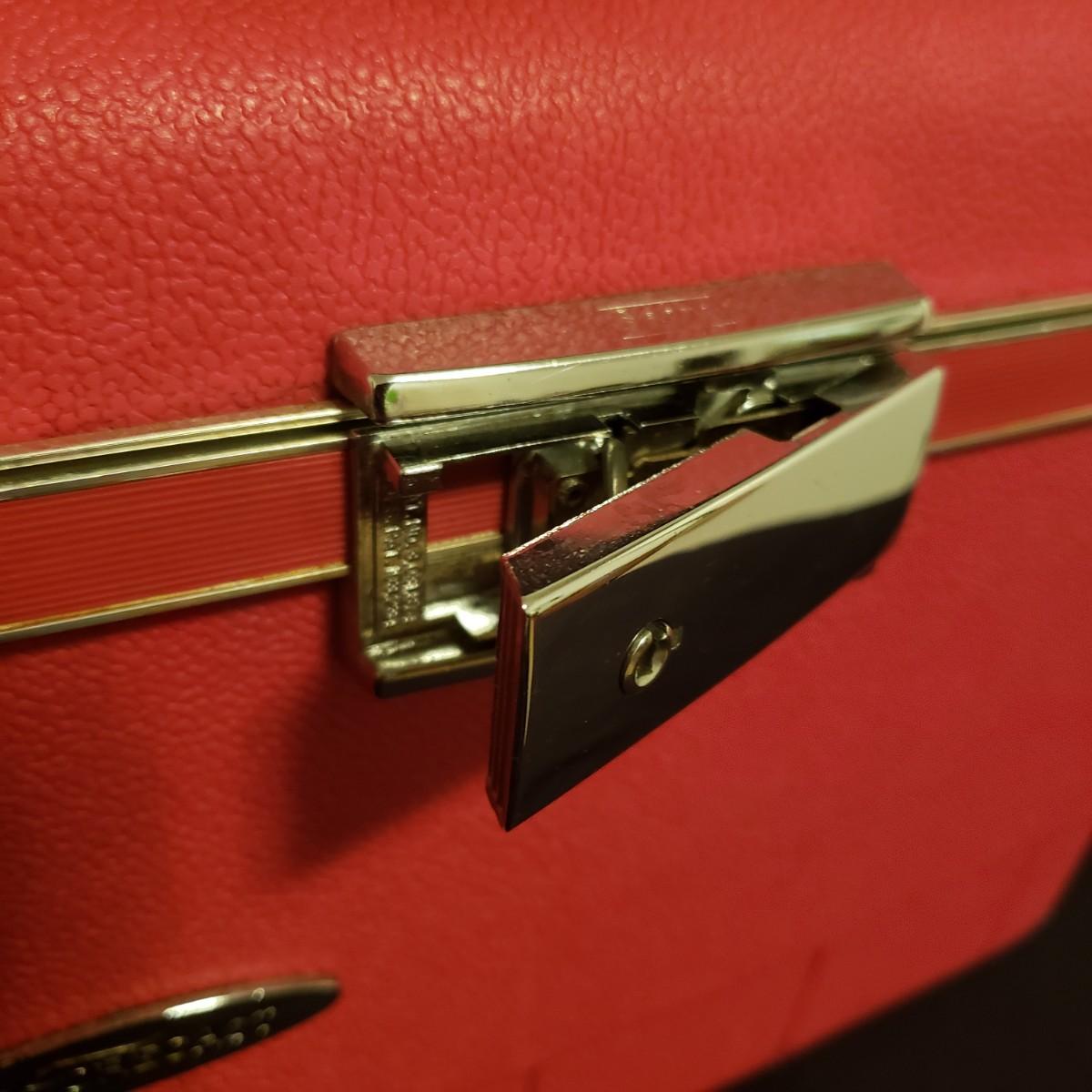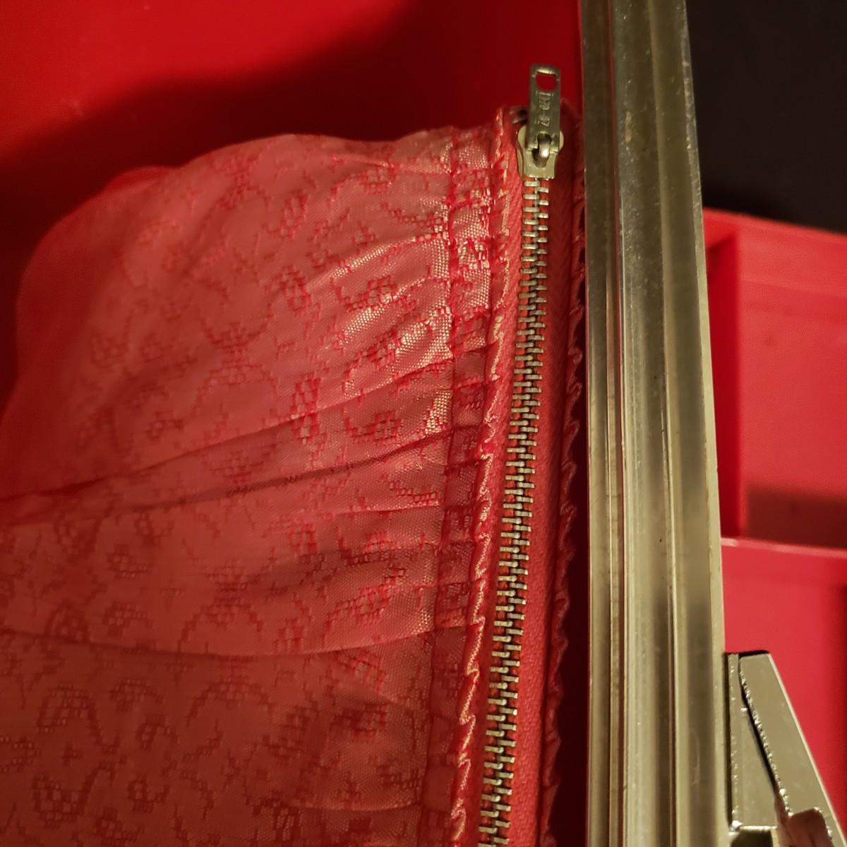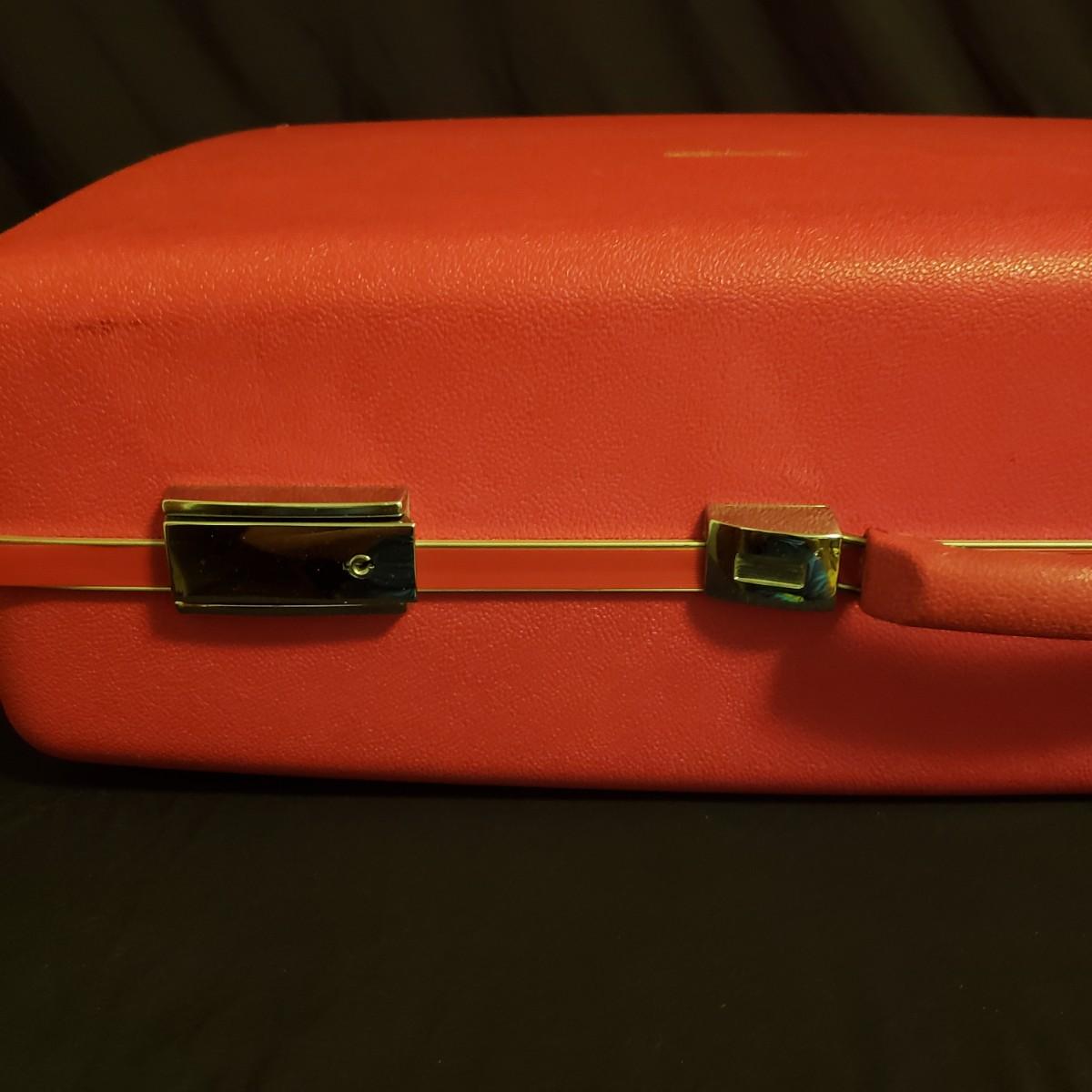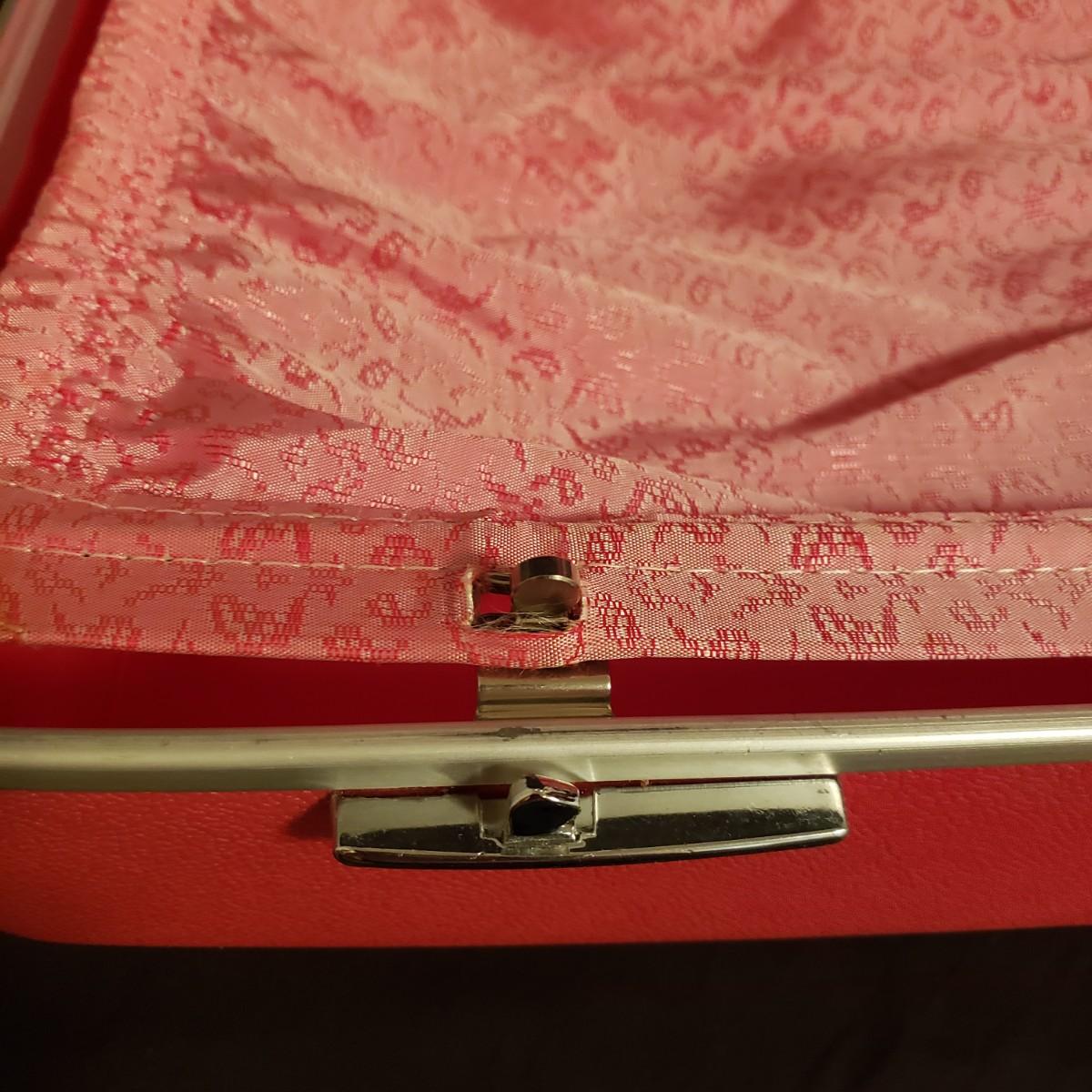 This lot features two Forecast luggage pieces. Both are made from a hard plastic material in a tomato red colorway. The cosmetic case measures 15" x 9" x 10"H. It has a mirror, a removable tray and zipper pouch. The zipper could use some lubricant, but does open and close. The large suitcase measures 27" x 7" x 20"H. It features two zipper pouches and a divider. The one pouch does zip, but could use lubricant. The red trim near the locks is separated but does not come off.