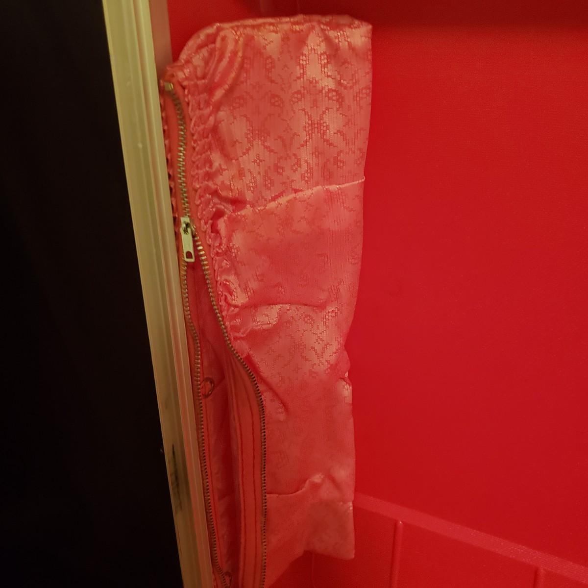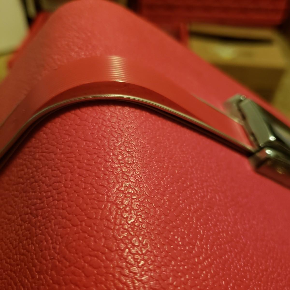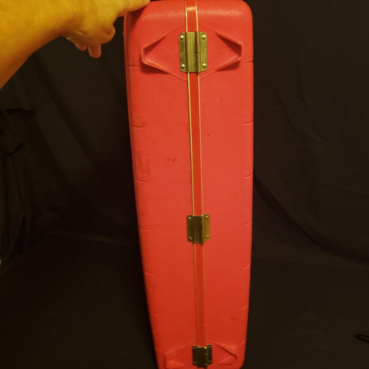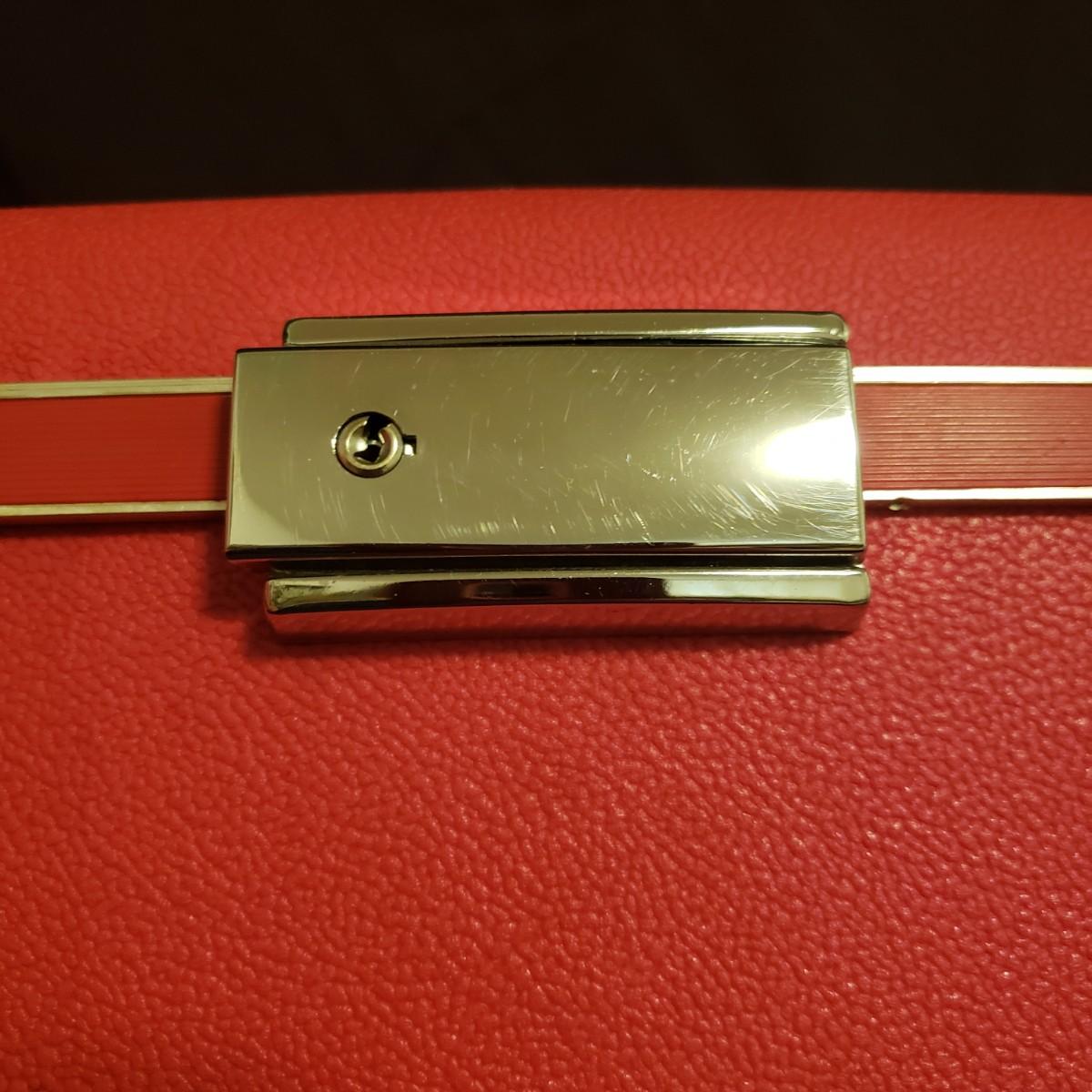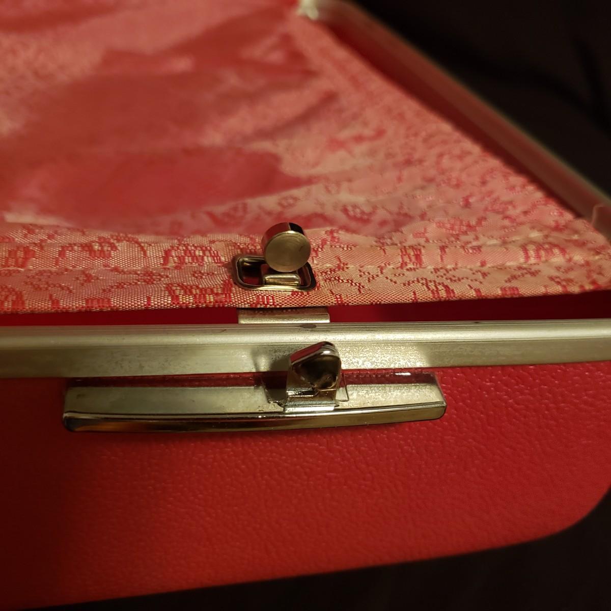 This lot features two Forecast luggage pieces. Both are made from a hard plastic material in a tomato red colorway. The cosmetic case measures 15" x 9" x 10"H. It has a mirror, a removable tray and zipper pouch. The zipper could use some lubricant, but does open and close. The large suitcase measures 27" x 7" x 20"H. It features two zipper pouches and a divider. The one pouch does zip, but could use lubricant. The red trim near the locks is separated but does not come off.