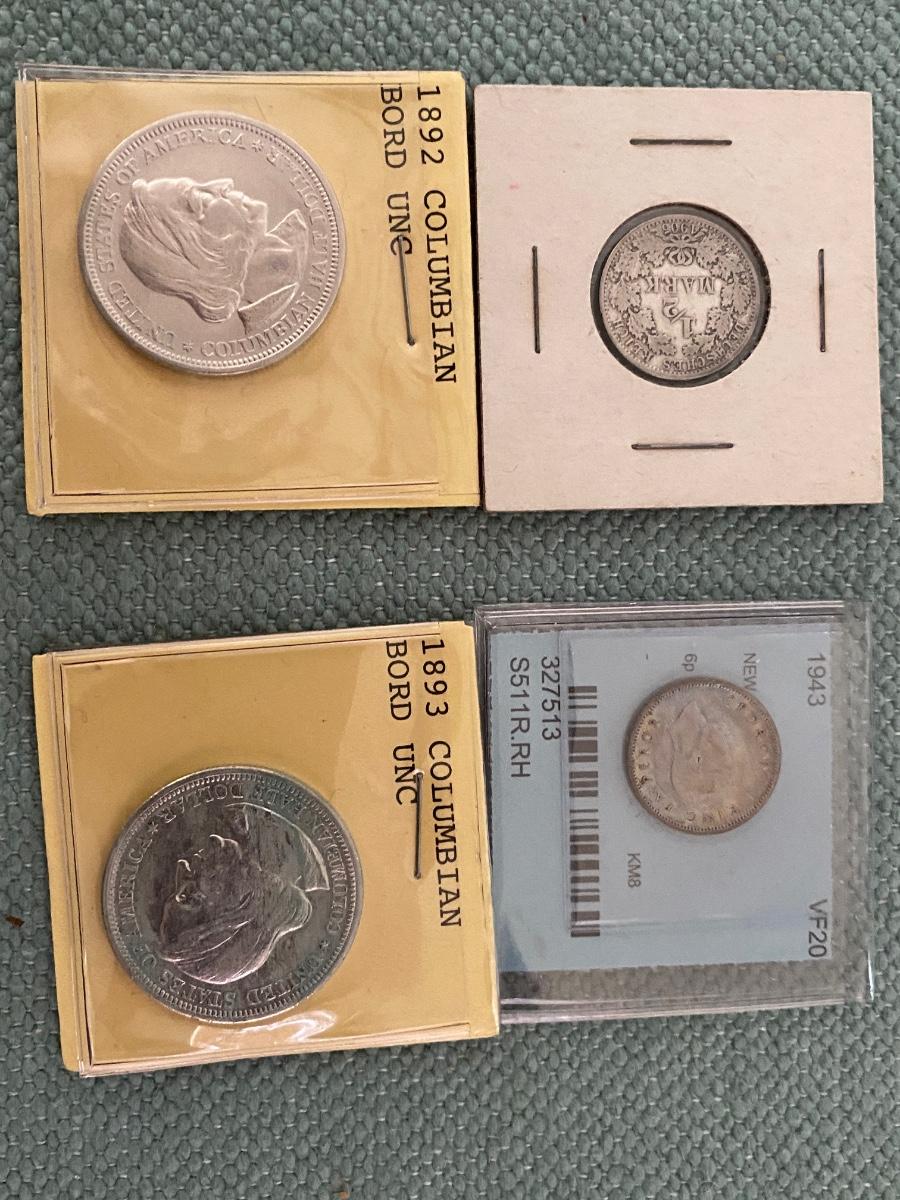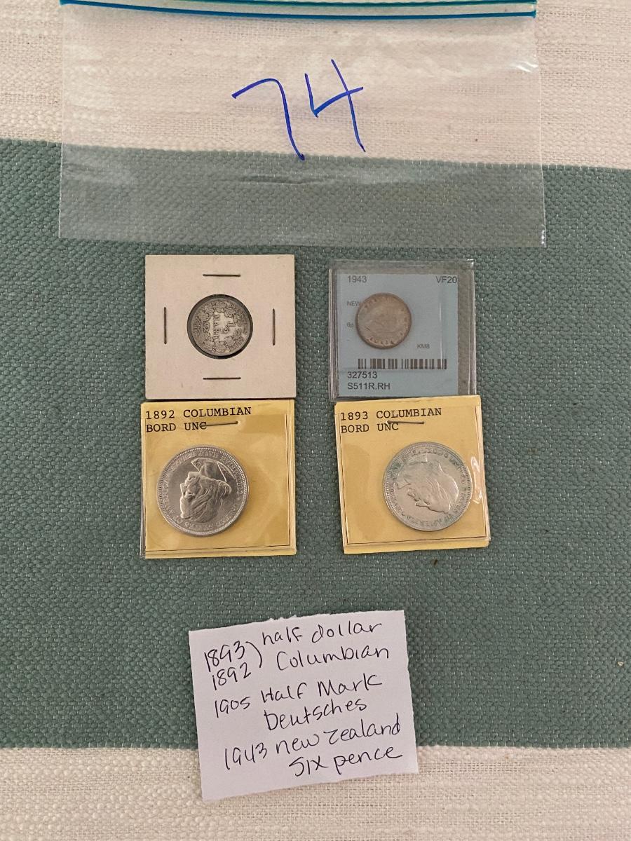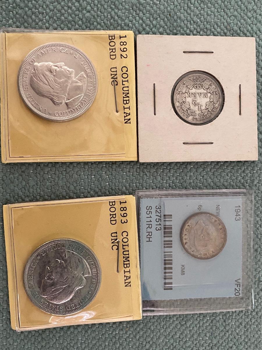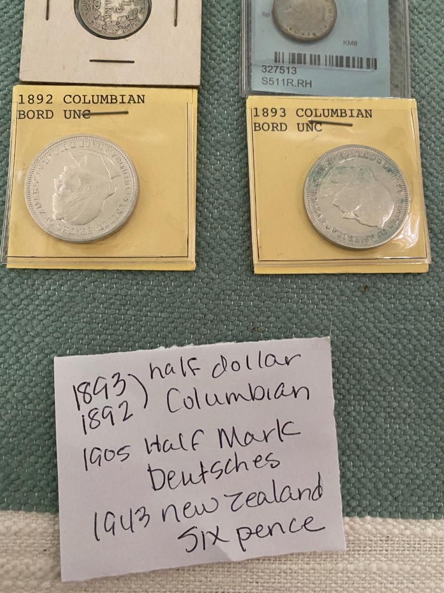 1892, 1893 Half Dollar Columbian Coin, 1905 Half Marc Deutsches Coin, 1943 New Zeland 6 Pence Coin As Pictured