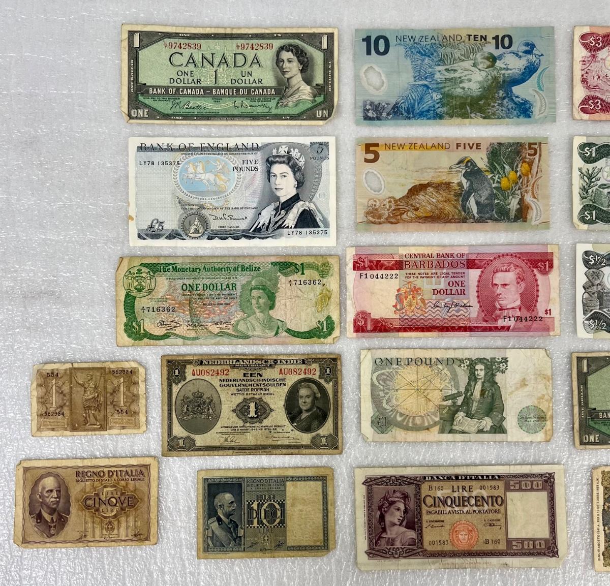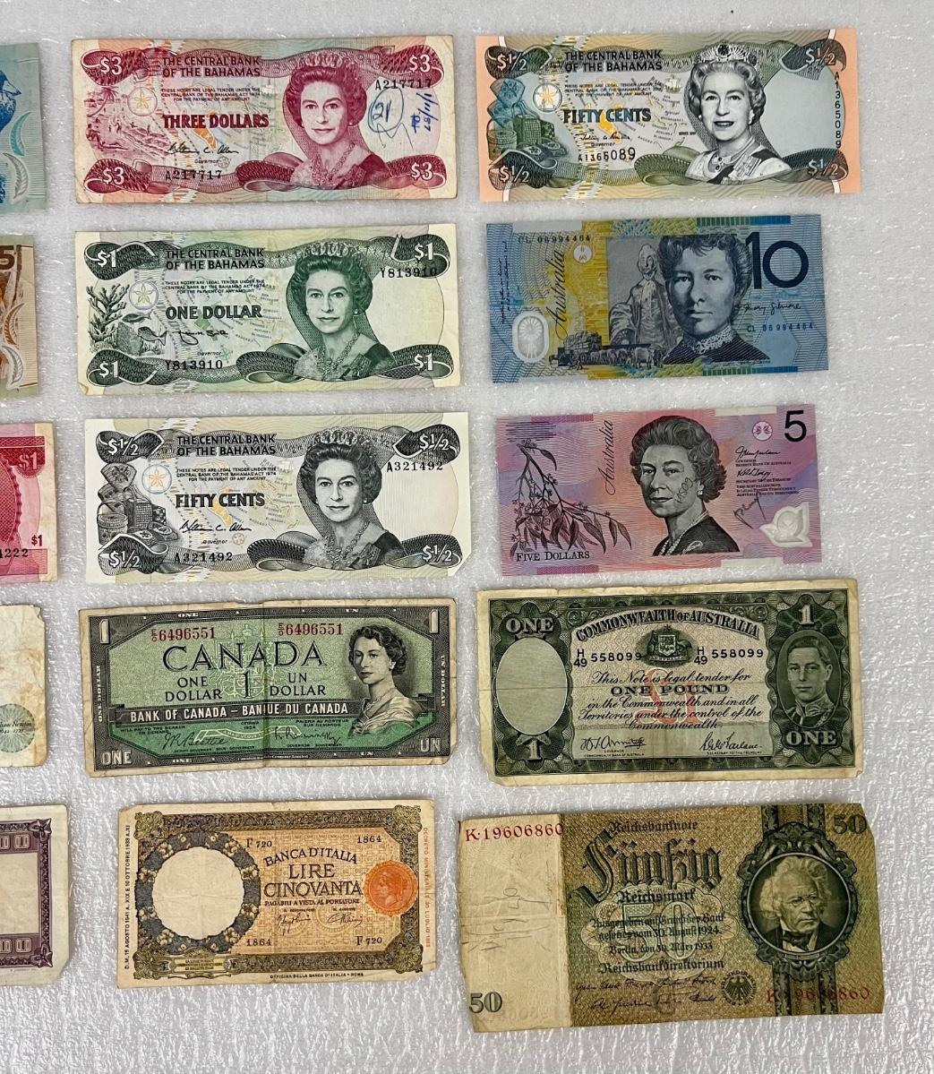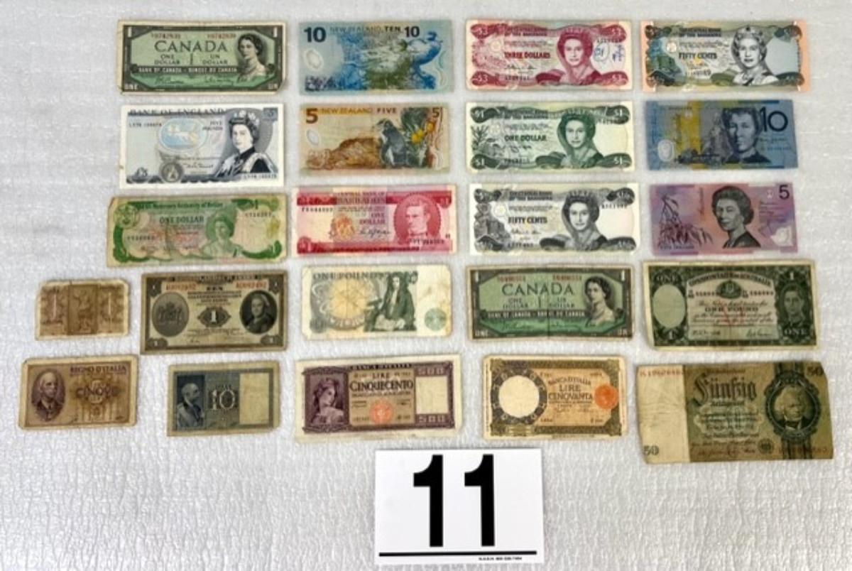 Includes paper currency from Canada, Italy, Great Britain, Australia, New Zealand, and more. Total of 22 pieces. SOLD AS IS.