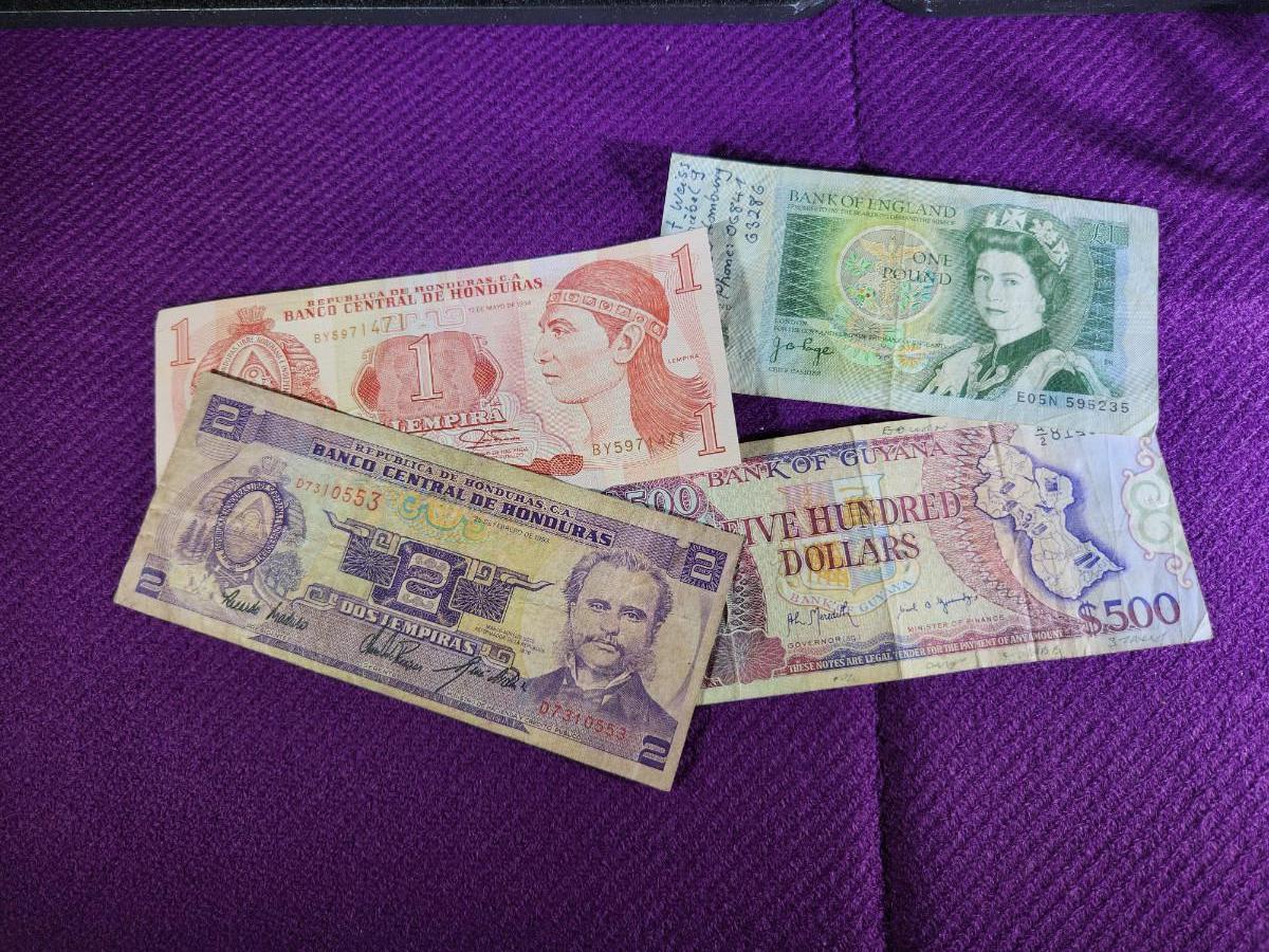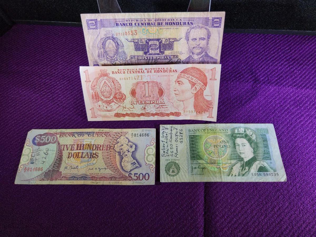 This auction lot is for a few pieces of Foreign Paper Money. The lot include 1 English Pound Note, 1 Bank of Guyana 500 Dollar Note, a $2 Bank of Honduras Note and a $1 Bank of Honduras Note. Well used and some written upon.