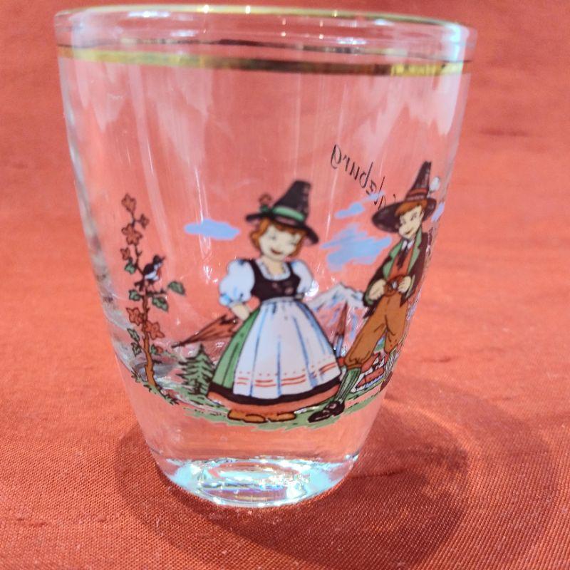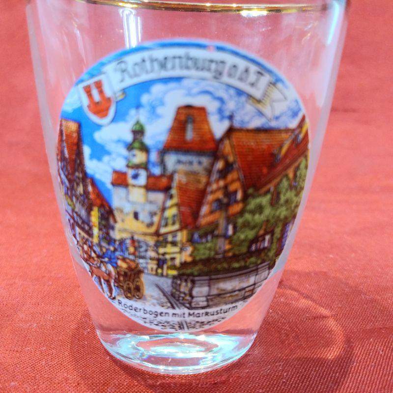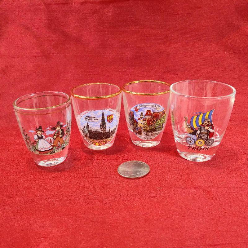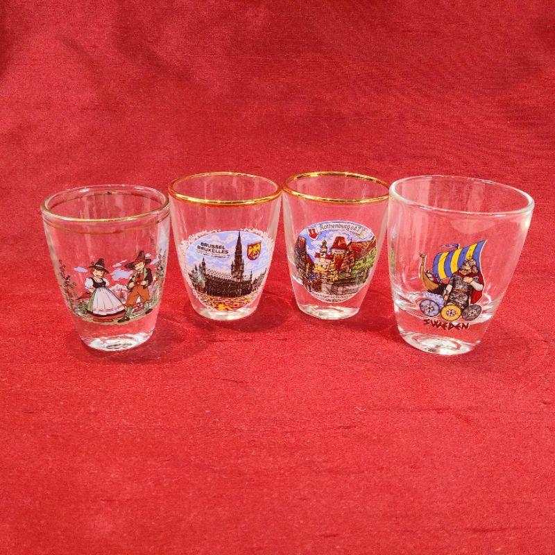 A collection of 4 older shot glasses from foreign lands. They are from: Salzburg, Brussel, Rothenburg and Sweden. All in very good condition. More to add to your jigger collection.