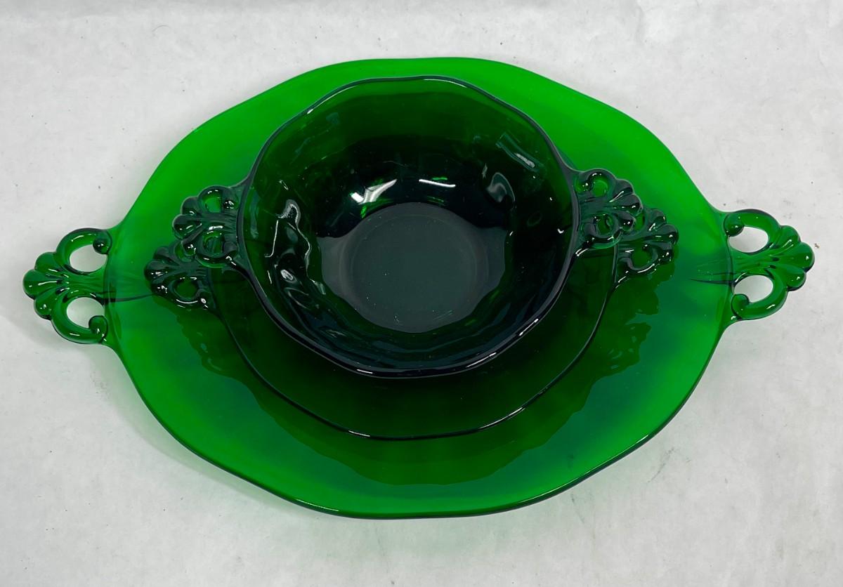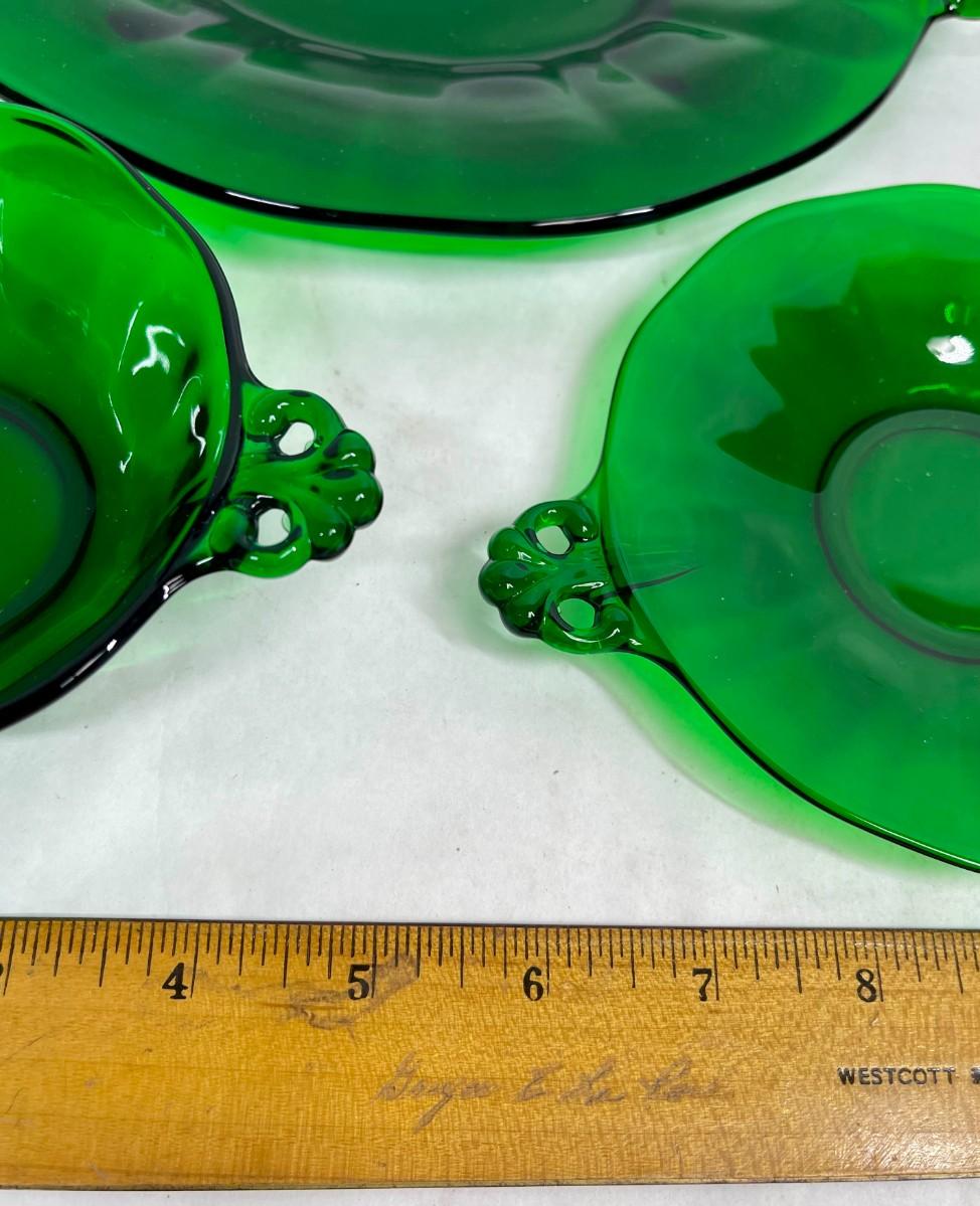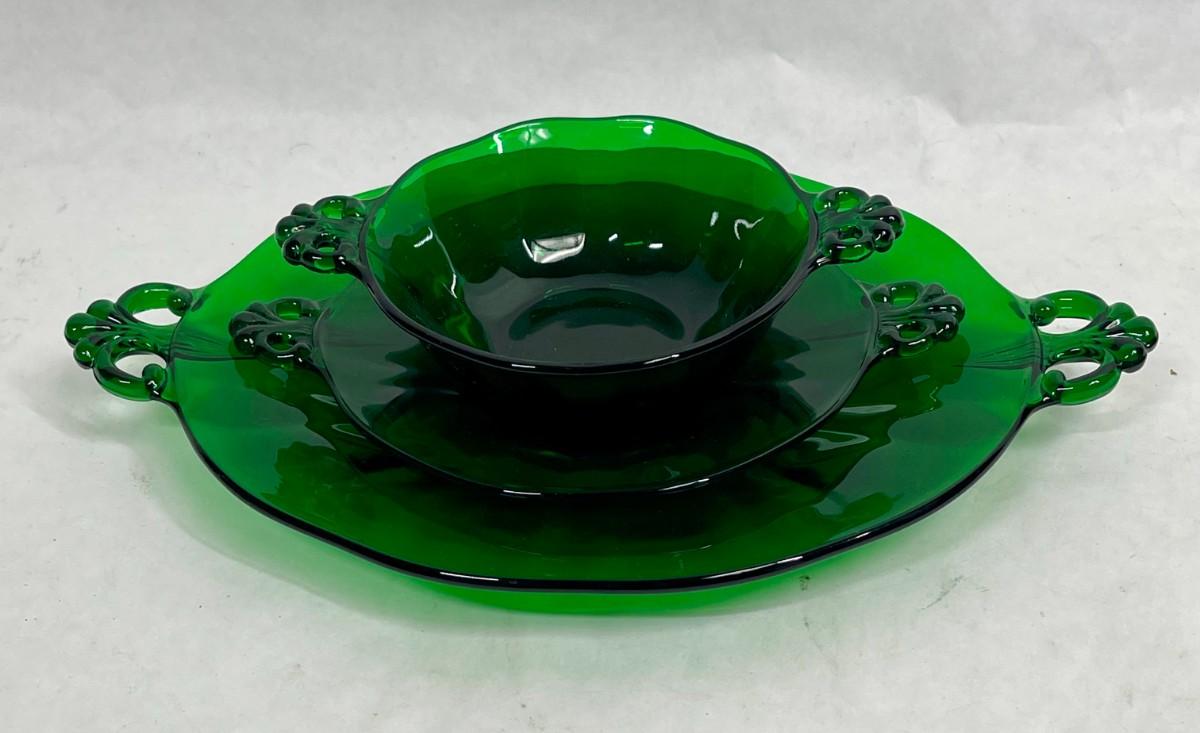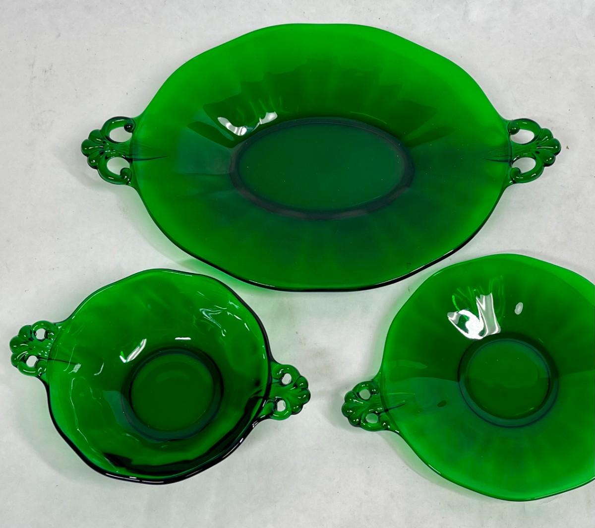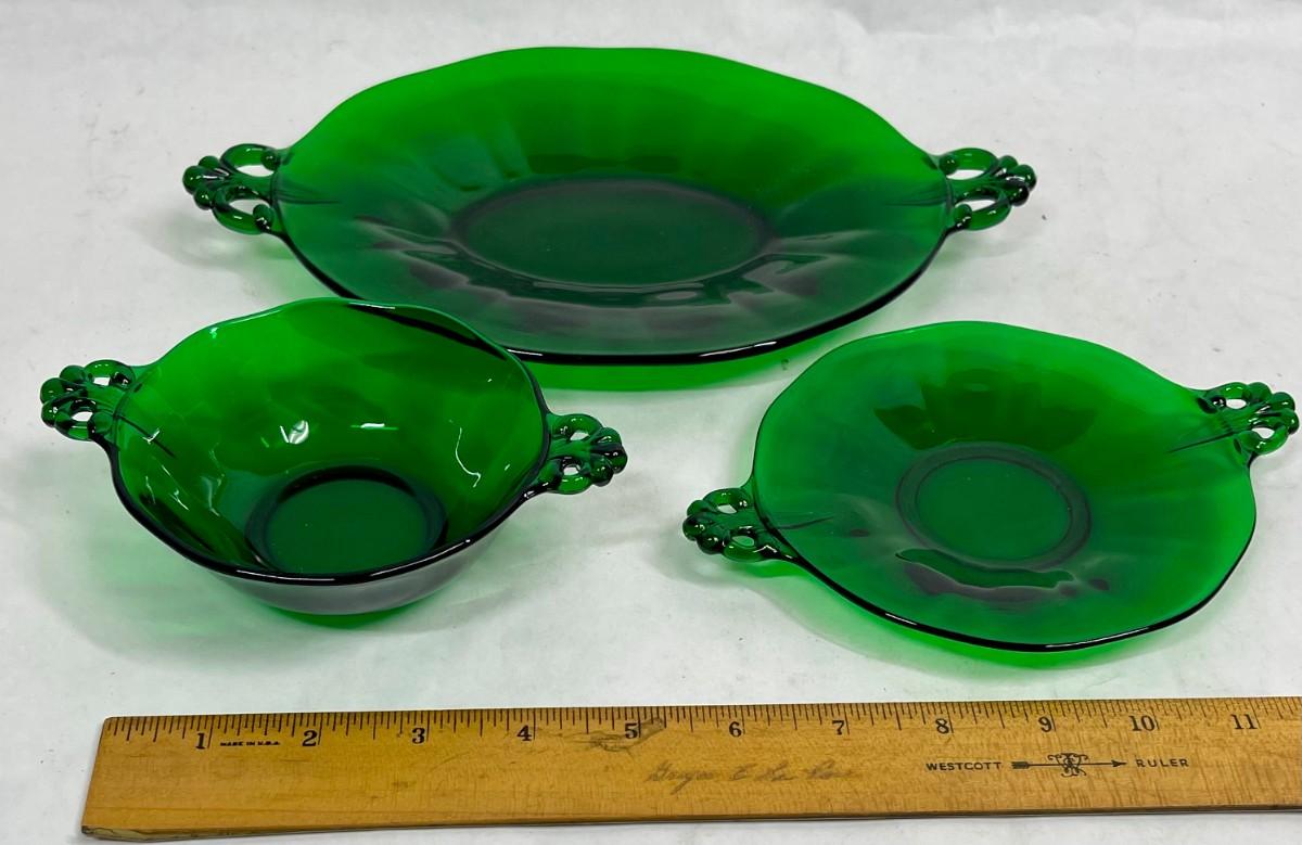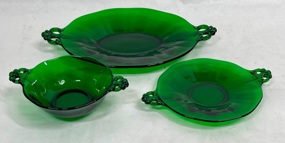 Forest Green Glass Fostoria Lafeyette 3 pc set with handles