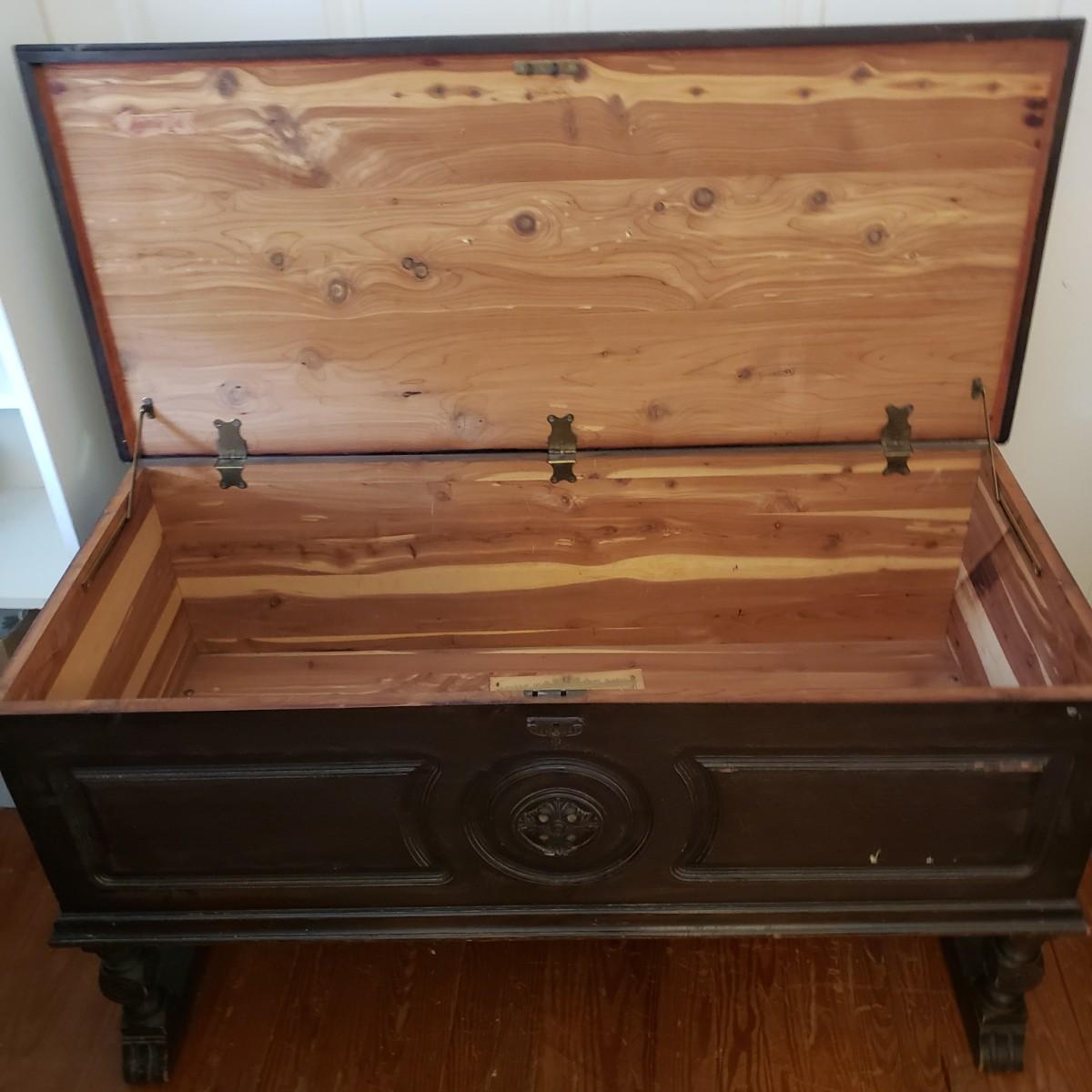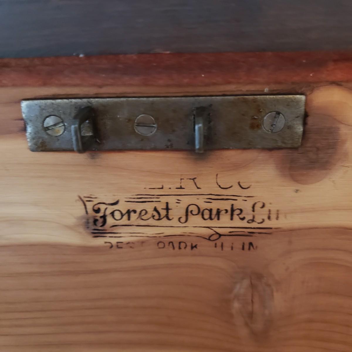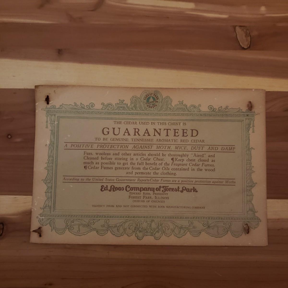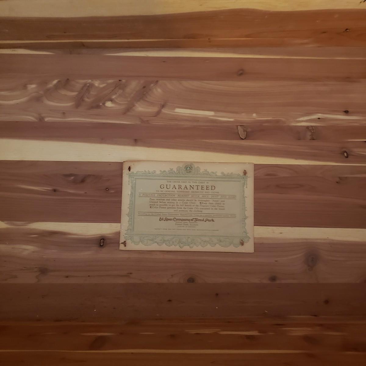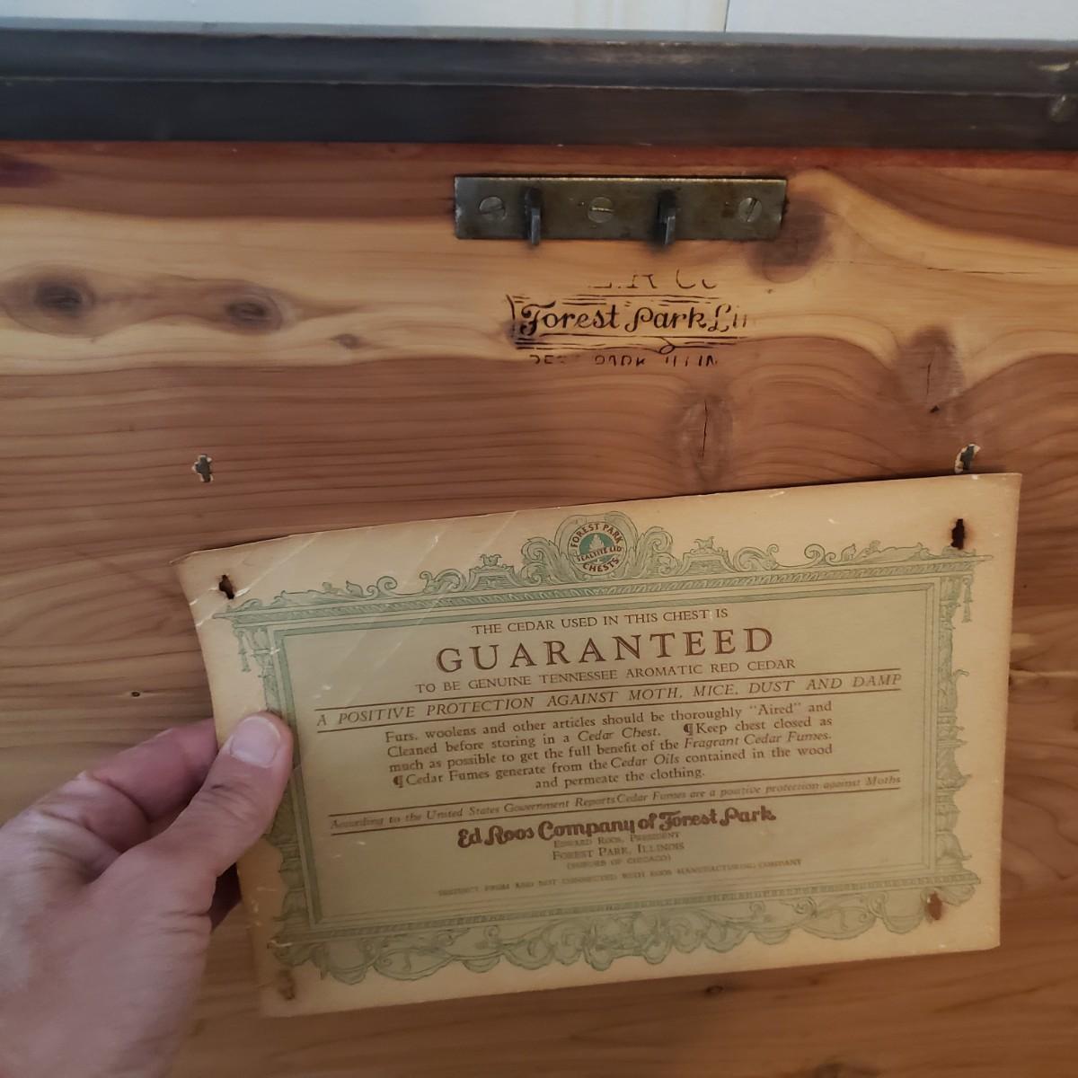 This is a Forest Park Cedar Chest from Illinois. The chest measures 48" x 21" x 26"H. The paper guarantee has come off the staples, see picture. There is a lock, but no key. There is wear on the top and sides, yet that is cosmetic. This would be perfect for the six quilts in another lot in this auction!