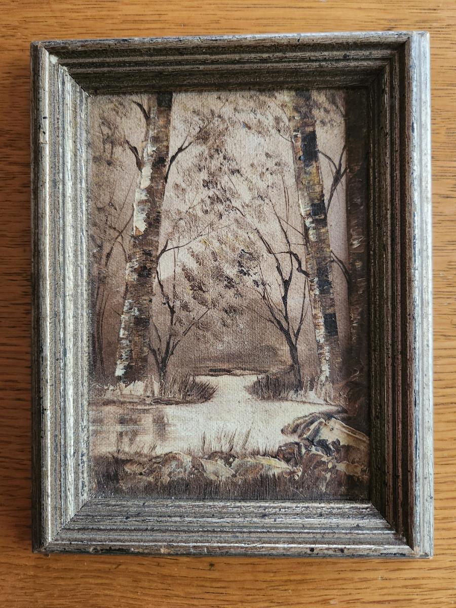 This auction lot is for a small original Forest & Stream Painting in Sephia Tone. Newer rendition, nicely executed in unique brown tones. No signature on the painting. Well framed and ready to hang. See photo for sizing.
