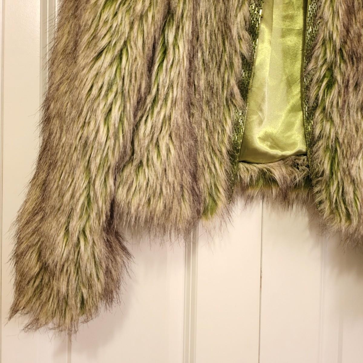 Green, white & black faux fur , short over coat. Six hook front closure. Glass bead trim. Green satin lined. Size Medium. 16" shoulder to shoulder, 21" long, sleeves are 24" long.