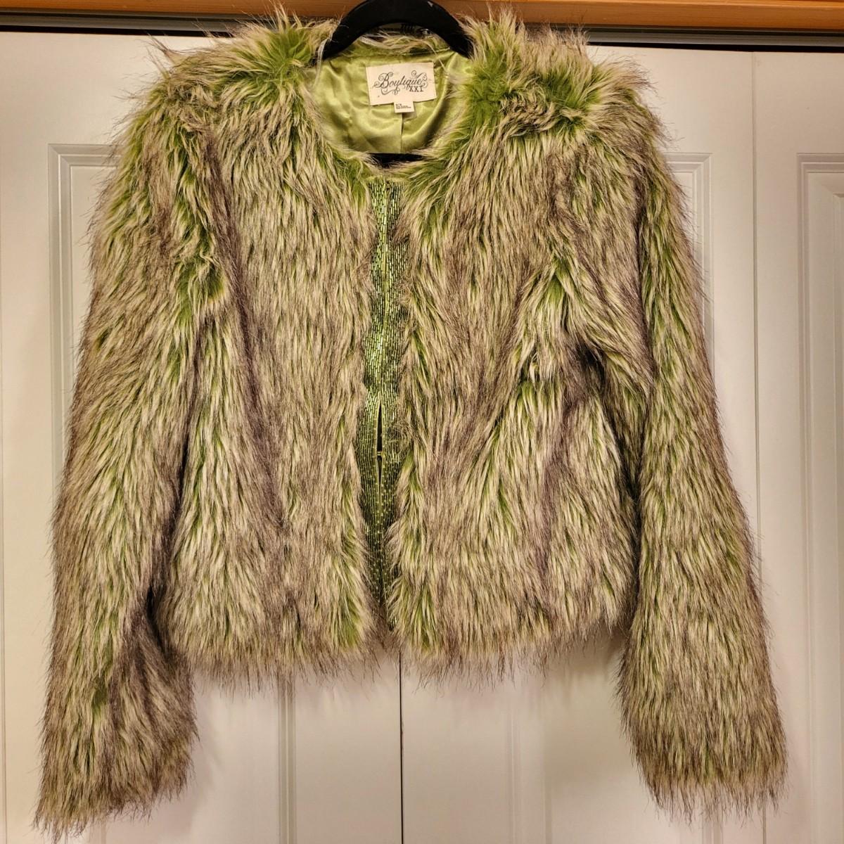 Green, white & black faux fur , short over coat. Six hook front closure. Glass bead trim. Green satin lined. Size Medium. 16" shoulder to shoulder, 21" long, sleeves are 24" long.