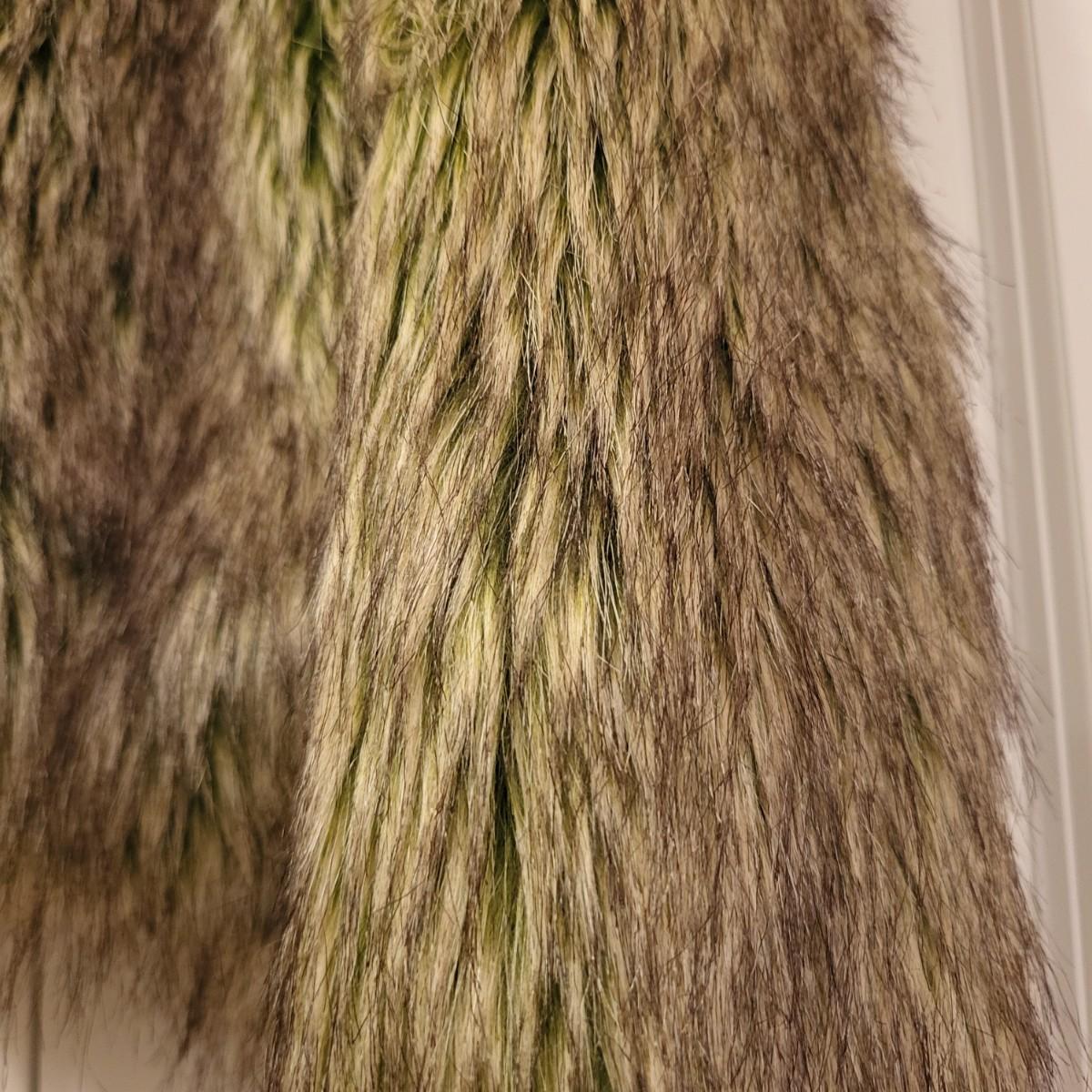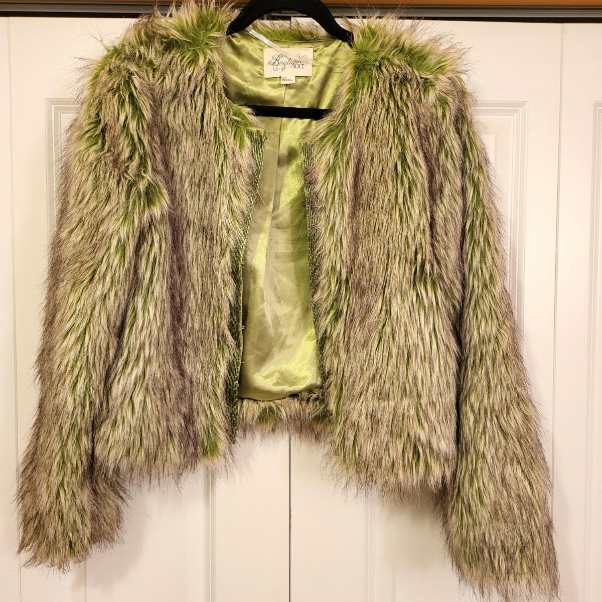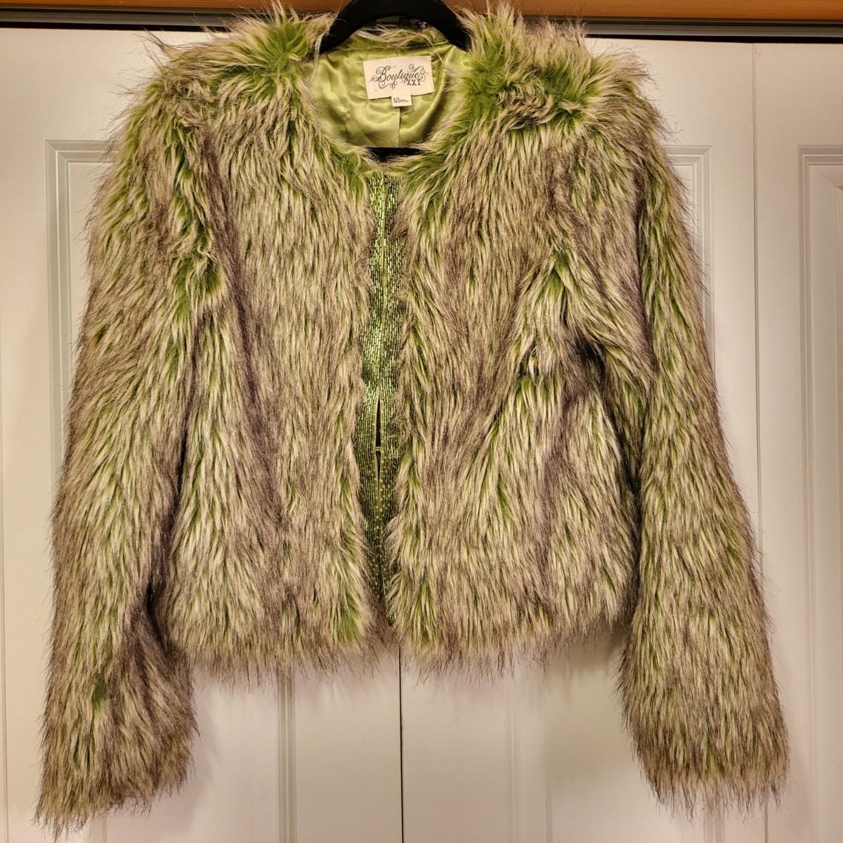 Green, white & black faux fur , short over coat. Six hook front closure. Glass bead trim. Green satin lined. Size Medium. 16" shoulder to shoulder, 21" long, sleeves are 24" long.