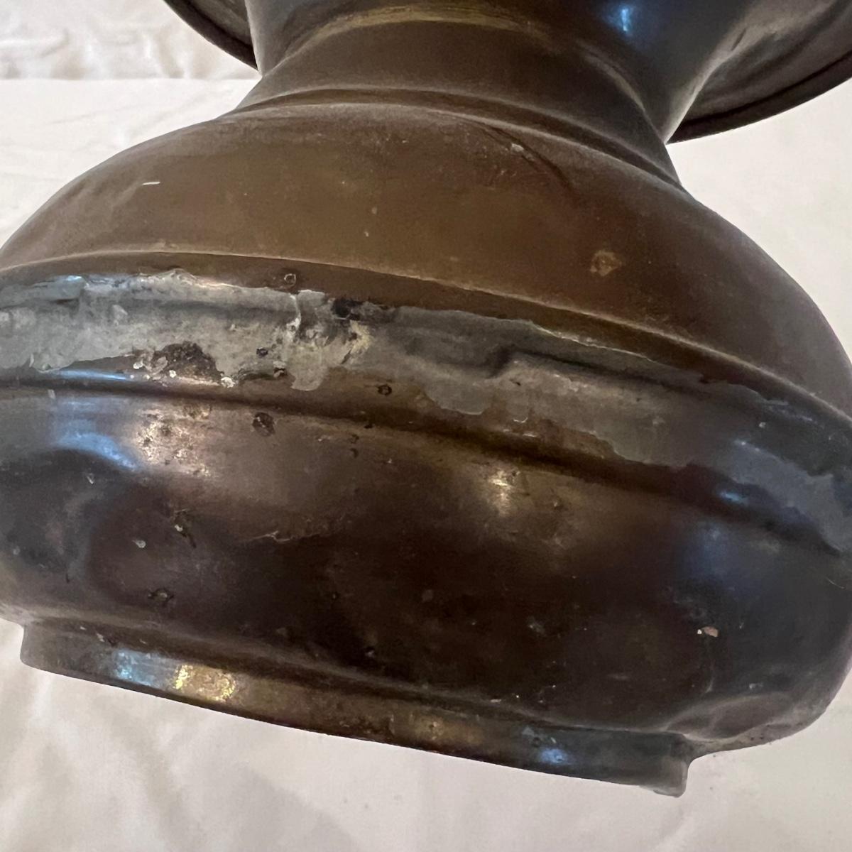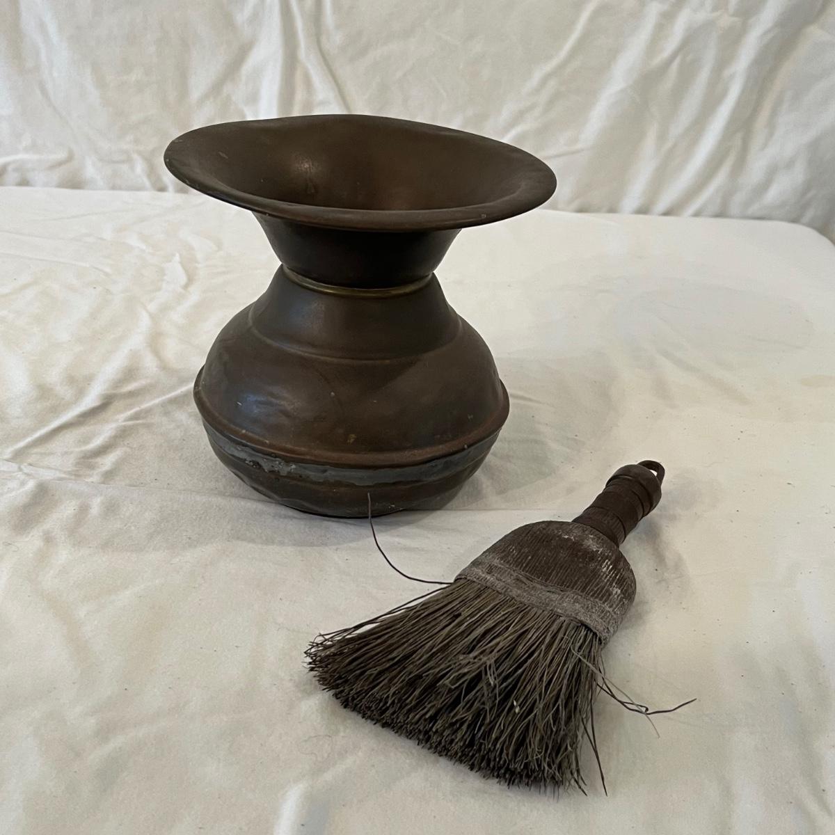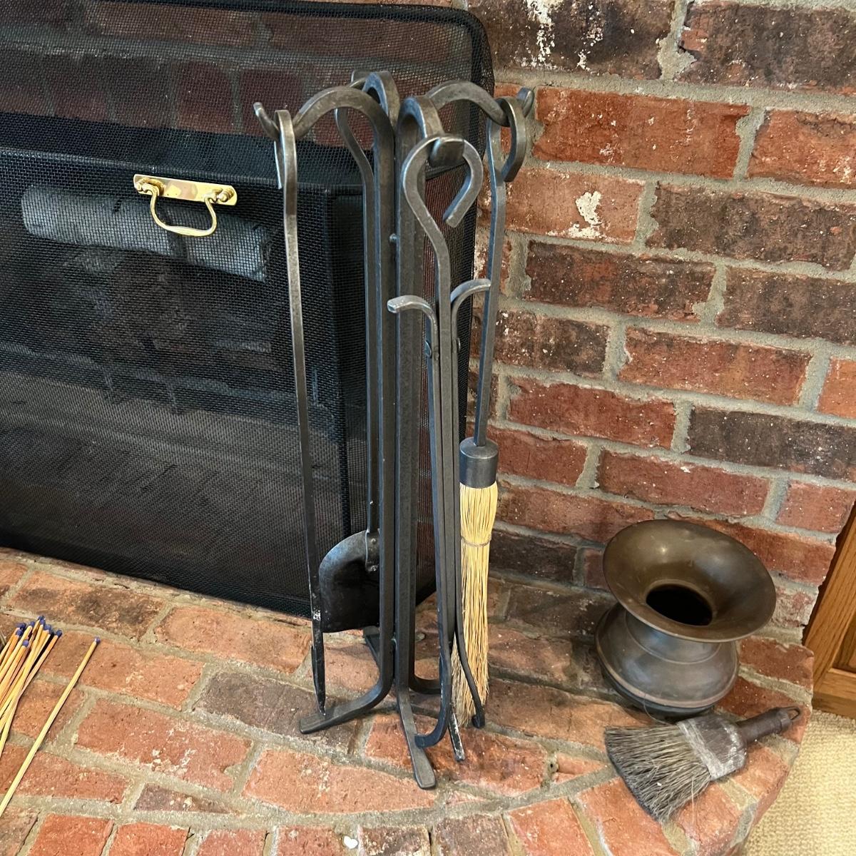 This heavy duty wrought iron set includes four fireplace tools; it measures approximately 9” x 9” x 27”H. Also included is a small brush, matches and an old metal spitoon; note that it has a few dents.
