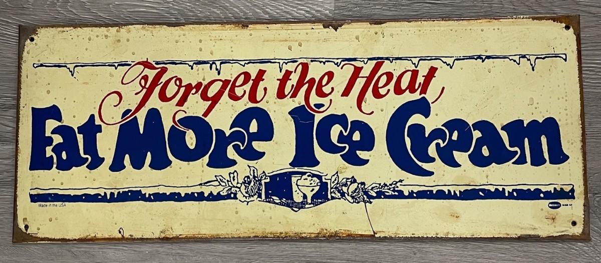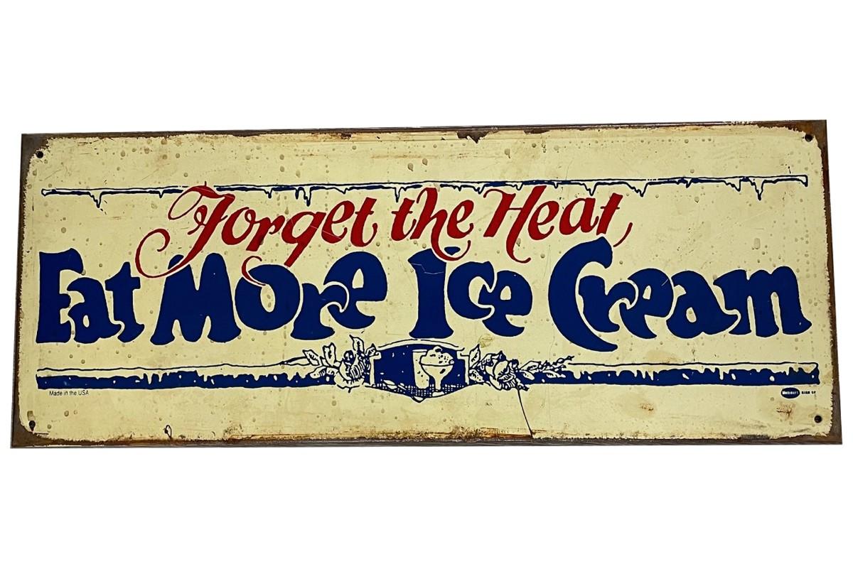 Description: Forget the Heat Eat More Ice Cream Advertising Sign. Measures approximately: 18 X 7 Inches. Material : Metal.