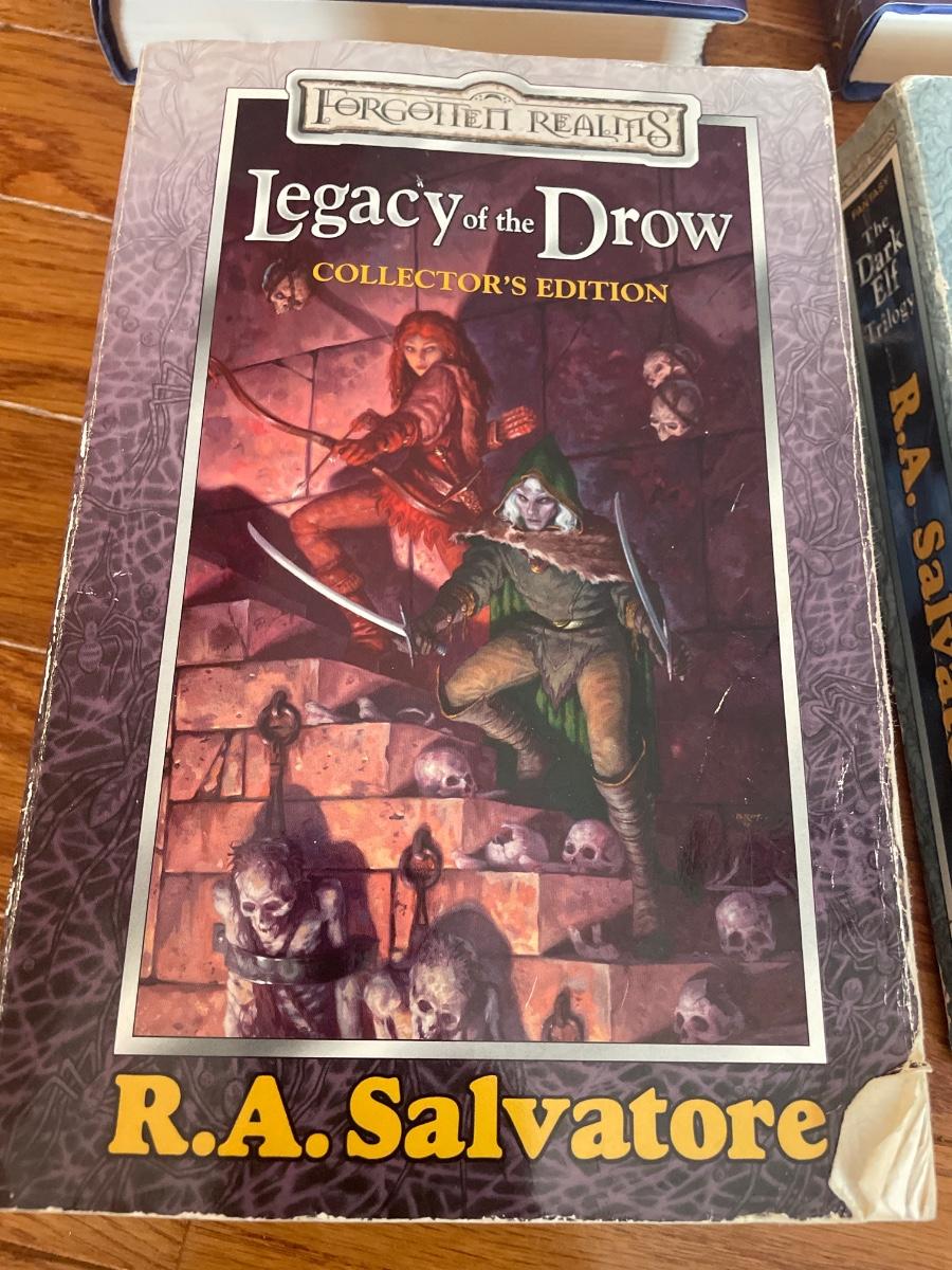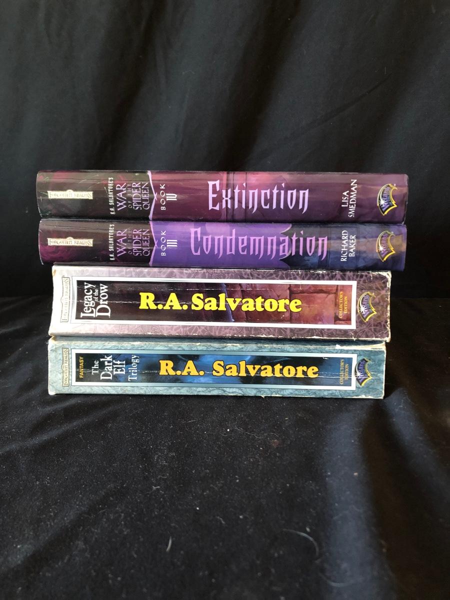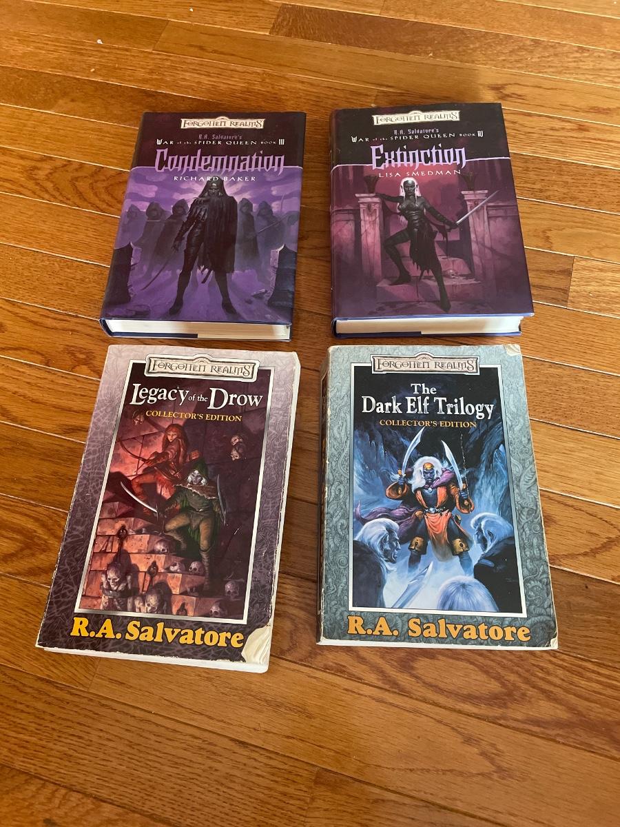 War of the Spider Queen book 3 and 4, hardback. Legacy of the Drow, And the Dark Elf Triology (both collectors additions), paperback. All 4 written by R.A Salvatore.