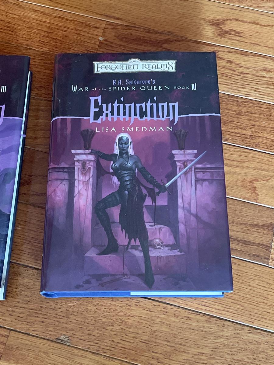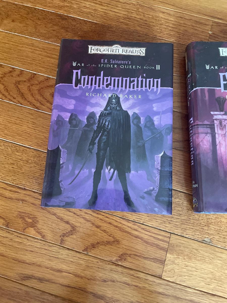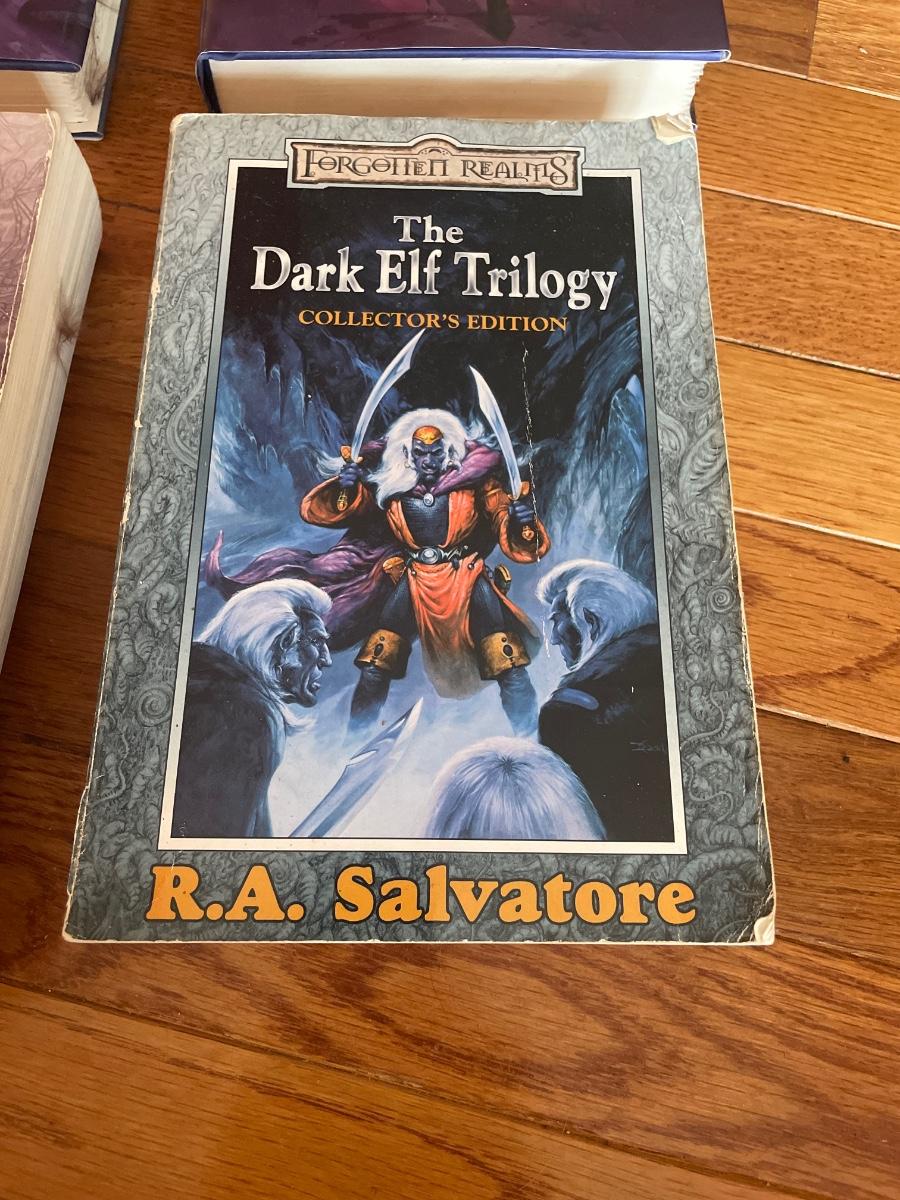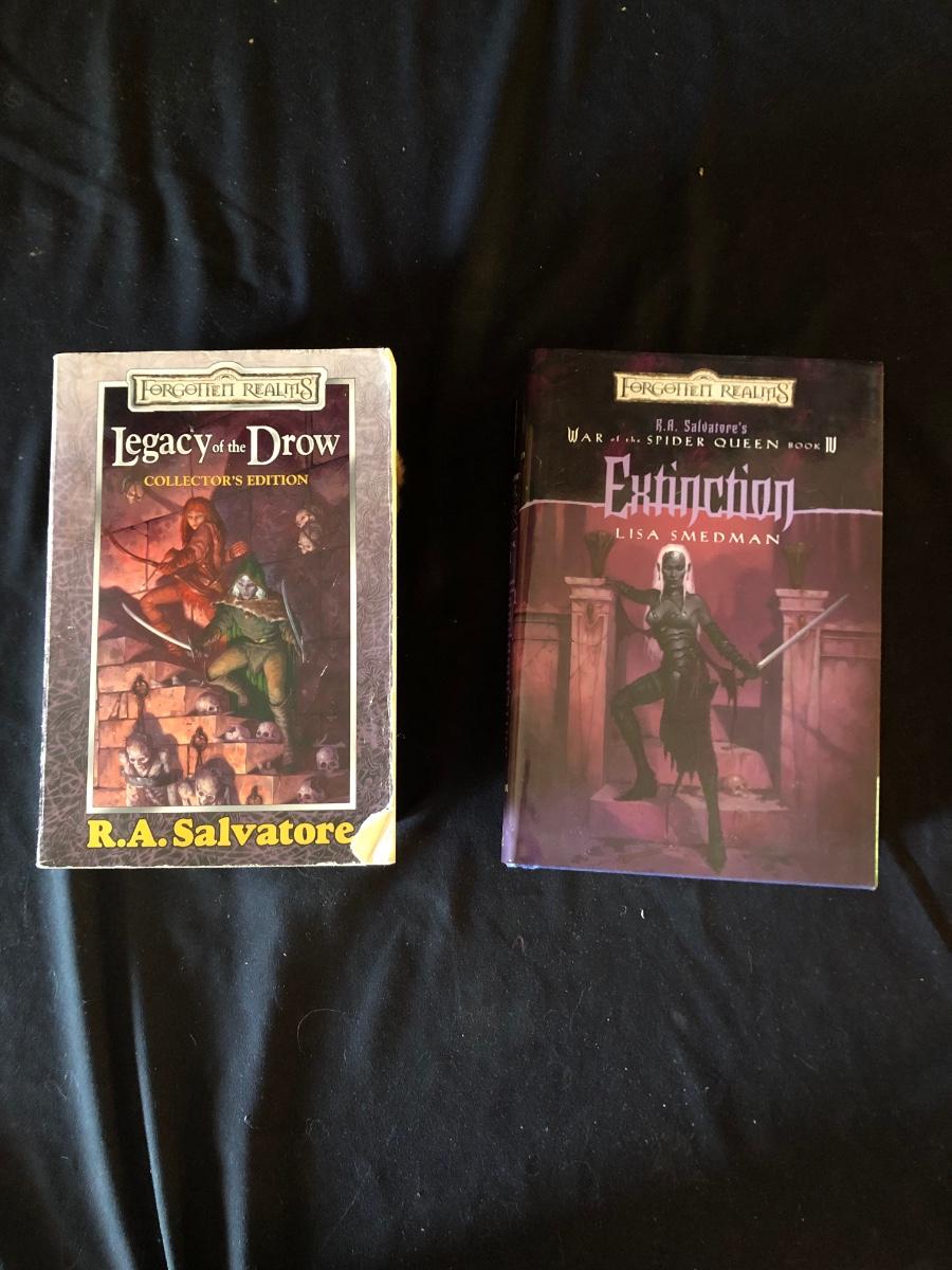 War of the Spider Queen book 3 and 4, hardback. Legacy of the Drow, And the Dark Elf Triology (both collectors additions), paperback. All 4 written by R.A Salvatore.