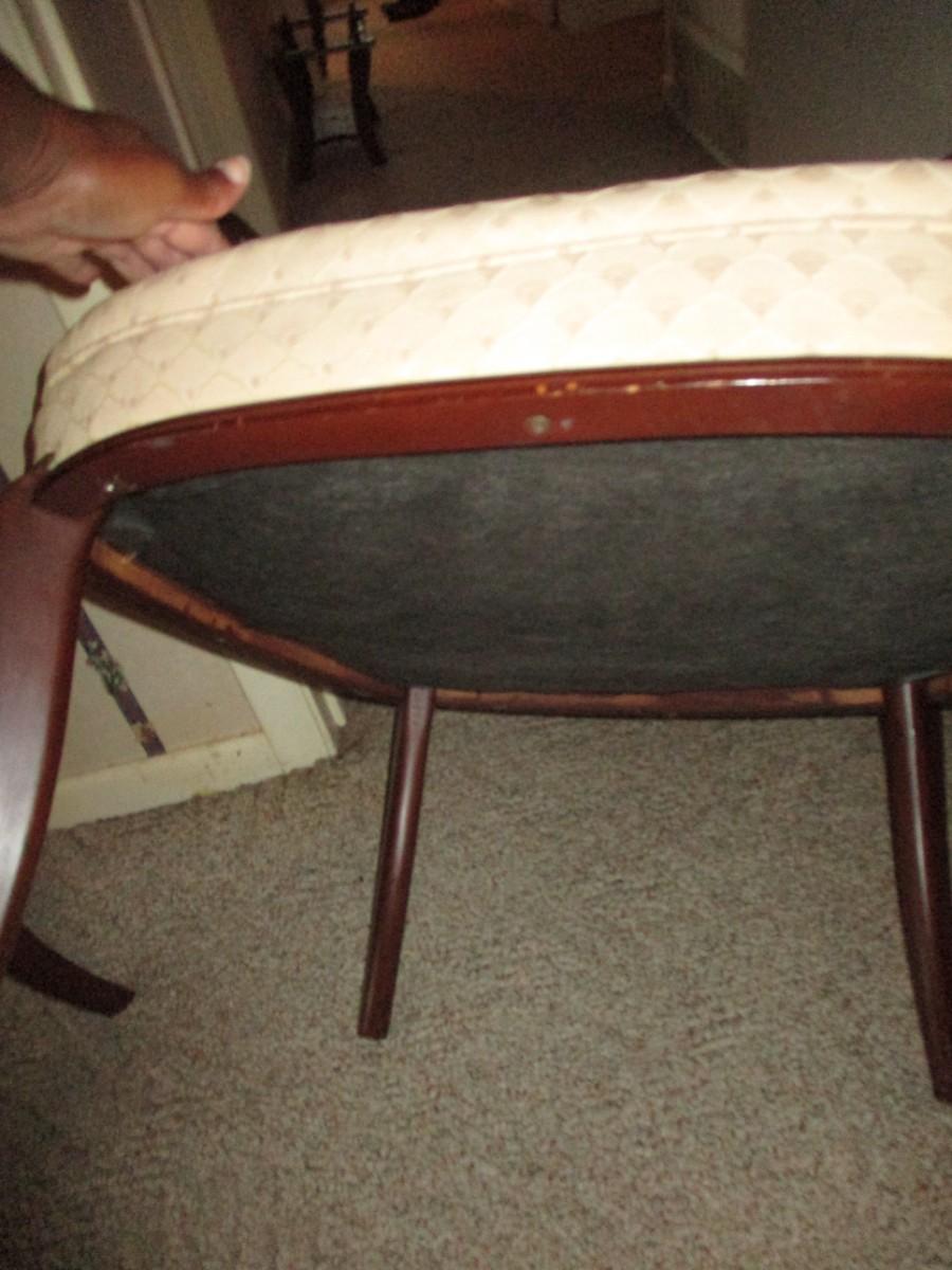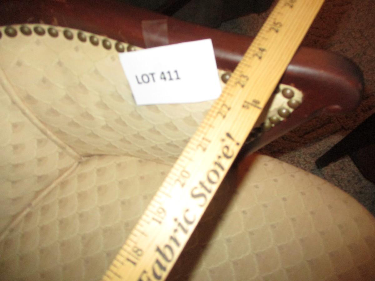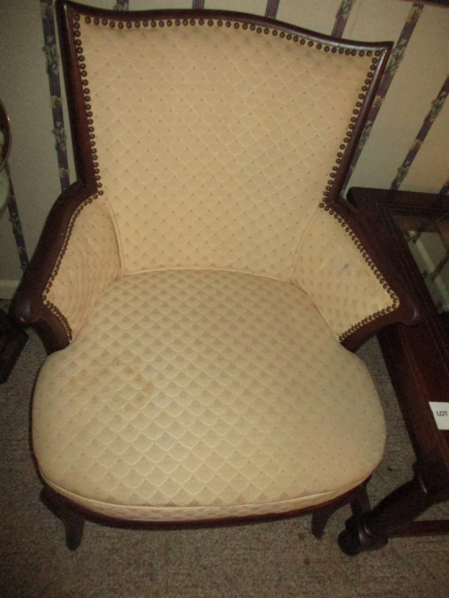 Upholstered cream w/cherry wood trim. Minor cleaning needed. Sturdy. Great condition.