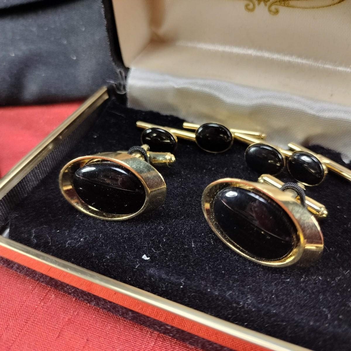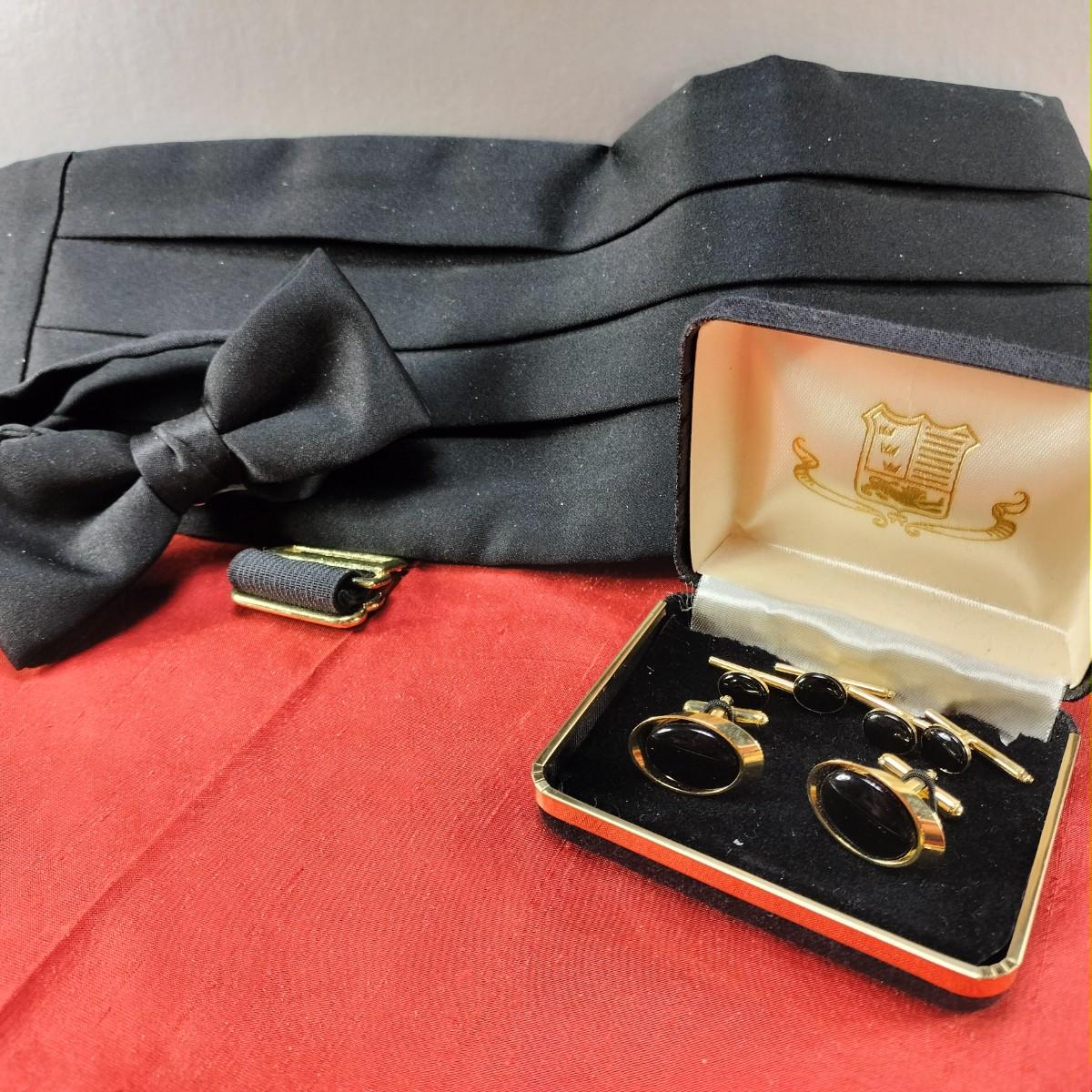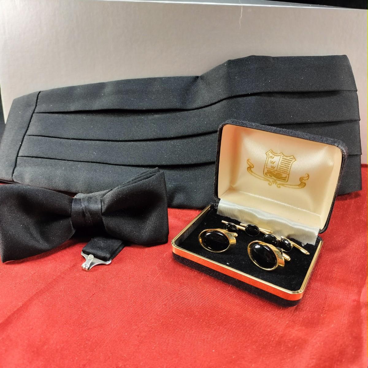 This auction lot is for Formal Attire Accoutrements. This offering is a set of black satin cumberbun & bow tie with cuff links and studs. If you are dressing up for New Year's Eve or any formal occasion, this will surely help.