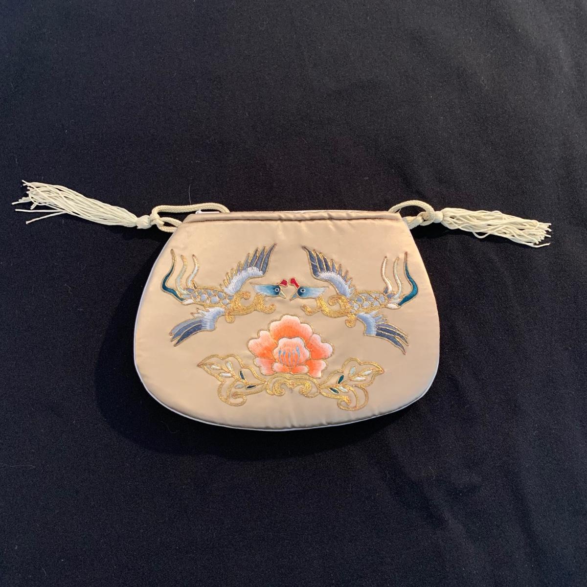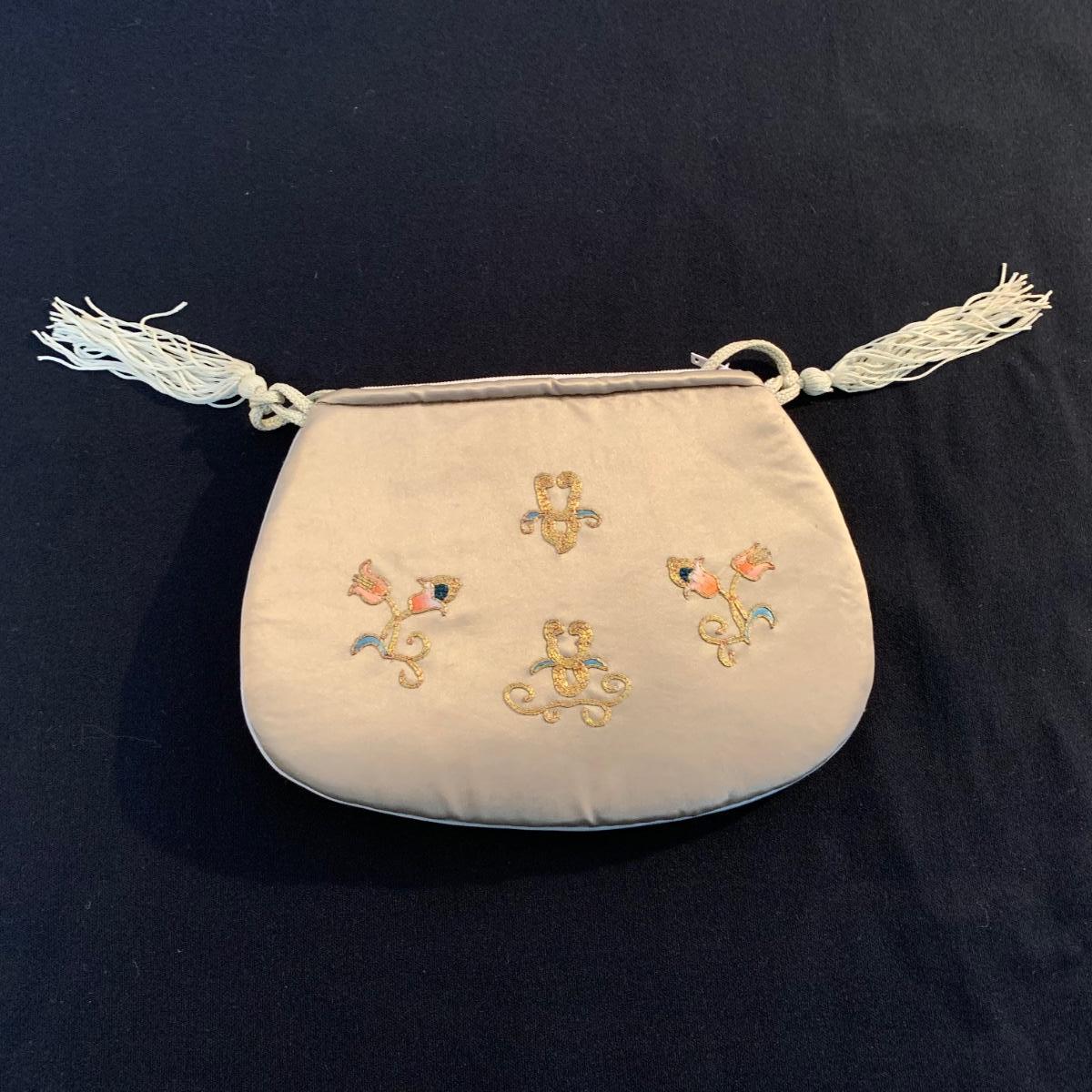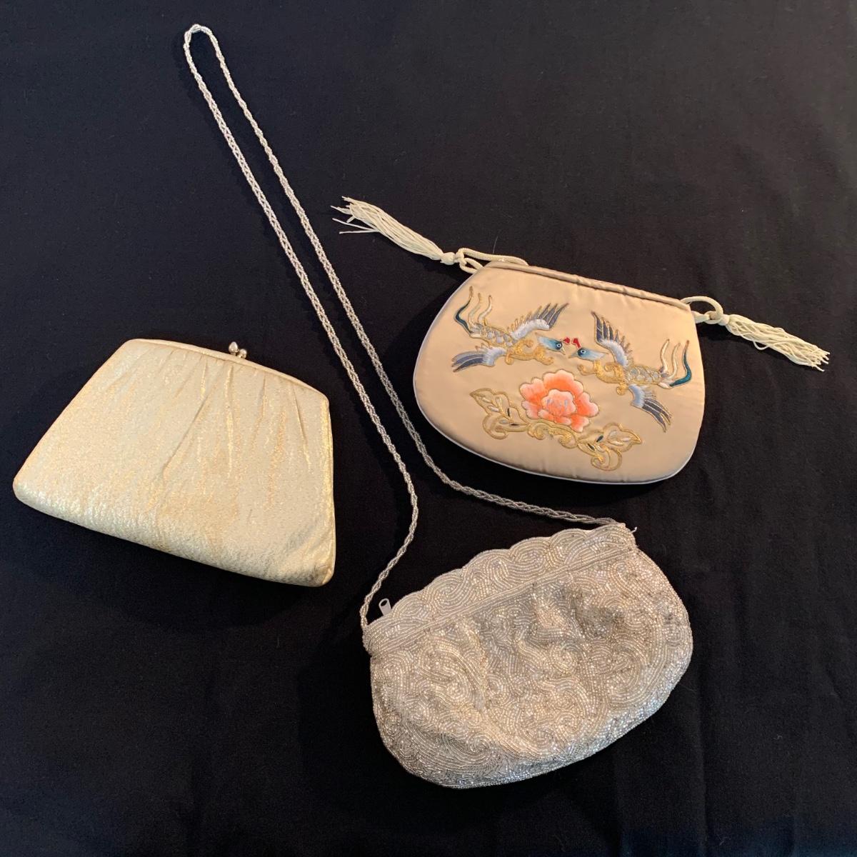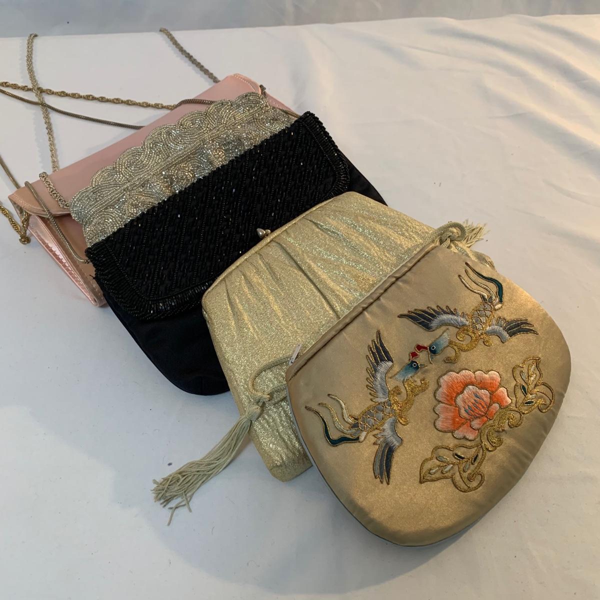 Collection of five formal clutch purses. Includes a pink silk-like clutch with gold braided strap, beaded clutch with seed bead strap, black silk-like clutch with beaded fold, gold-glittered snap clutch, and silk-like embroidered bird clutch with tassels. Pink clutch has some discoloration from time, otherwise items are in good condition. This lot can complete a variety of formal looks!