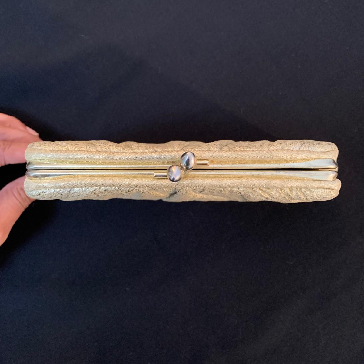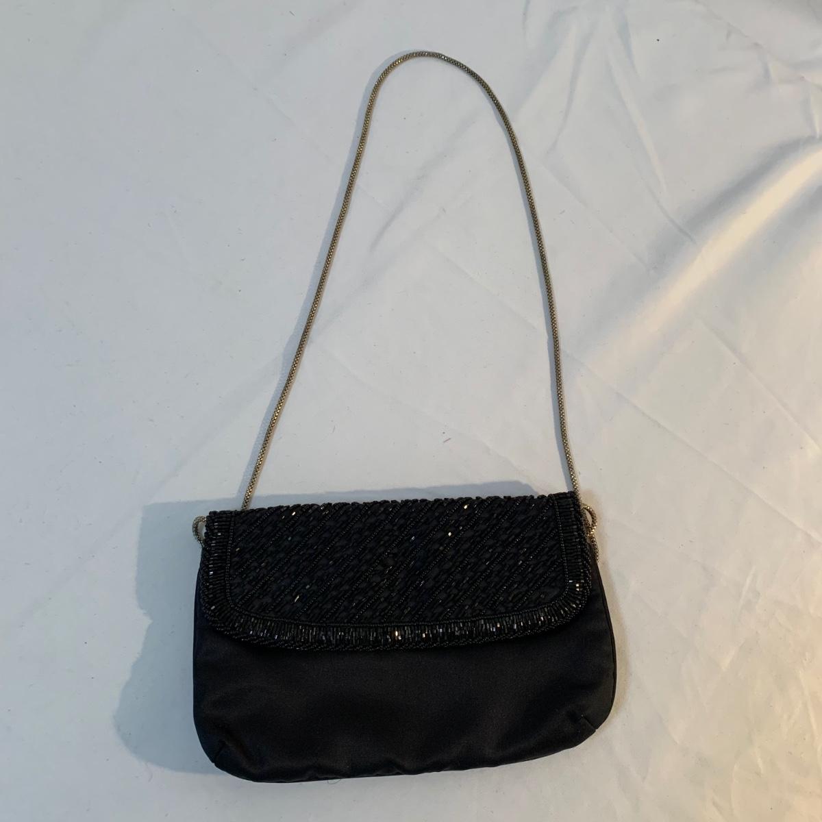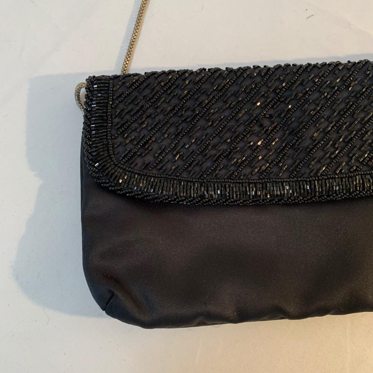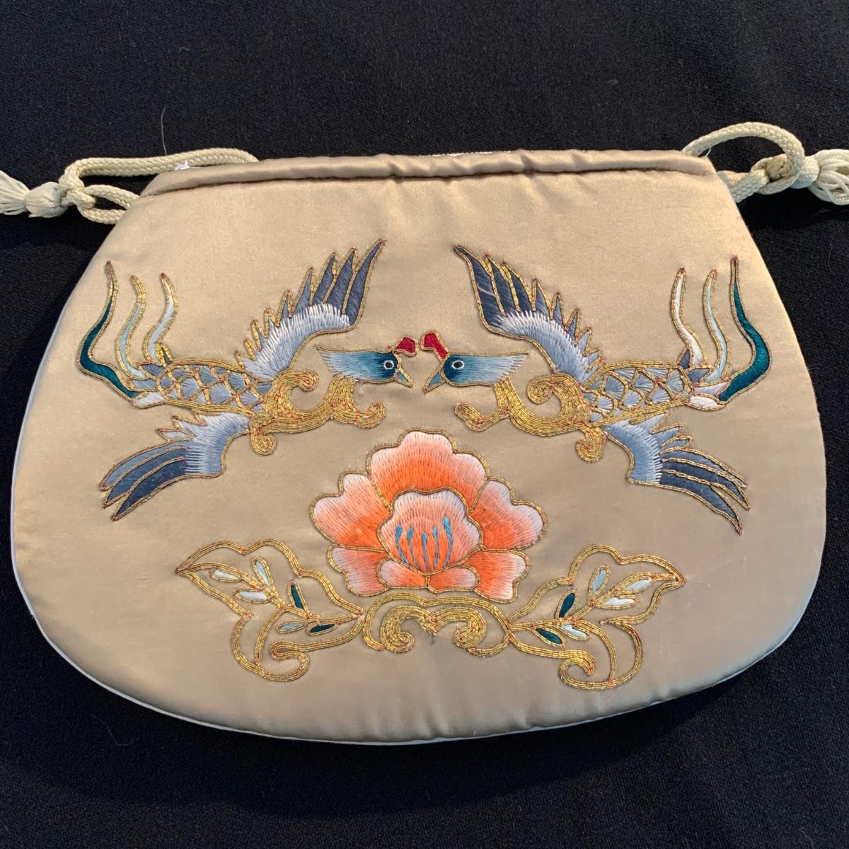 Collection of five formal clutch purses. Includes a pink silk-like clutch with gold braided strap, beaded clutch with seed bead strap, black silk-like clutch with beaded fold, gold-glittered snap clutch, and silk-like embroidered bird clutch with tassels. Pink clutch has some discoloration from time, otherwise items are in good condition. This lot can complete a variety of formal looks!