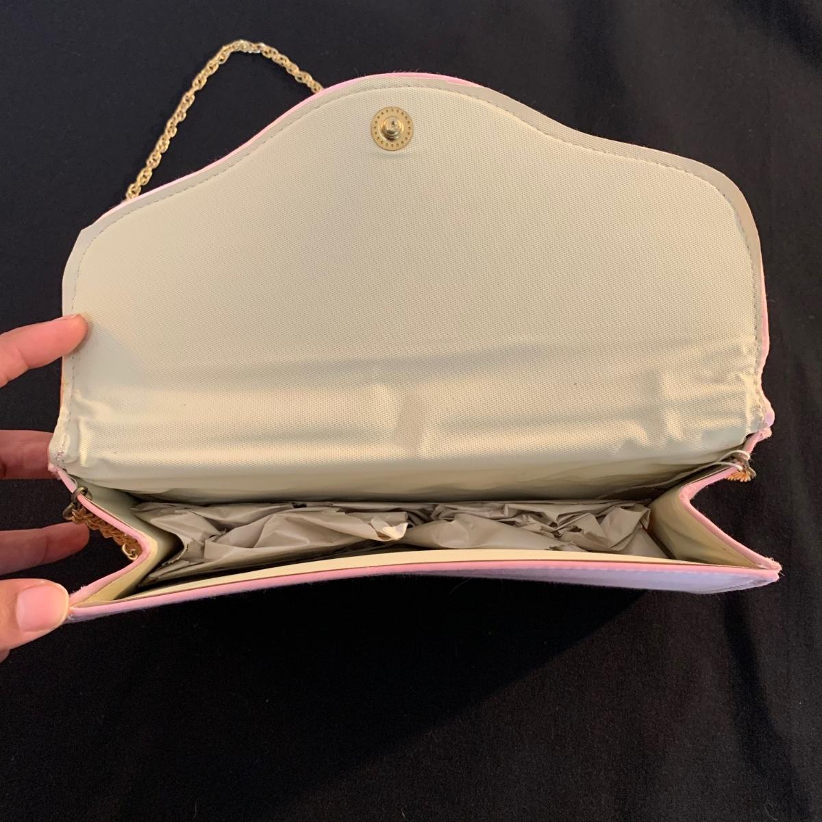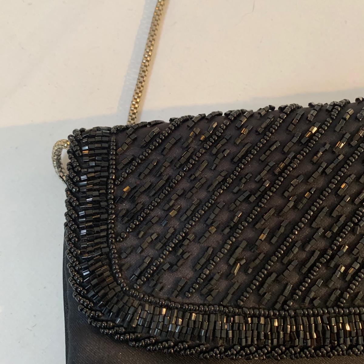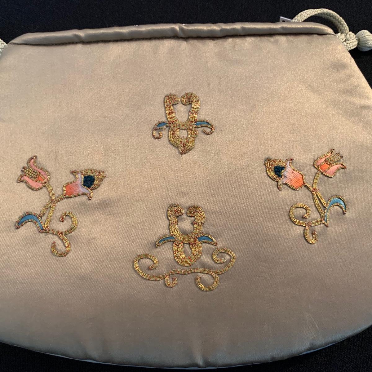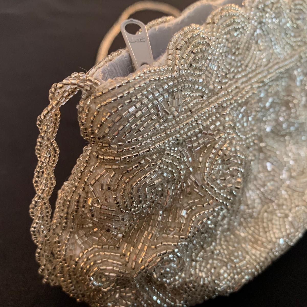 Collection of five formal clutch purses. Includes a pink silk-like clutch with gold braided strap, beaded clutch with seed bead strap, black silk-like clutch with beaded fold, gold-glittered snap clutch, and silk-like embroidered bird clutch with tassels. Pink clutch has some discoloration from time, otherwise items are in good condition. This lot can complete a variety of formal looks!