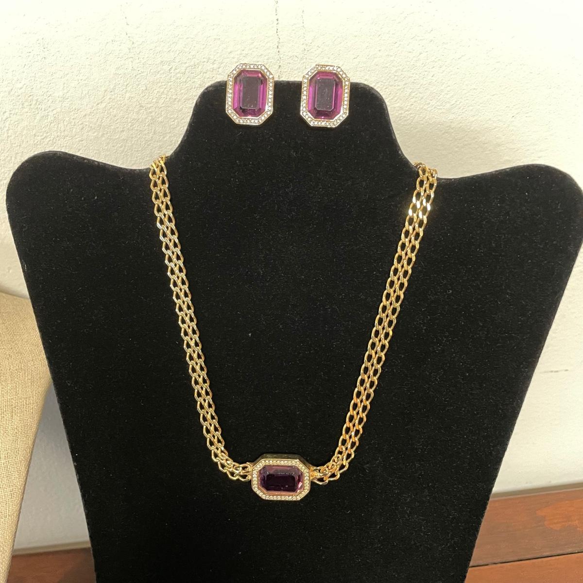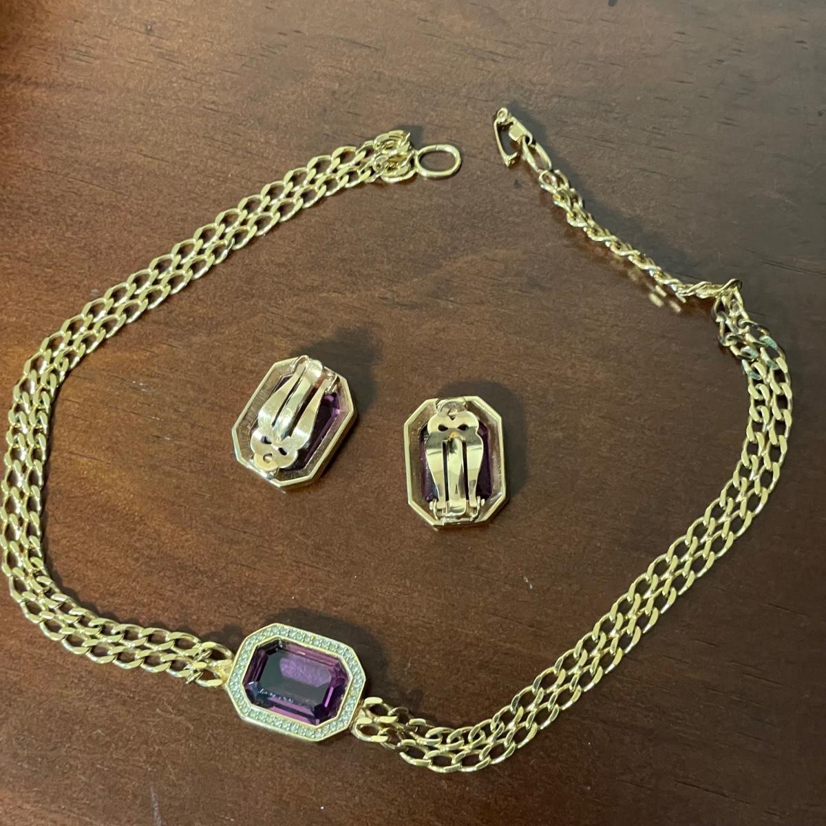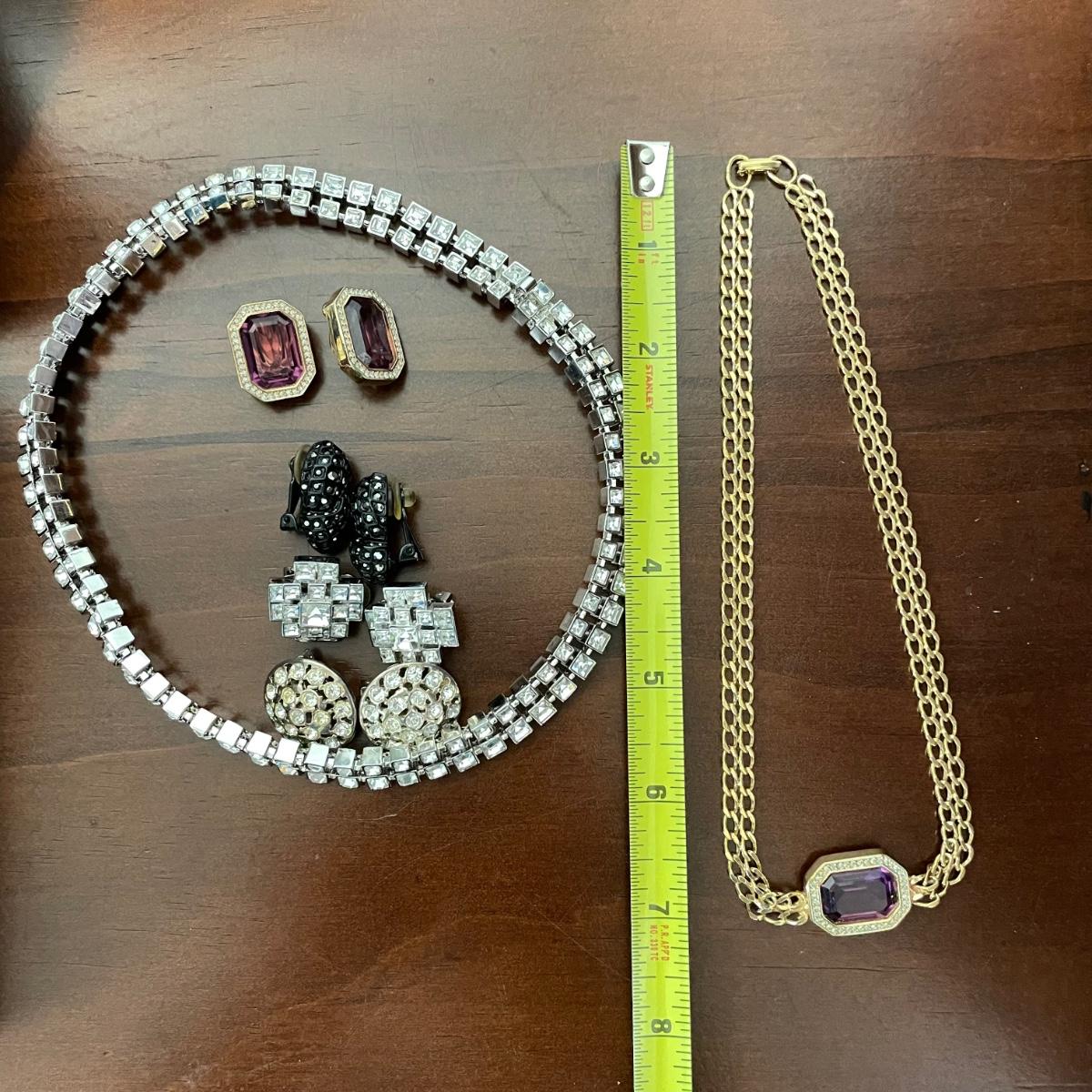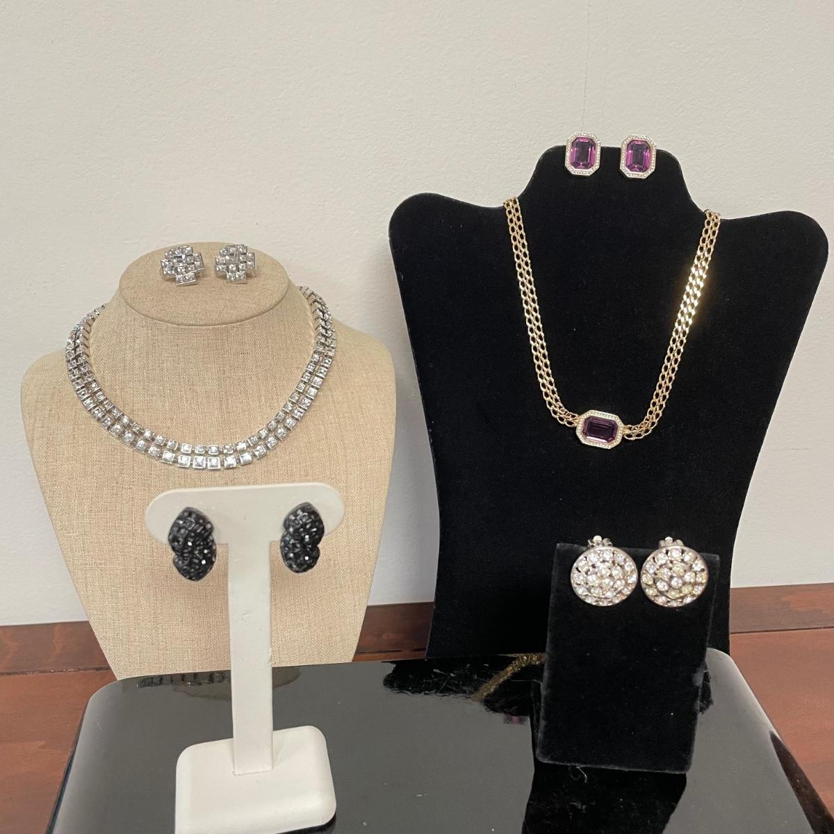 Formal sets and clip earrings. Lot includes a crystal clear rhinestone set with clip earrings and a necklace, as well as another pair of elegant black earrings all marked St John. Lot also includes a gold colored necklace and clip earring set with clear purple/pink gemstone settings and another pair of rhinestone clip earrings. See images. Shipping available. All sales are final. No returns or refunds. Please bid accordingly.