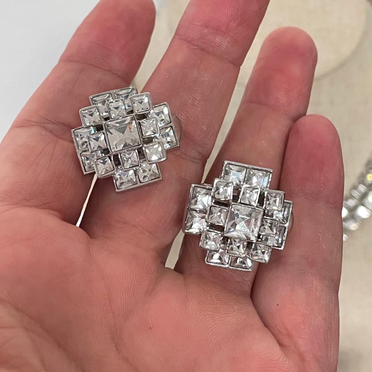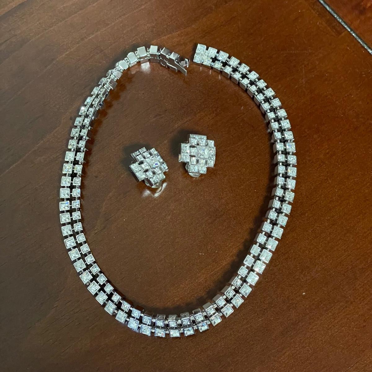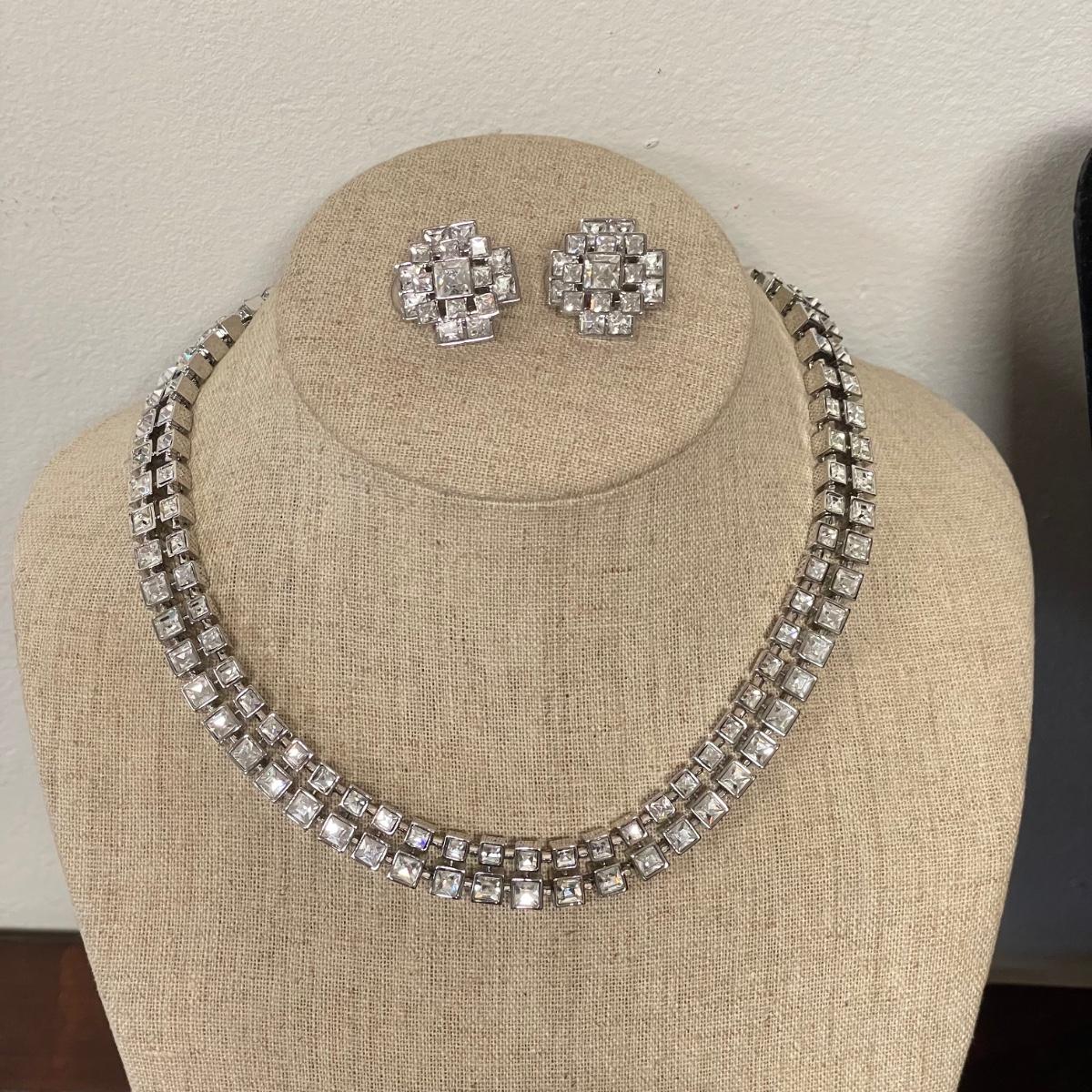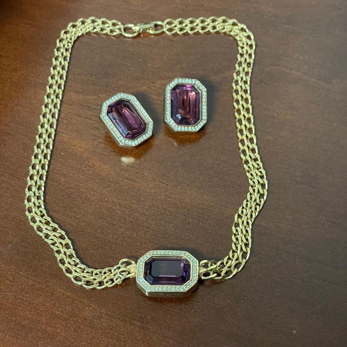 Formal sets and clip earrings. Lot includes a crystal clear rhinestone set with clip earrings and a necklace, as well as another pair of elegant black earrings all marked St John. Lot also includes a gold colored necklace and clip earring set with clear purple/pink gemstone settings and another pair of rhinestone clip earrings. See images. Shipping available. All sales are final. No returns or refunds. Please bid accordingly.