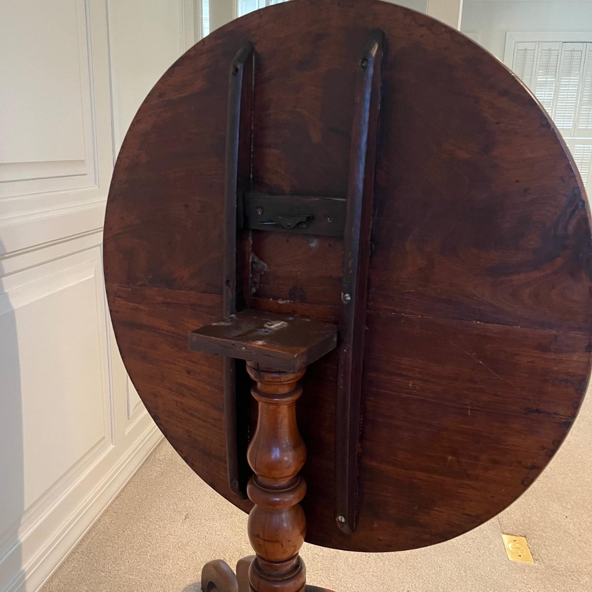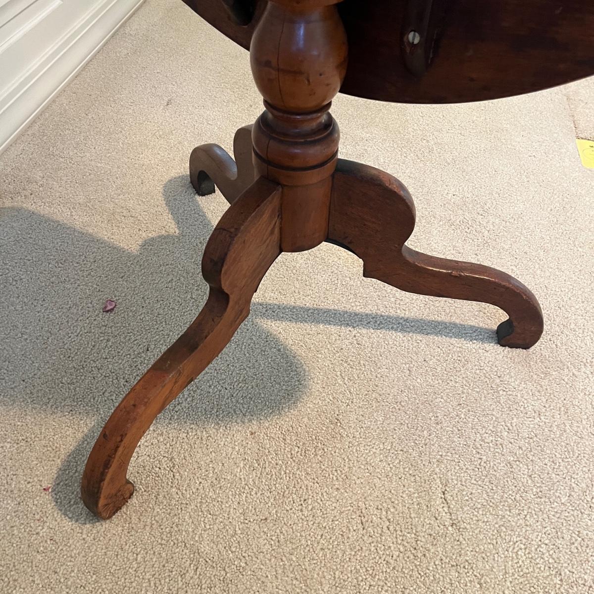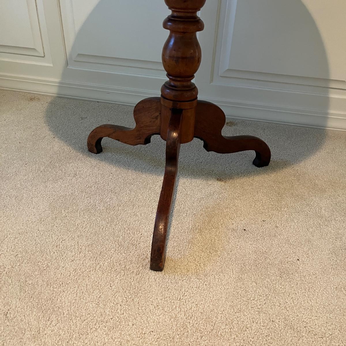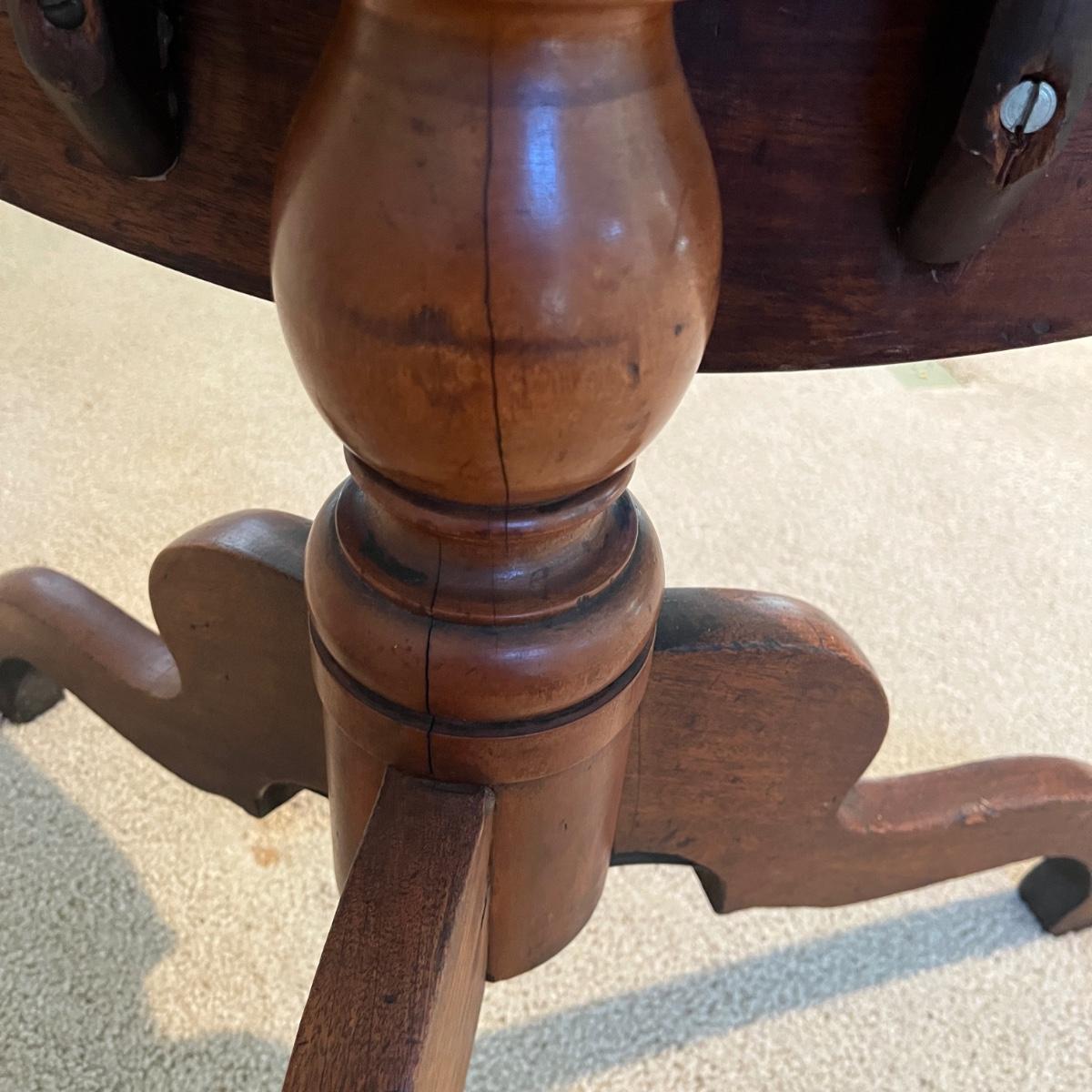 Lot includes an antique formal tilt top table. Table measures 33”D x 29.5”H. There are some cracks in the base, see pictures.