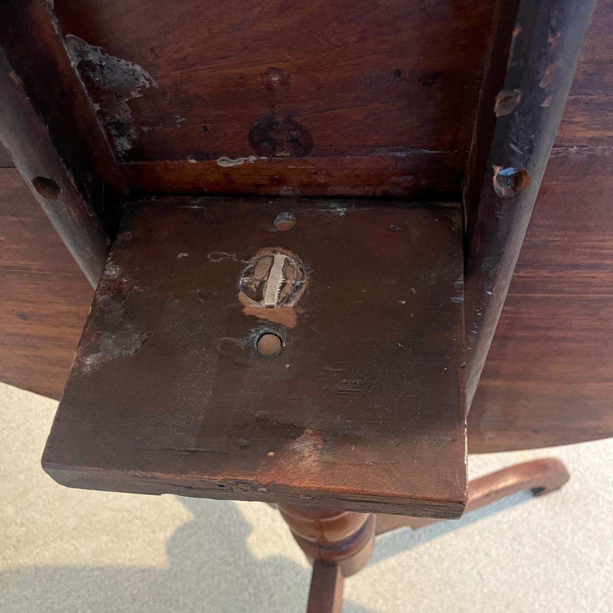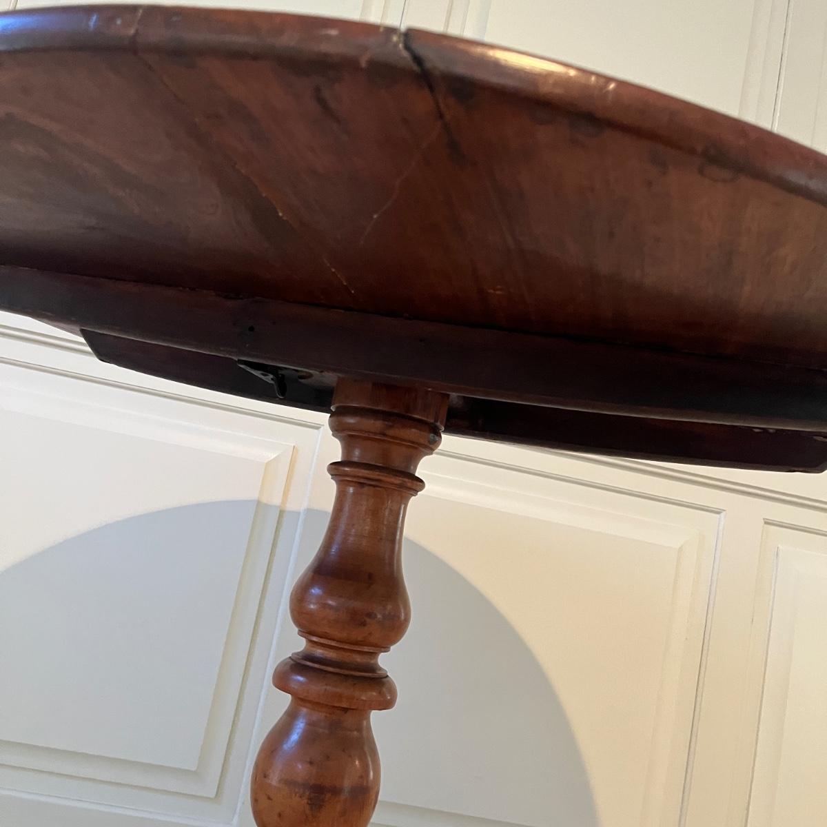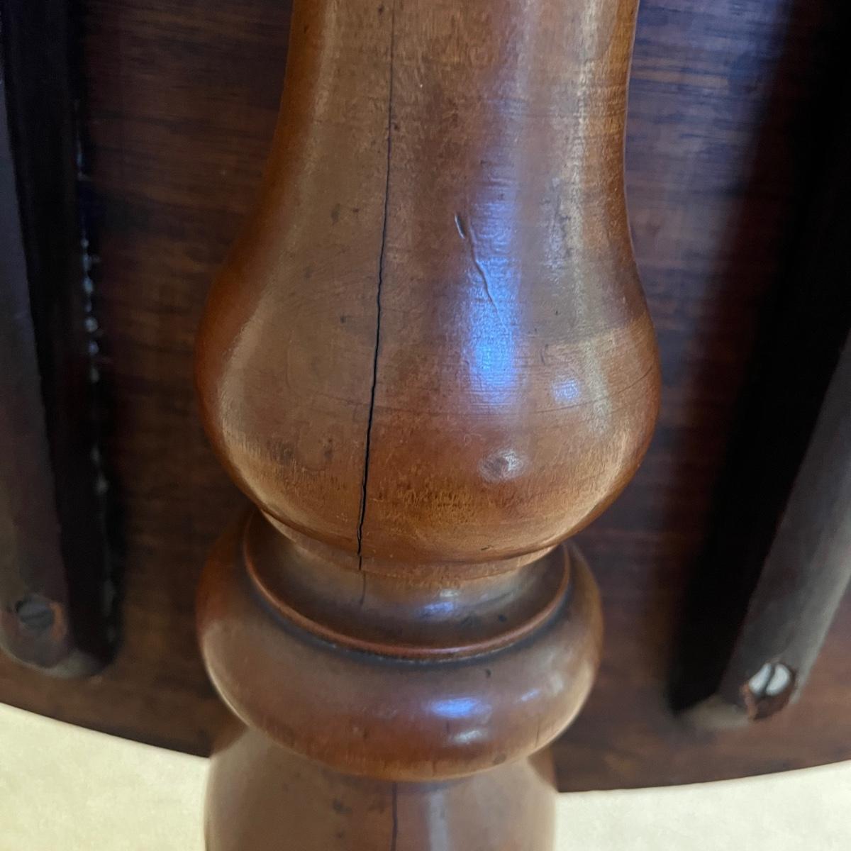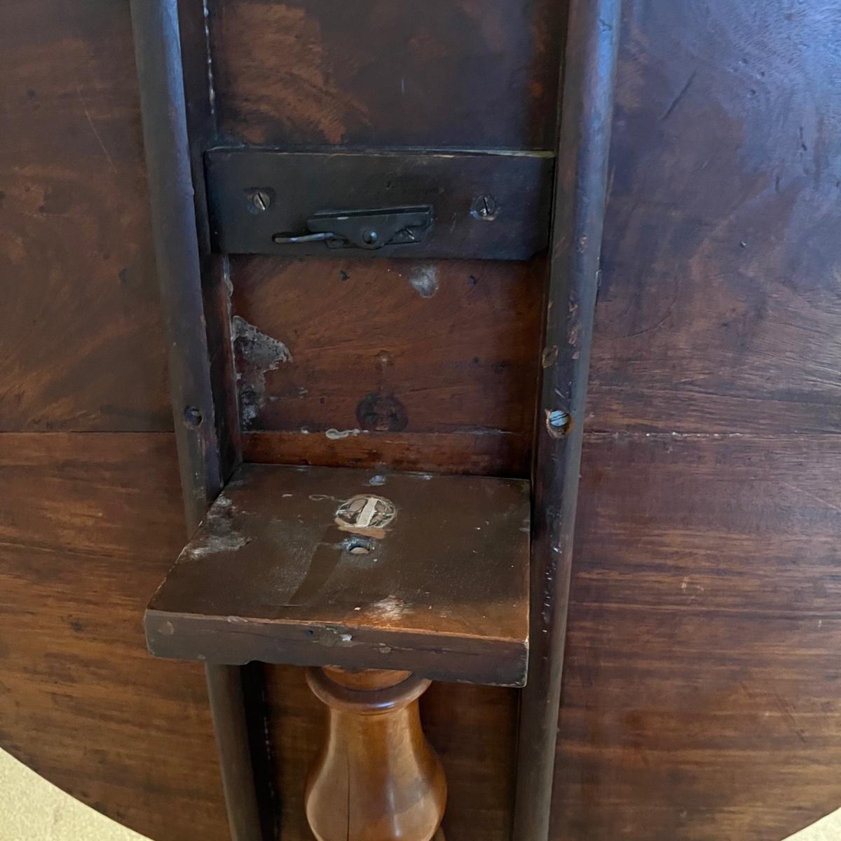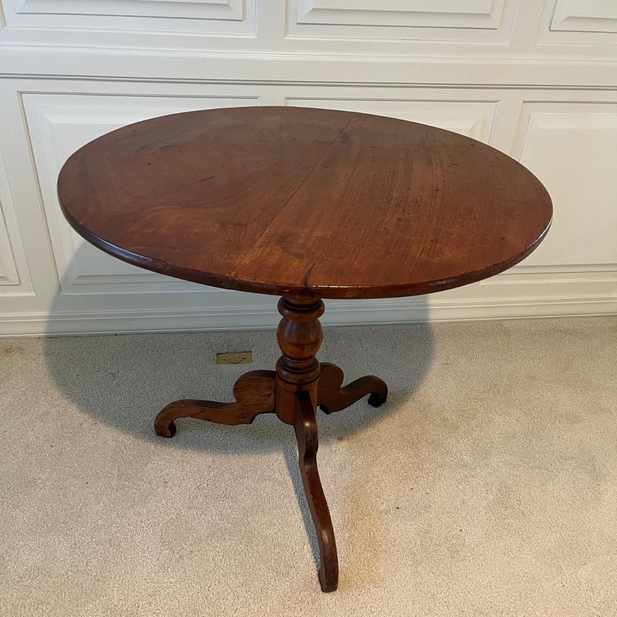 Lot includes an antique formal tilt top table. Table measures 33”D x 29.5”H. There are some cracks in the base, see pictures.