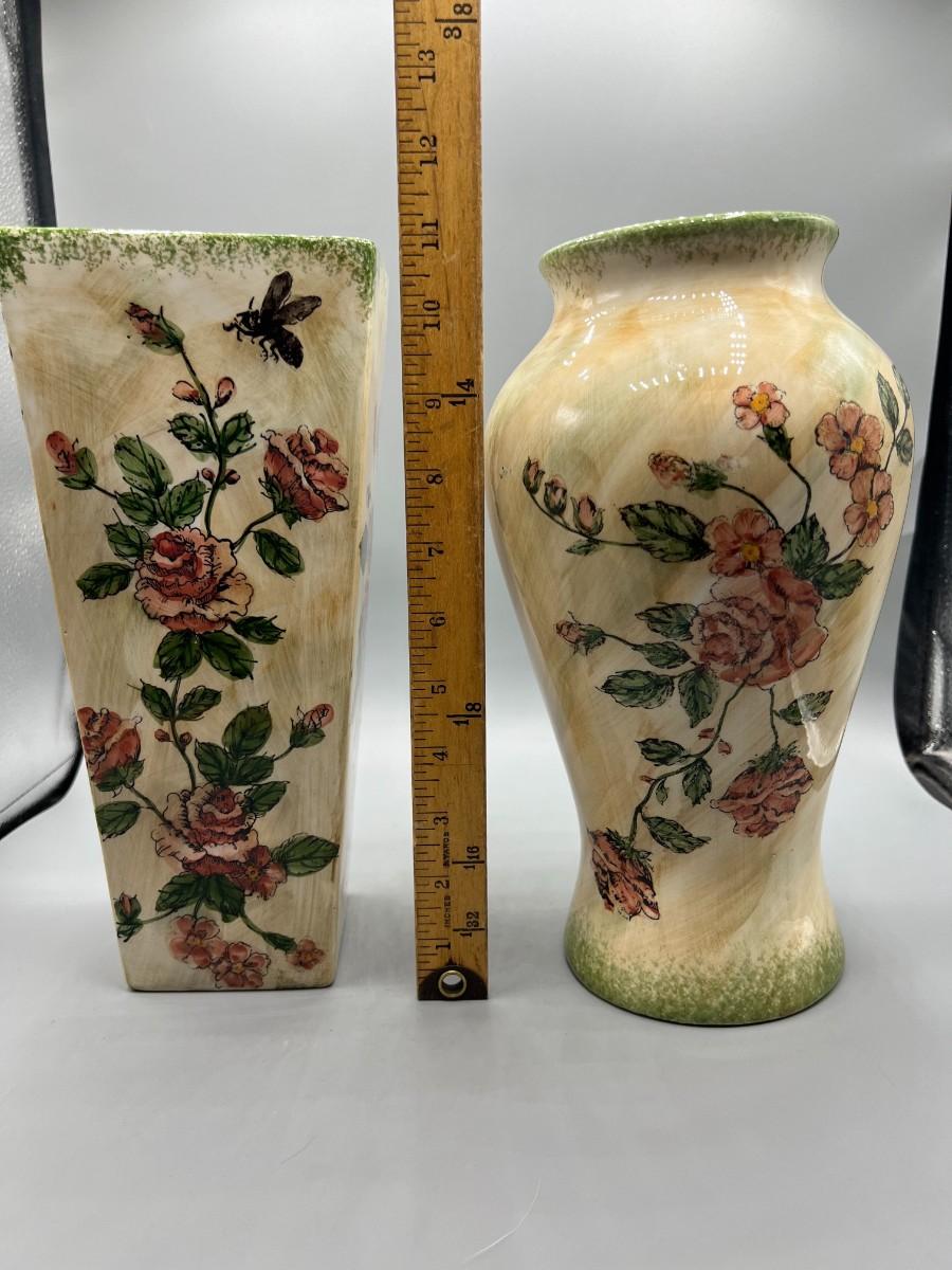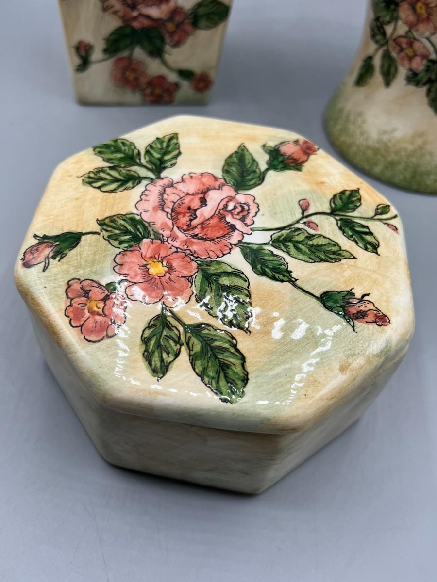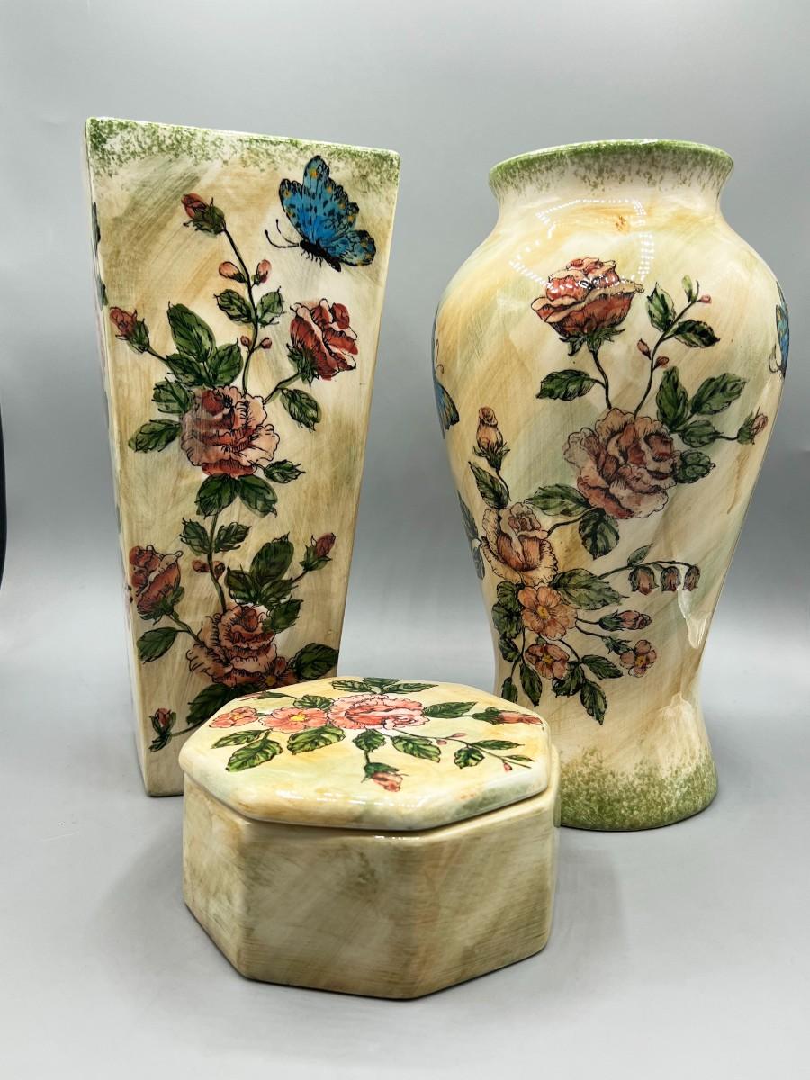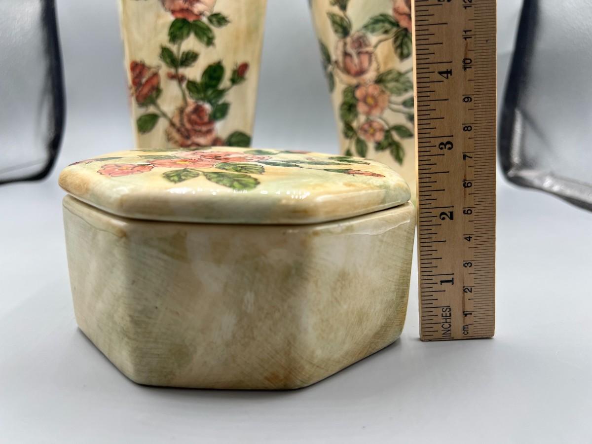 Formalities by Baum Bros. Three Piece Ceramic Decor Set Vases & Lidded Trinket Dish. Pink floral design. Pieces are matching pattern. Good condition.