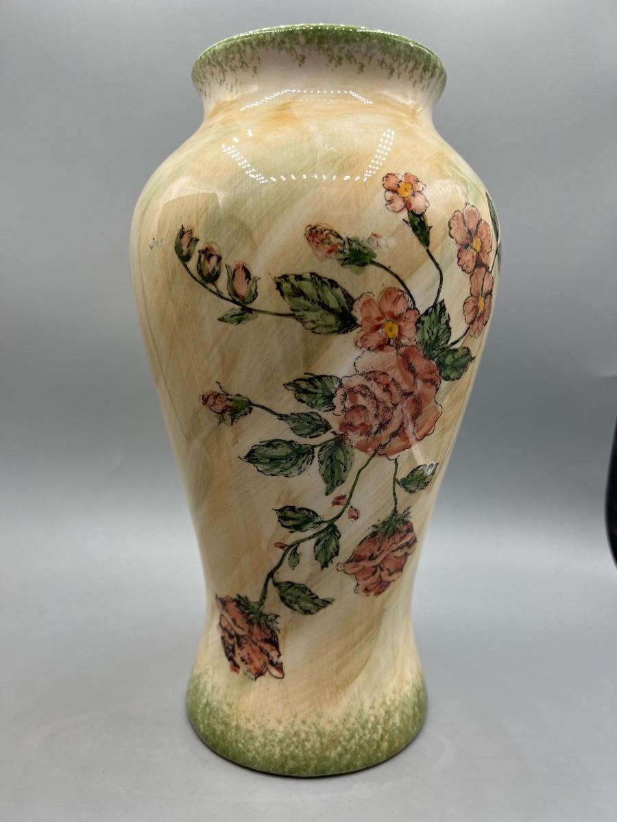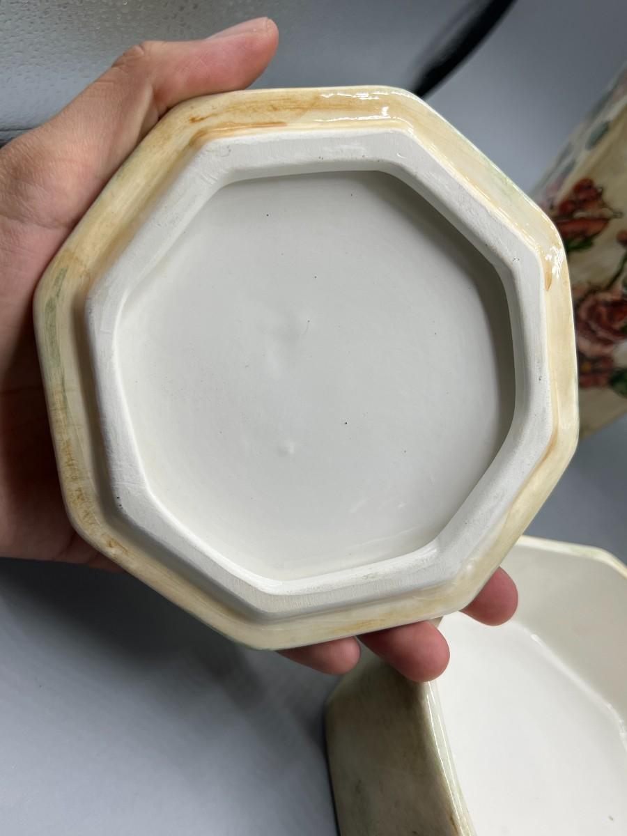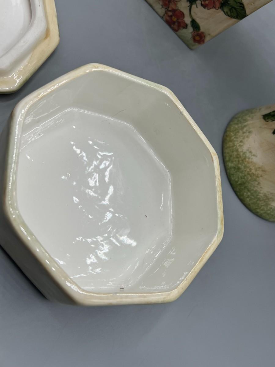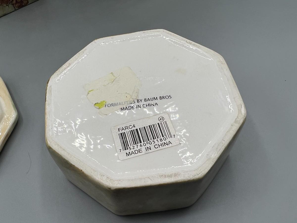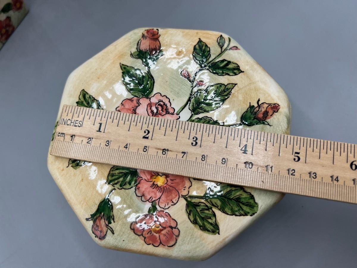 Formalities by Baum Bros. Three Piece Ceramic Decor Set Vases & Lidded Trinket Dish. Pink floral design. Pieces are matching pattern. Good condition.