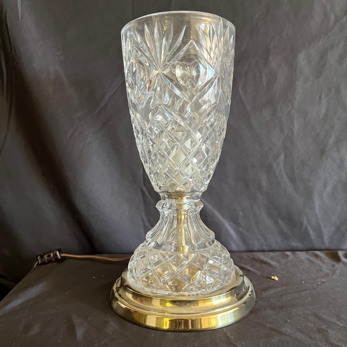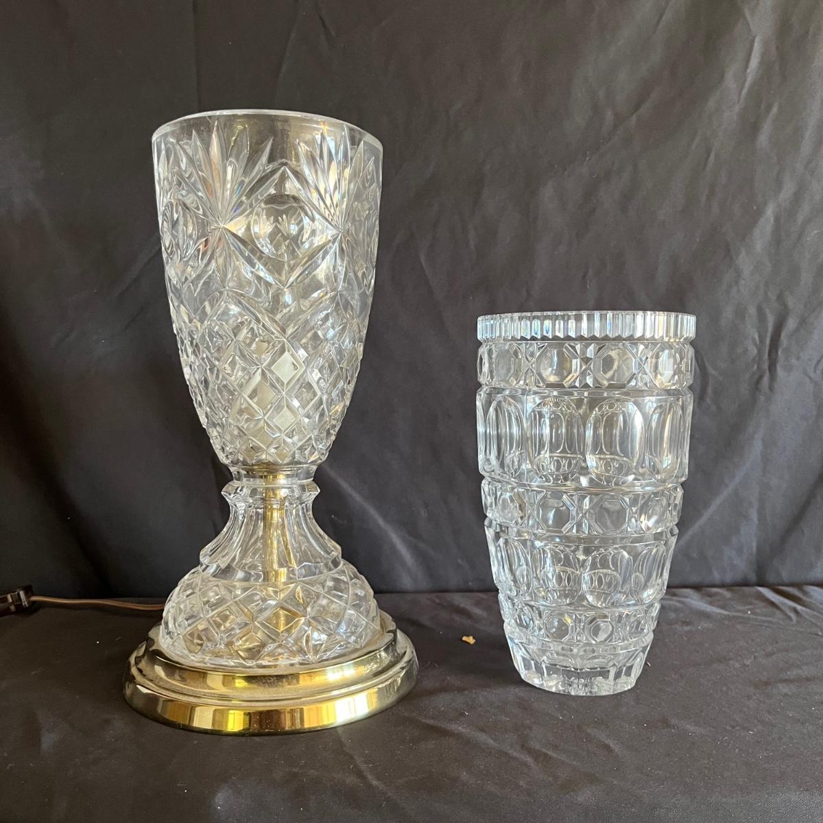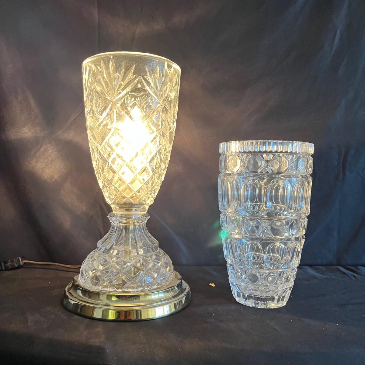 Lot includes a formed glass table lamp with inline switch and a formed glass vase. Lamp measures 6.5”D x 12”H.