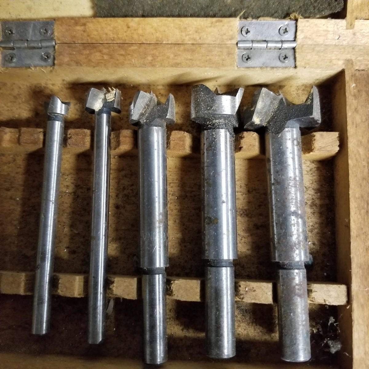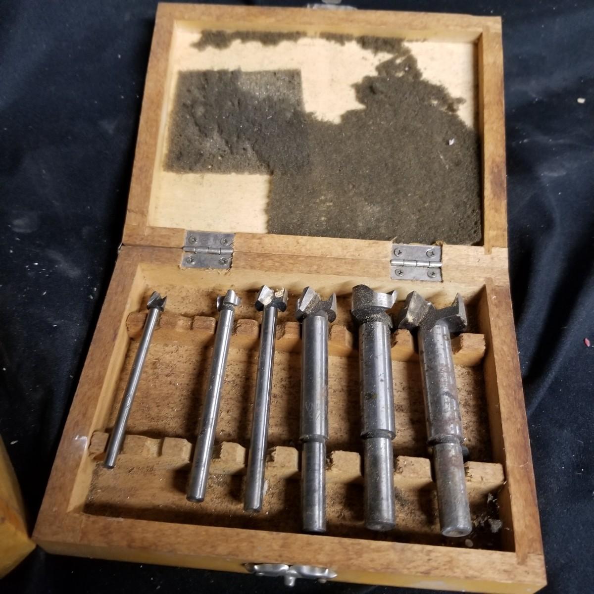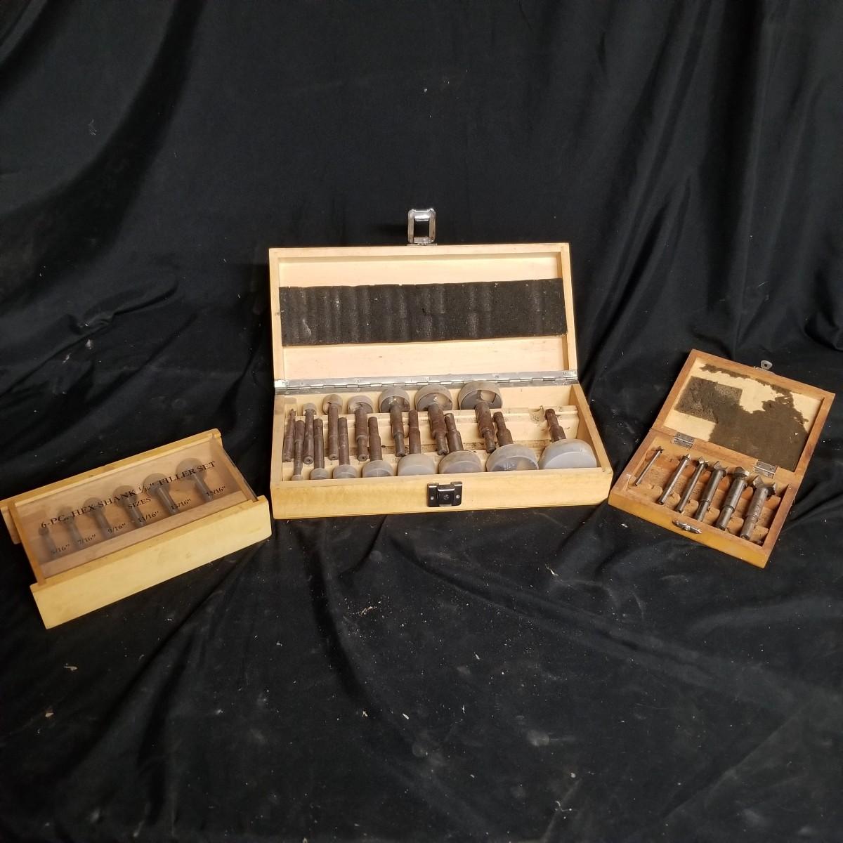 Three box sets of forstner bits.  Sizes range from 1/4" to 2" d.  Plastic safety caps on some.  Some duplication of sizes across the three sets. Twenty-seven total pieces. Some items show minor wear and rust, see photos. Shipping available.
